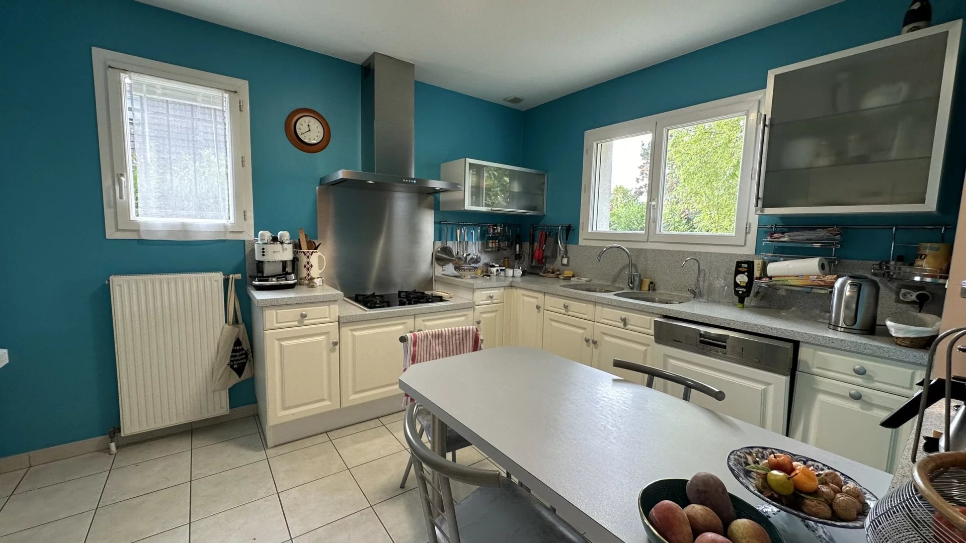 - Au rez-de-chaussée, d'une entrée avec placard, lingerie avec placard, séjour de 35 m² avec cheminée décorative, cuisine aménagée équipée (plaque, hotte, four et lave-vaisselle), cellier aménagé, 1 suite parentale avec salle de douche et WC séparés.
