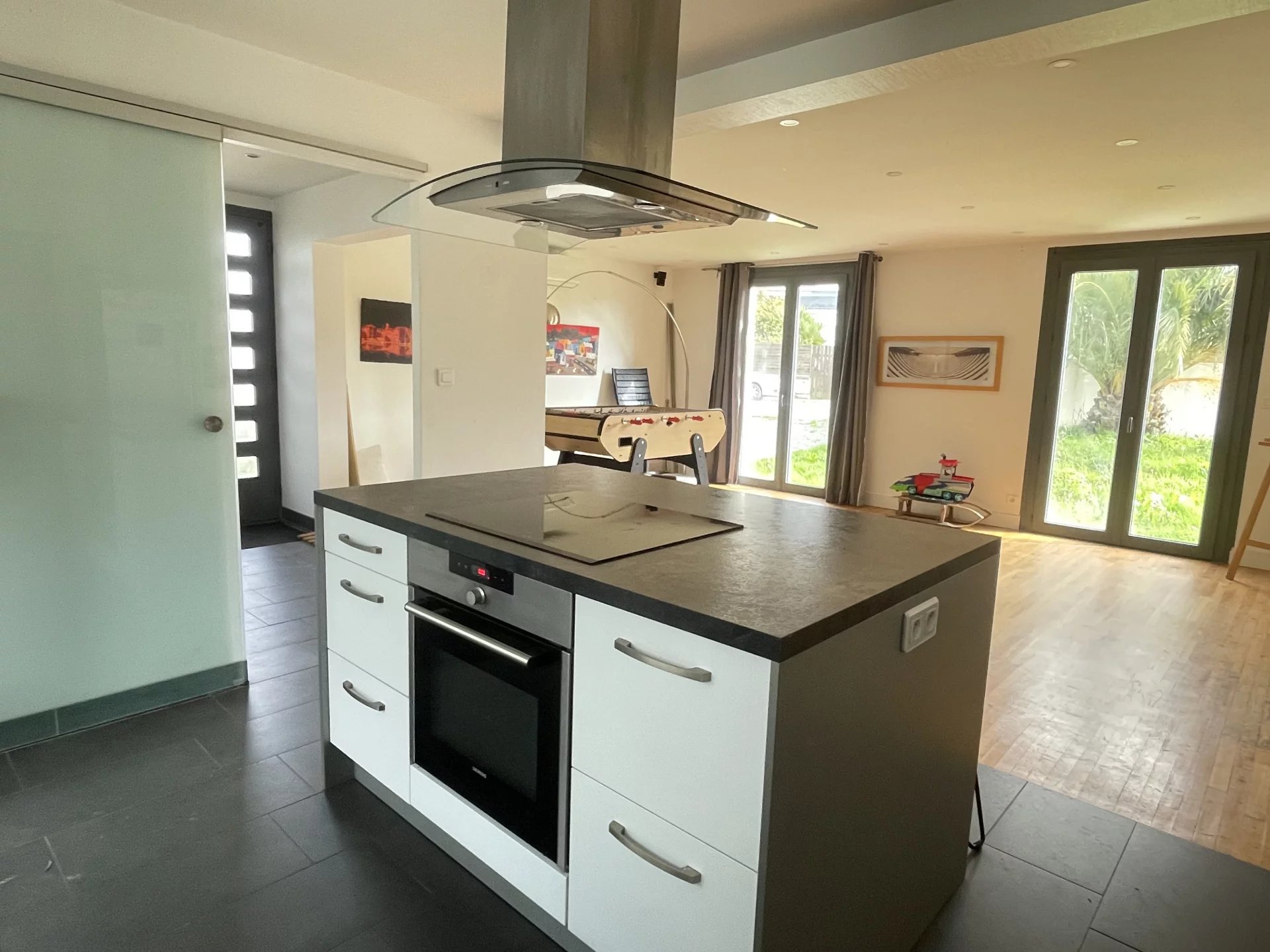 Vous avez au rez de chaussée, une entrée, un w-c avec lave mains séparé, un cellier, une cuisine aménagée et équipée ouverte sur la pièce de vie et un salon donnant sur une grande terrasse bois. Une chambre complète ce même niveau.