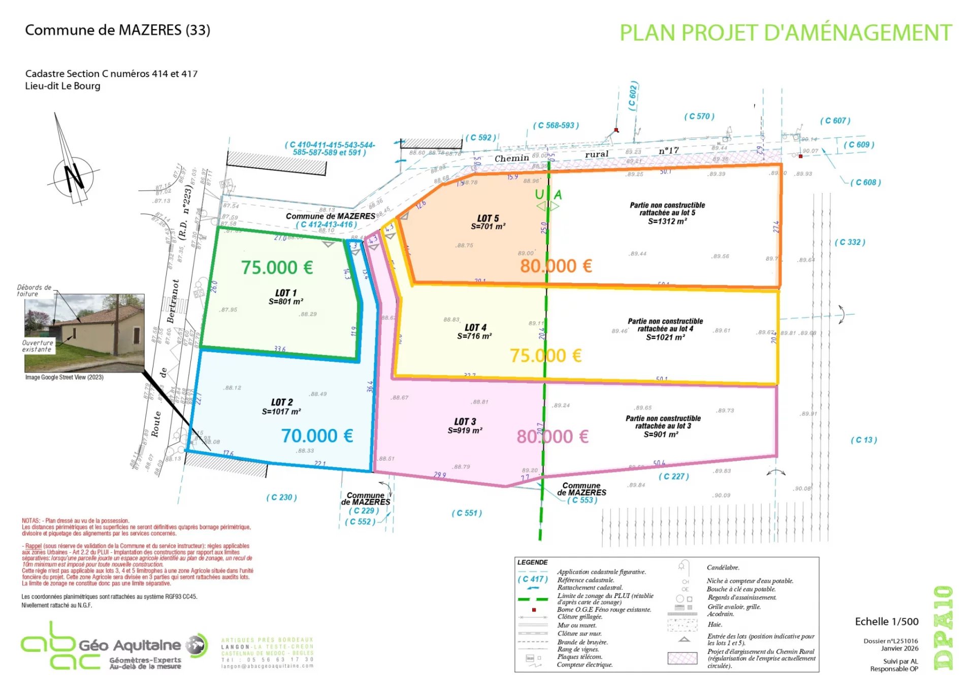 À Mazeres, idéalement situé dans le centre du village, terrain à bâtir de 2013 m2 (lot 5) dont 701 m2 en zone constructible.