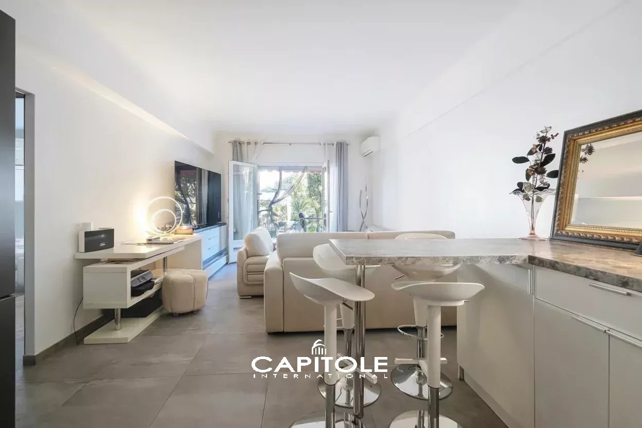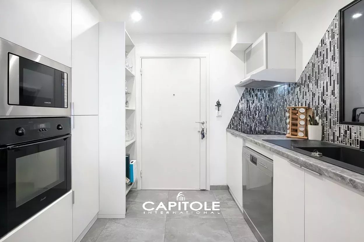 Entièrement rénové dans un style contemporain, l’appartement s’ouvre sur une entrée avec cuisine équipée ouverte, prolongée par un séjour lumineux bénéficiant d’un accès direct à la terrasse et au jardin.