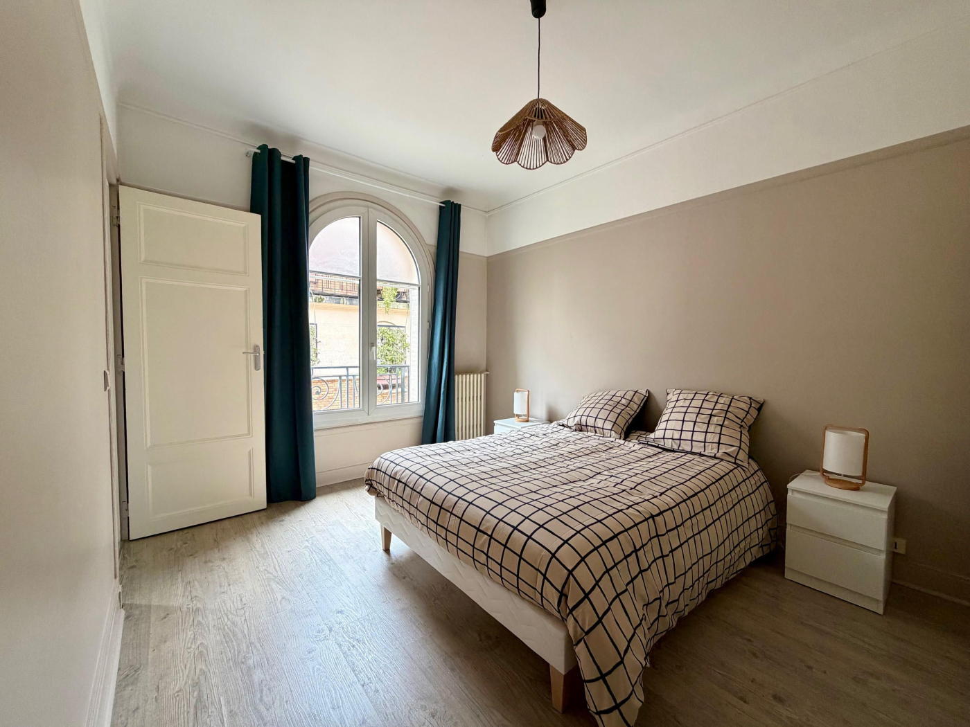 Un appartement deux pièces, loué meublé, composé d'une entrée desservant un séjour, une chambre avec sa salle de bains, une cuisine meublée et équipée, des WC séparés et un dressing.