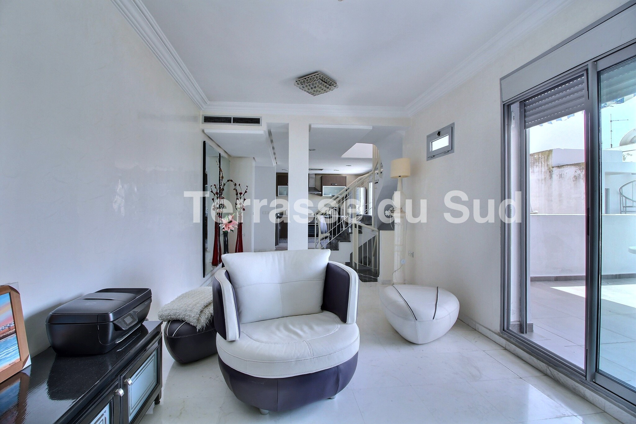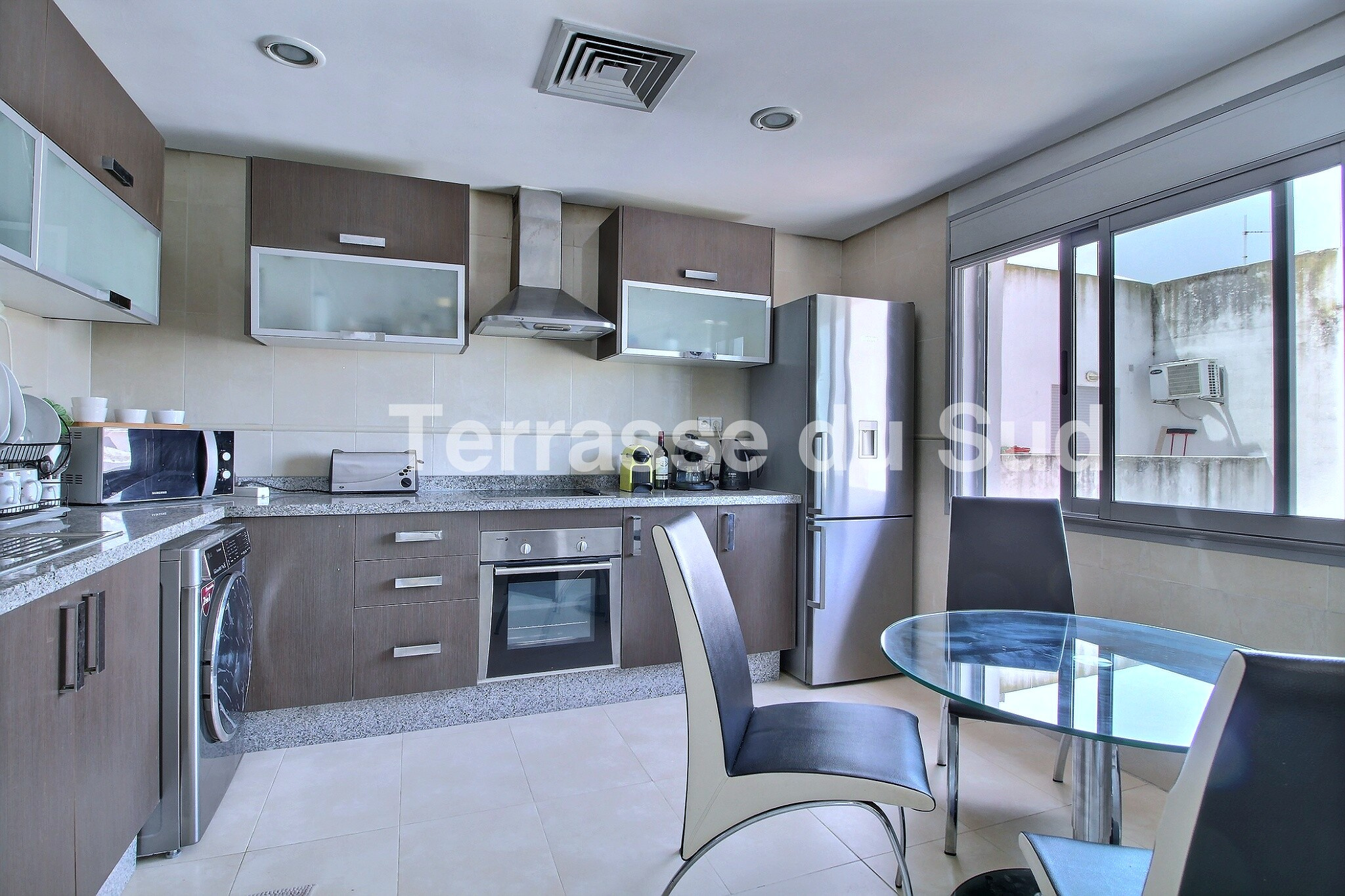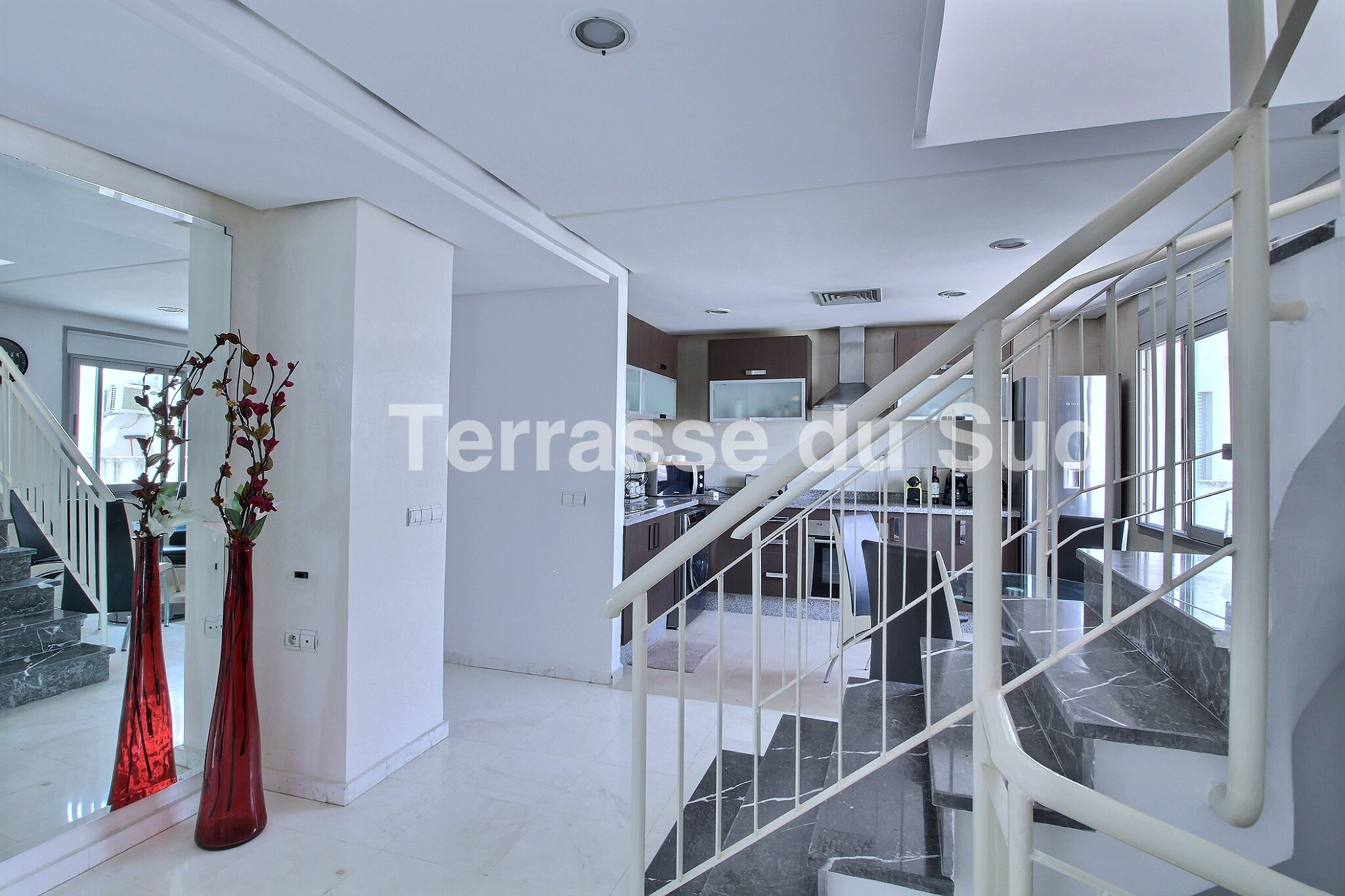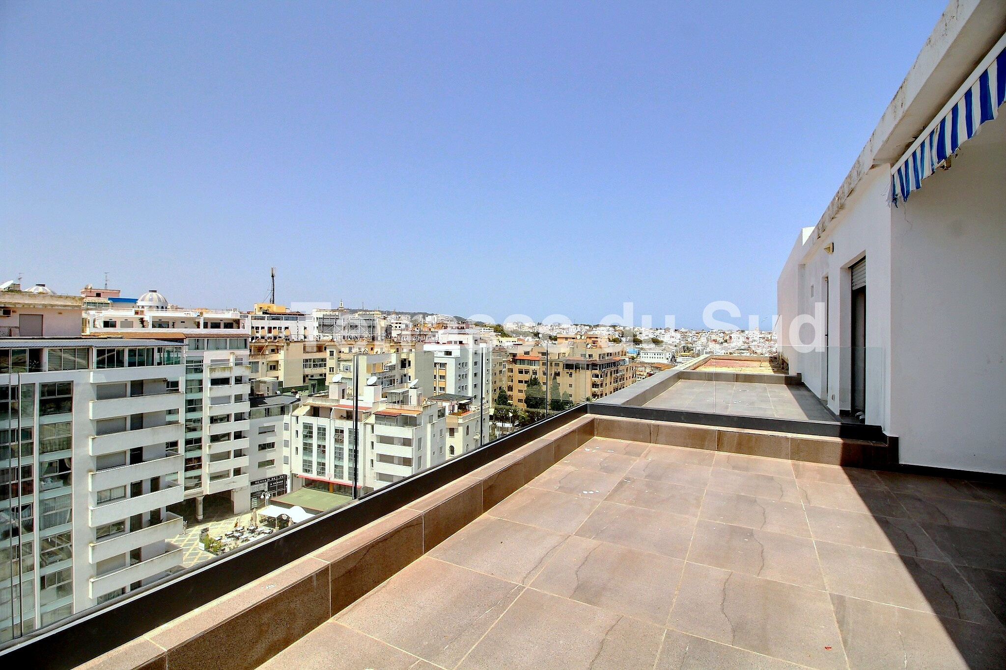 On the top floors (8th and 9th), this splendid duplex is located between the Medina and the Marina. In the heart of town, it is close to shops, restaurants, the beach and a few minutes from the airport by taxi. It is located in a secure and guarded condominium with swimming pool. On the first level, there is a large entrance with large closets, a large bedroom with its private balcony of approximately 17m2 (view of the Medina) as well as a bathroom with toilet. Upstairs is theliving room of approximately 39m2 with its open kitchen and a second balcony of 23m2, a master bedroom of 16m2 with a third balcony of 22m2 offering a magnificent Sea View (over the Marina and the Strait of Gibraltar ) as well as a bathroom with toilet. A staircase gives access to the splendid rooftop terrace of 65m2 which offers a panoramic view of the Medina, the Marina, the beaches etc... The condominium charges are around 120 euros per month (cold water, permanent caretaker, building service staff, elevator, maintenance, swimming pool, etc.). A parking space in the basement and a common swimming pool open in summer complete the package. The property tax amounts to approximately 1,000 euros per year. Double glazing and air conditioning (cooling and heating).