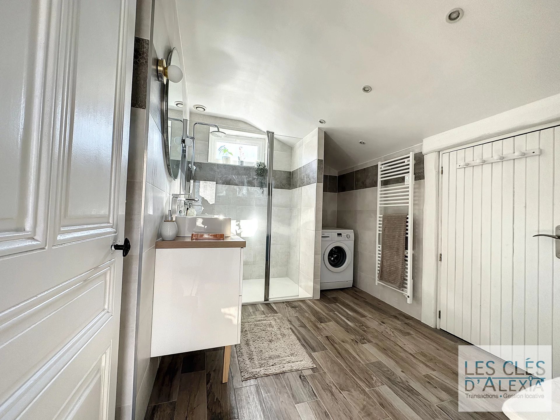 La salle d'eau moderne comprend une douche à l'italienne, des placards et un emplacement pour la machine à laver ainsi qu'un espace rangement pratique.