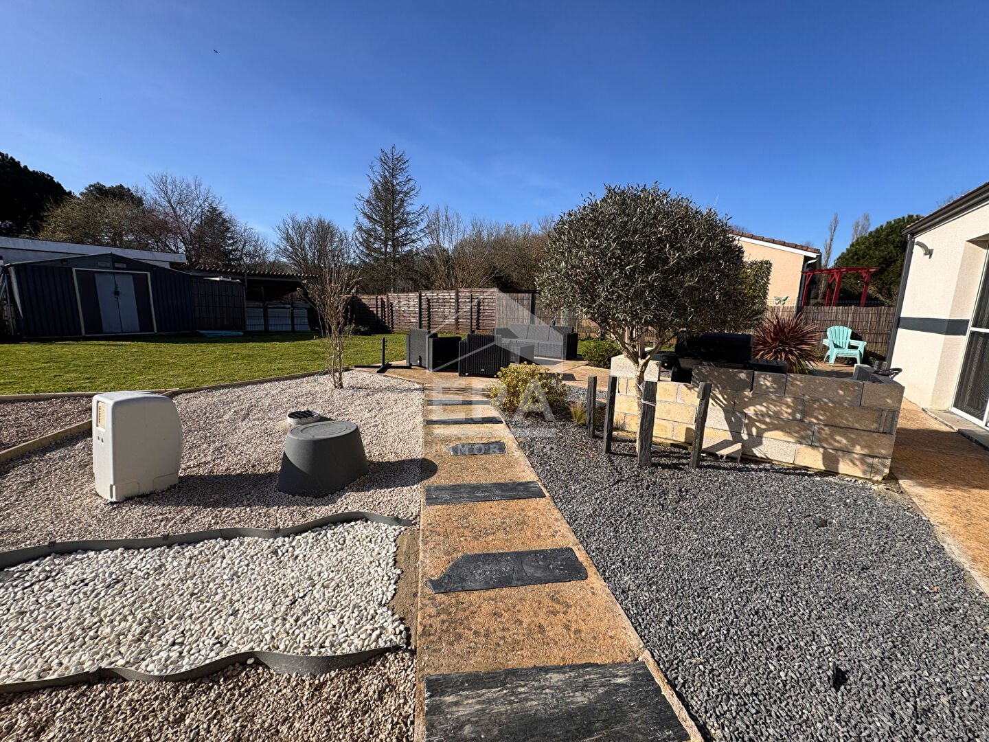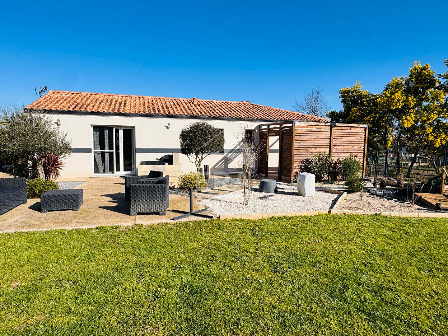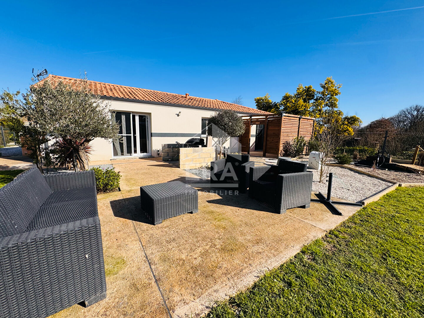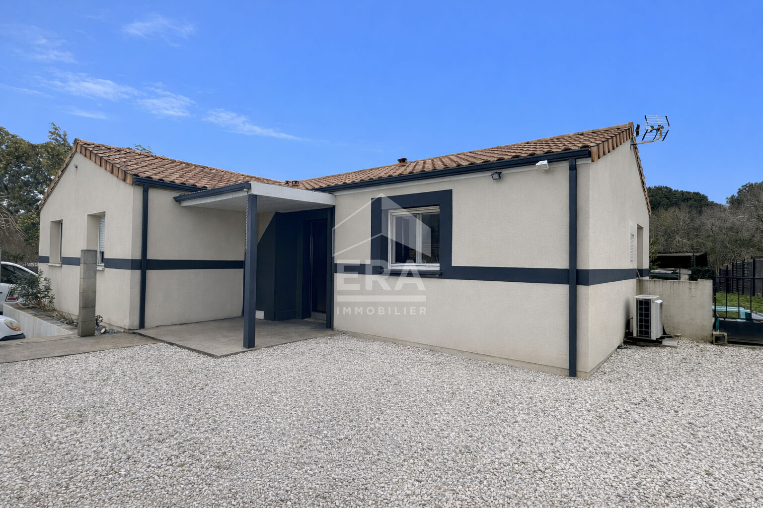 A vendre à Tizac-de-Lapouyade, découvrez cette agréable maison récente de plain-pied d'environ 95 m², située dans un environnement calme et agréable. Construite en 2018, elle se compose d'une cuisine aménagée et équipée, d'un cellier, de 4 chambres, d'une salle d'eau et d'un WC indépendant. Le confort est assuré par un système de chauffage à air pulsé avec climatisation réversible, complété par des radiateurs électriques. La production d'eau chaude est assurée par un ballon électrique. Les menuiseries en PVC double vitrage et les volets roulants électriques apportent isolation et praticité au quotidien. Implantée sur un terrain de 897 m², la maison bénéficie d'un bel espace extérieur comprenant une terrasse, un jardin, un espace parking et un cabanon. Elle est également équipée de la fibre optique et de panneaux solaires, un véritable atout en termes de confort et d'économies d'énergie. A proximité des commodités, vous trouverez une école maternelle accessible facilement. La garderie ainsi que le transport scolaire en bus sont gratuits, un avantage appréciable pour les familles. Pour plus d'informations ou organiser une visite, contactez ERA IMMO BOURG au 05 57 68 35 82.. (5.78 % honoraires TTC à la charge de l'acquéreur.)