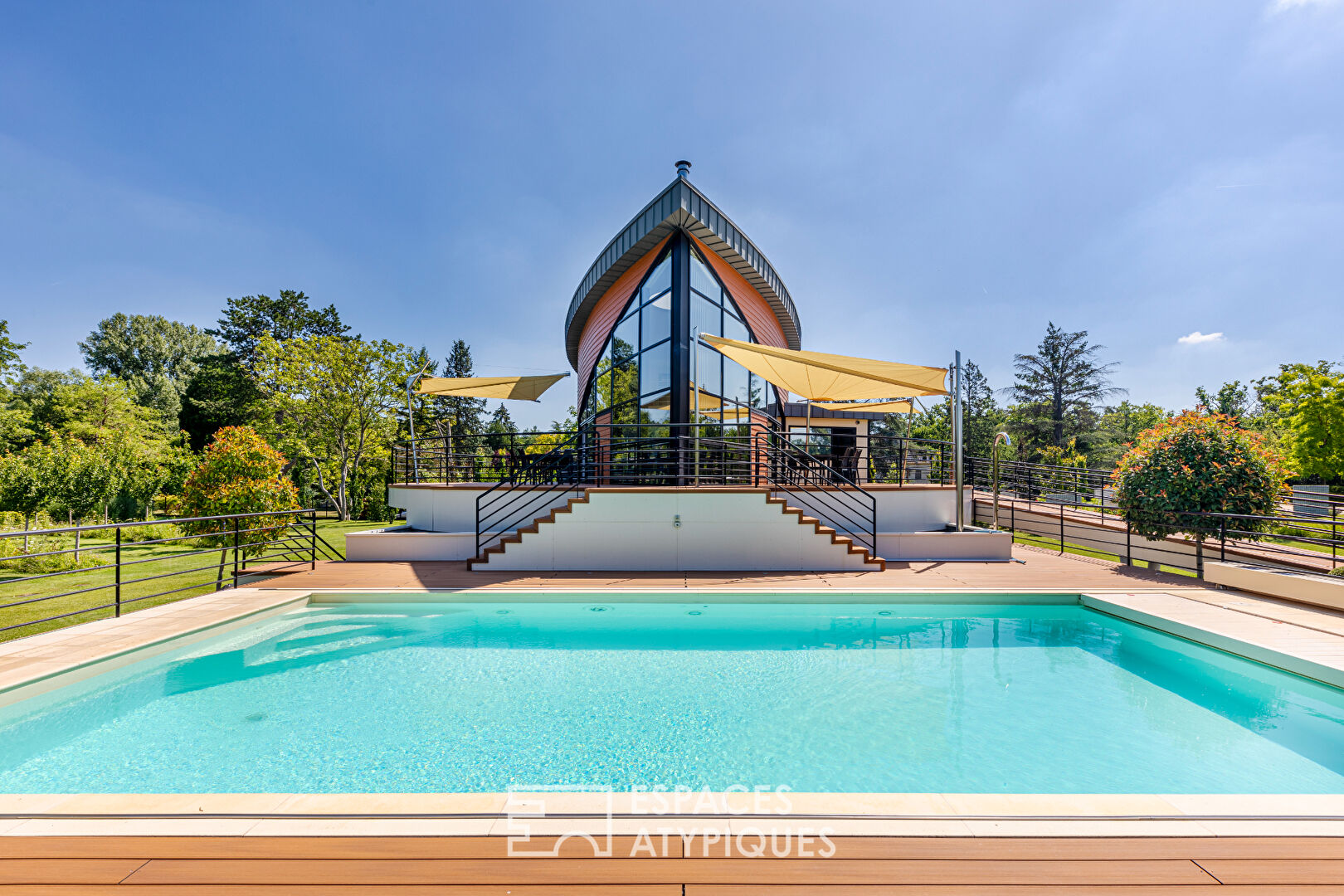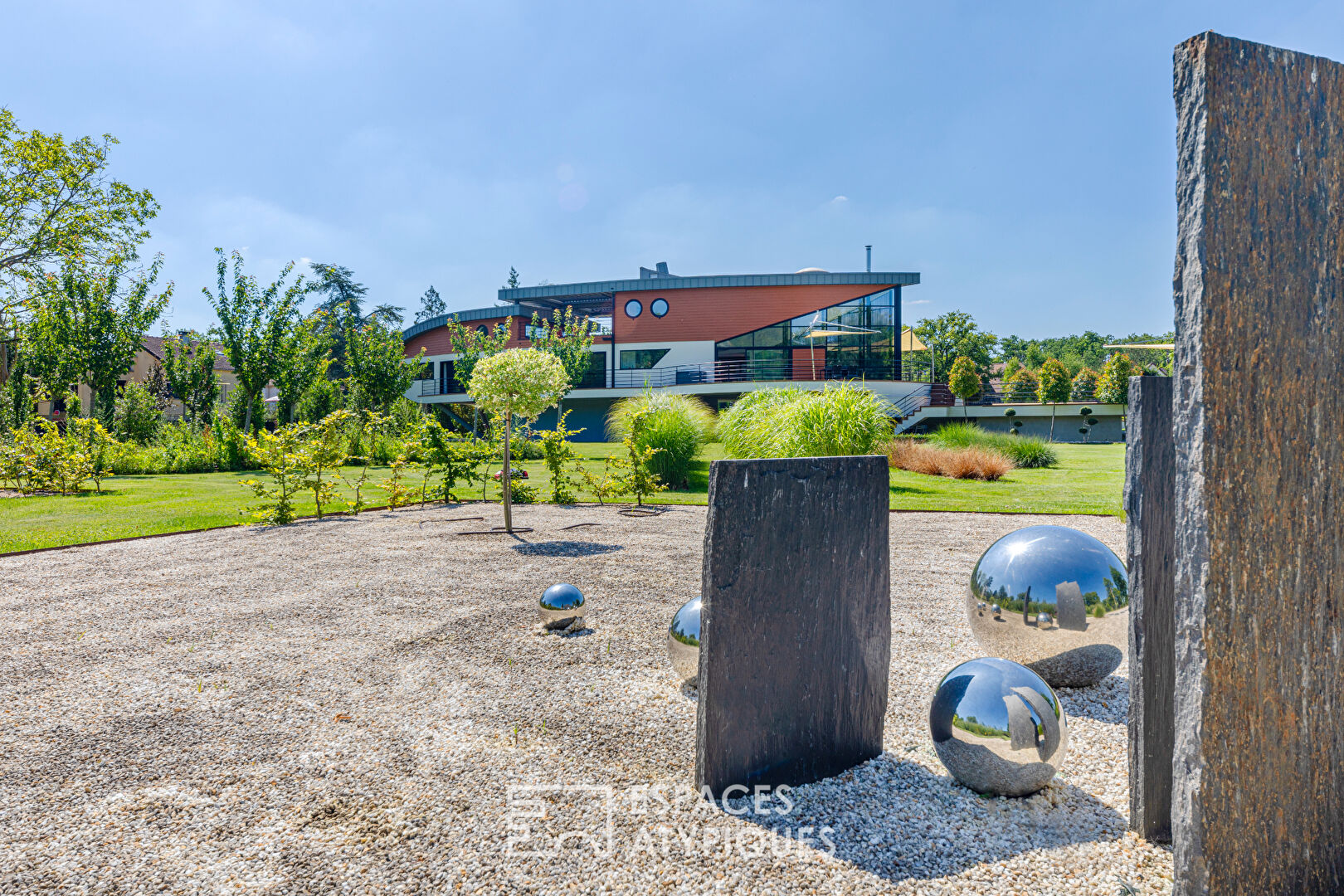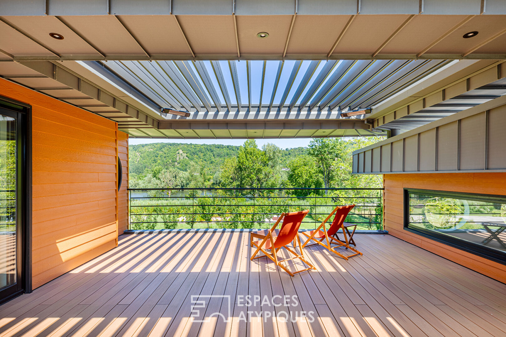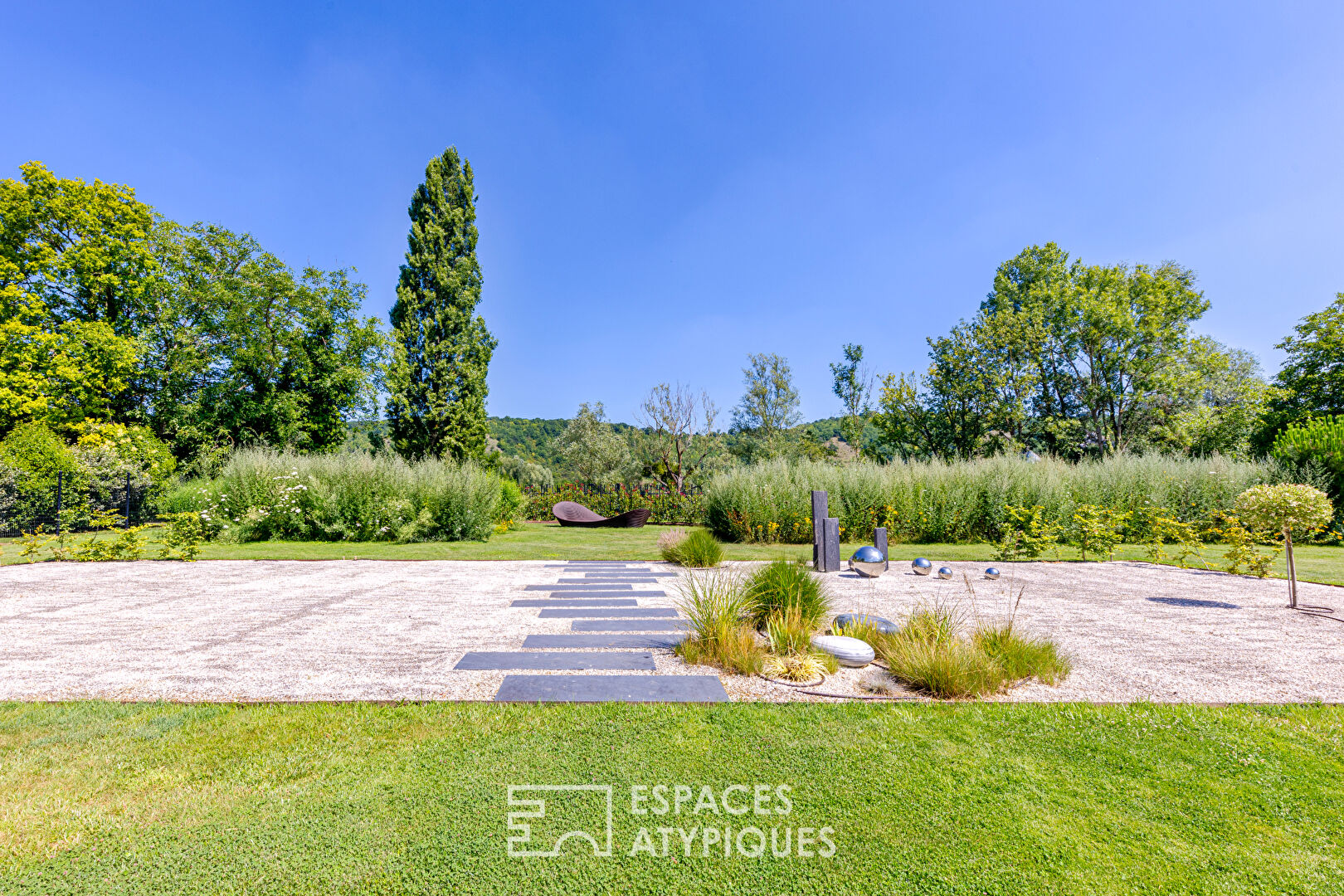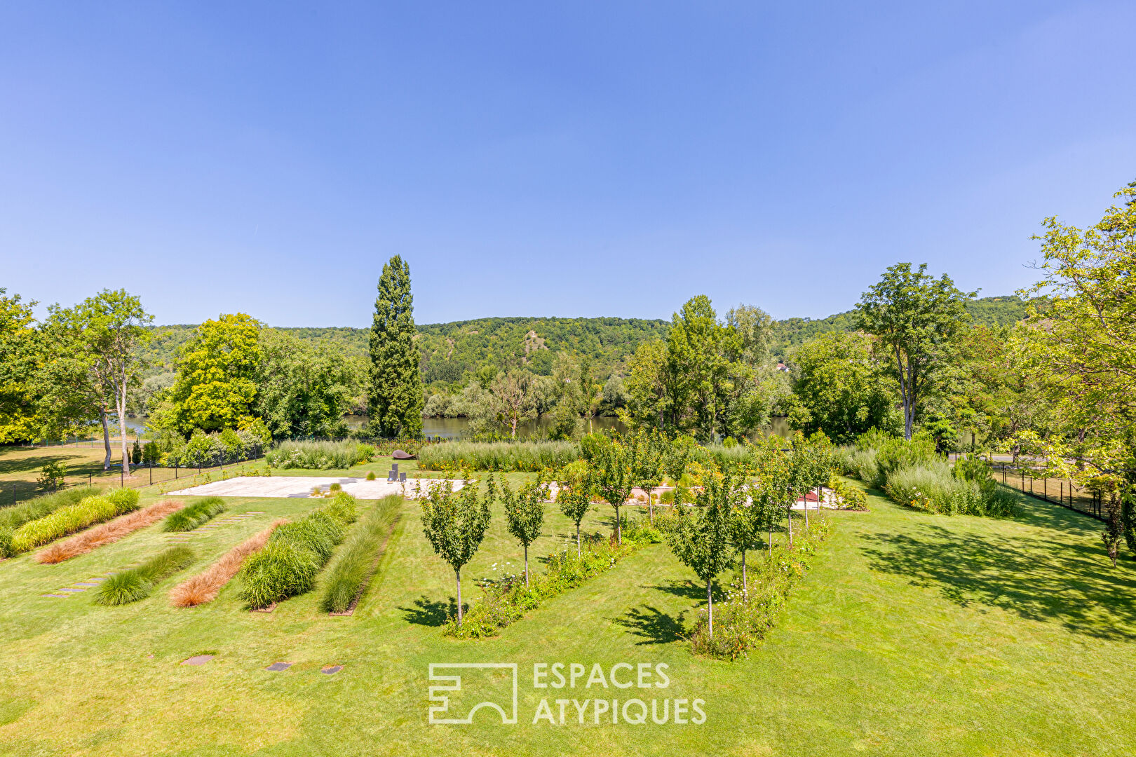 Au coeur des Boucles de Seine et de ses typiques falaises de calcaire, cette maison d'architecte est en symbiose avec le paysage fluvial et ses bateaux qui longent la propriété. Par sa forme allongée, elle capte la lumière unique du lieu, berceau de l'Impressionnisme. Elle s'affranchit de toute frontière visuelle grâce à son mur rideau ainsi que ses larges baies et est résolument tournée vers le jardin paysagé. Ses quatre terrasses révèlent des ambiances toutes différentes les unes des autres sous l'hospice de voiles d'ombrage et de pergola bioclimatique. Sa piscine et son terrain de boules lui confèrent une allure de maison de vacances toute l'année que ne contrediront pas le Golf et la Base de Loisirs du village, pas plus que l'immense forêt classée Natura 2000 environnante. A proximité, se dresse le Château de la Roche Guyon que l'on découvre depuis le salon. L'intérieur de la maison se découvre grâce à un chemin "passerelle" de 9 m de long, qui permet d'admirer en prenant de la hauteur, le jardin paysagé, la piscine ainsi que les différents niveaux de terrasses. L'entrée distribue tous les espaces de vie : à la proue, se découvre le sublime salon cathédral. La cuisine dinatoire, avec cellier, se ressent comme le coeur battant de la maison et, au dessus, la salle à manger domine les lieux et donne accès à la terrasse solarium, à l'abri des regards et du vent. A bâbord, se distribuent les chambres, toutes bénéficiant de leur salle d'eau privative : une première de 17,40 m² ayant la particularité d'être communicante avec un bureau pouvant faire office de chambre supplémentaire de 16,20 m². La deuxième avec sa mezzanine de 33,60 m² . La grande suite parentale de 37,5 m² avec dressing ouvrant sur une magnifique salle de bain, avec douche. La large baignoire faisant office de la poupe de ce magnifique paquebot ! La maison bénéficie de 569 m² de terrasse dont 213 m² couvertes en rez de jardin, 174 m² au niveau du rez-de-chaussée de la maison et de la piscine sans oublier le solarium de 56m². A l'extérieur, on admire le paysage au bord d'une piscine de 5x10 m, chauffée par pompe à chaleur et , et sa douche . L'ombrage de la piscine et des terrasses supérieures est assuré par 4 voiles d'ombrage motorisées. Le jardin de 6797 m² longe le chemin de halage en bord de Seine et comprend un terrain de boules et balançoire de 185 m², un jardin japonais de 185 m² et une jachère fleurie de 402 m². 3 robots entretiennent ce jardin et sa mise en lumière est gérée par domotique. Un abri de jardin avec auvent de stockage, un garage double couvert et stationnement de 2 véhicules supplémentaires complètent les prestations très nombreuses de ce bien hors-norme. Chauffage par pompe à chaleur - Ecole élémentaire dans le village - Collèges/et Lycées, privés à 20 mn ( Vernon et Mantes la Jolie); - A proximité : La Roche Guyon et Giverny - Autoroute A13 pour accès A14 en 10 minutes en voiture - Ligne J Mantes la Jolie à 9km ( TER vers Paris St-Lazare en 40 minutes) - Arrivée du RER Eole à Mantes la Jolie en 2024.( desservant La Défense et la Gare St Lazare). CLASSE ENERGIE : C / CLASSE CLIMAT : A Montant moyen estimé des dépenses annuelles d'énergie pour un usage standard, établi à partir des prix de l'énergie de l'année 2021 : entre 1740 euros et 2410 euros Contact : Julie 07 77 84 74 57 Julie VALODE RAUBER (EI) Agent Commercial - Numéro RSAC : 894 542 950 - Versailles.