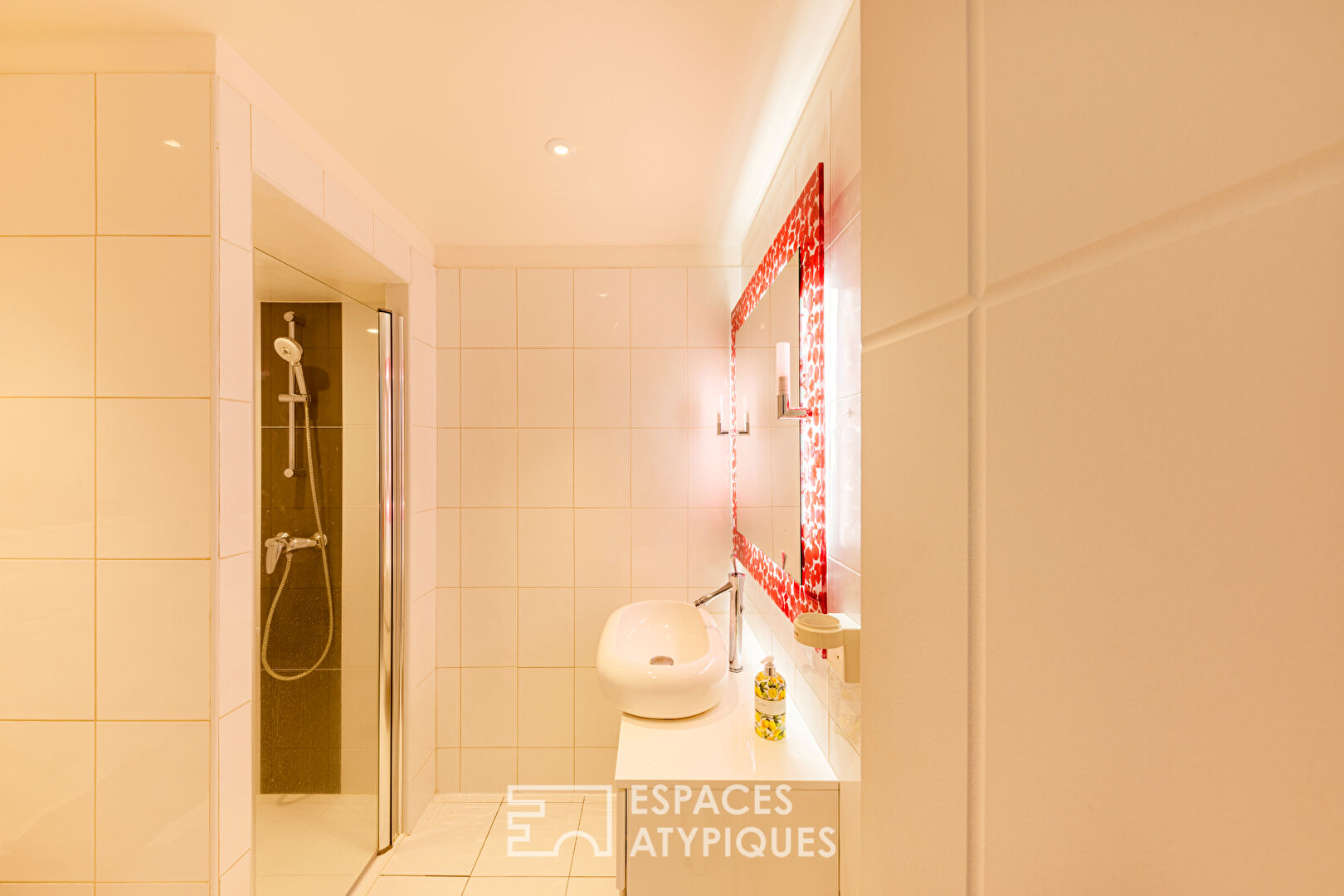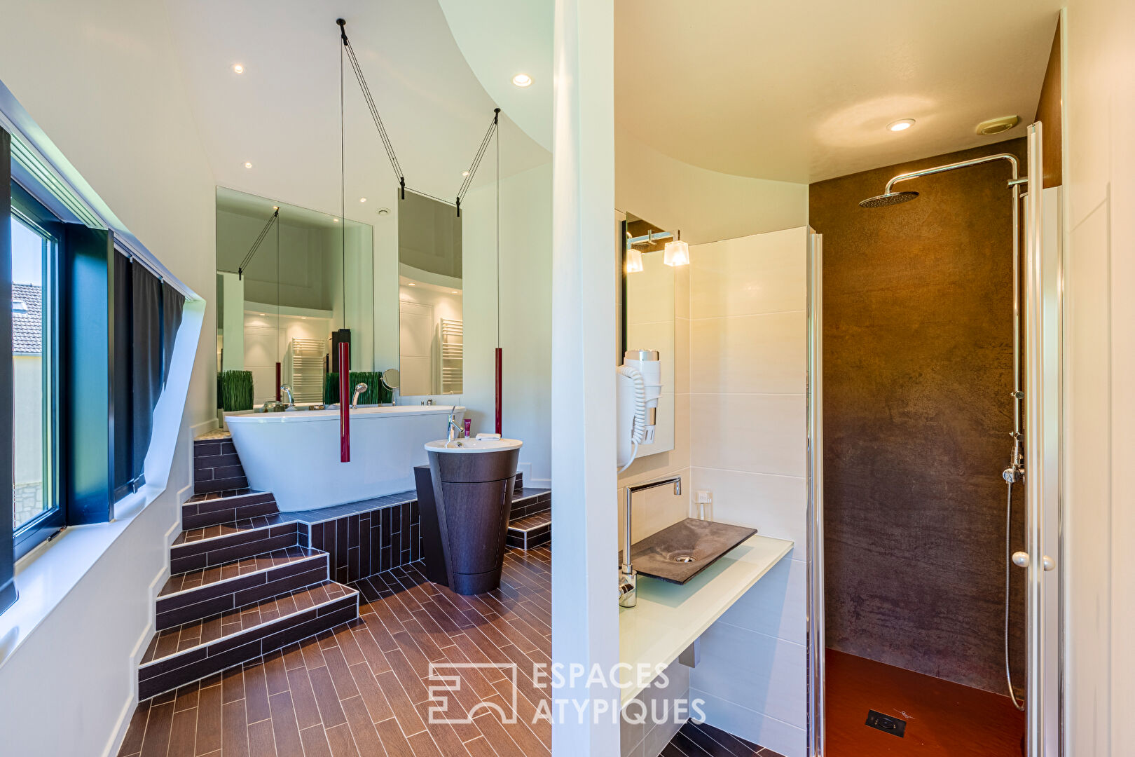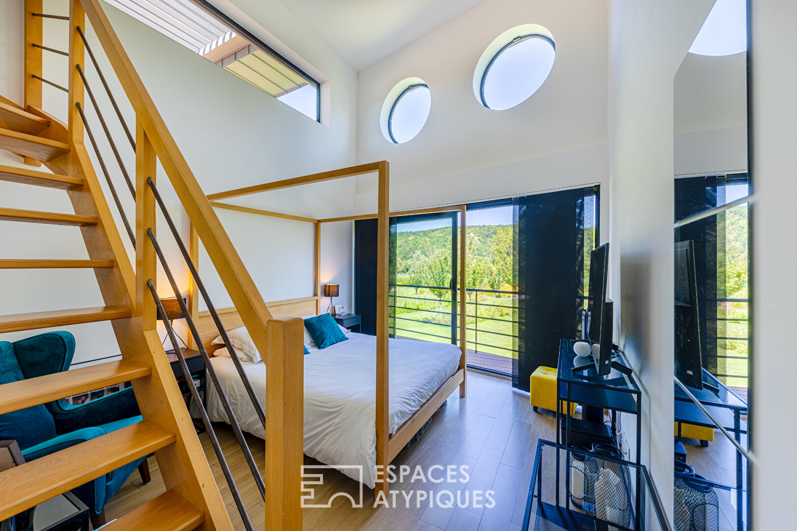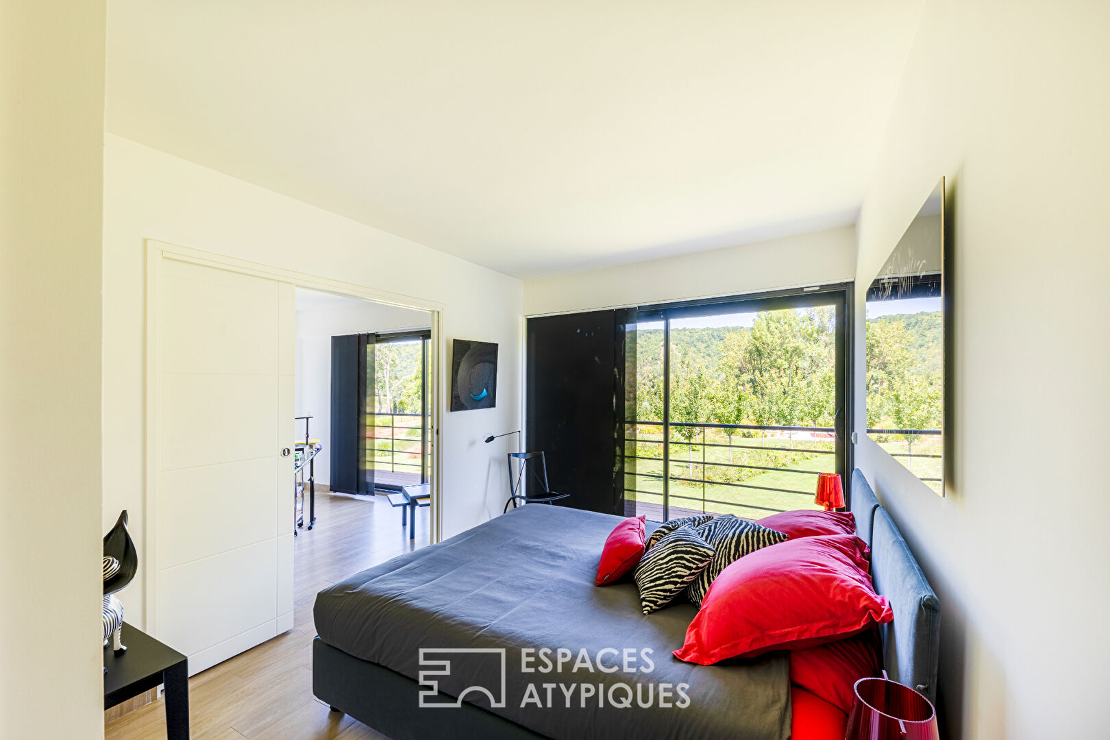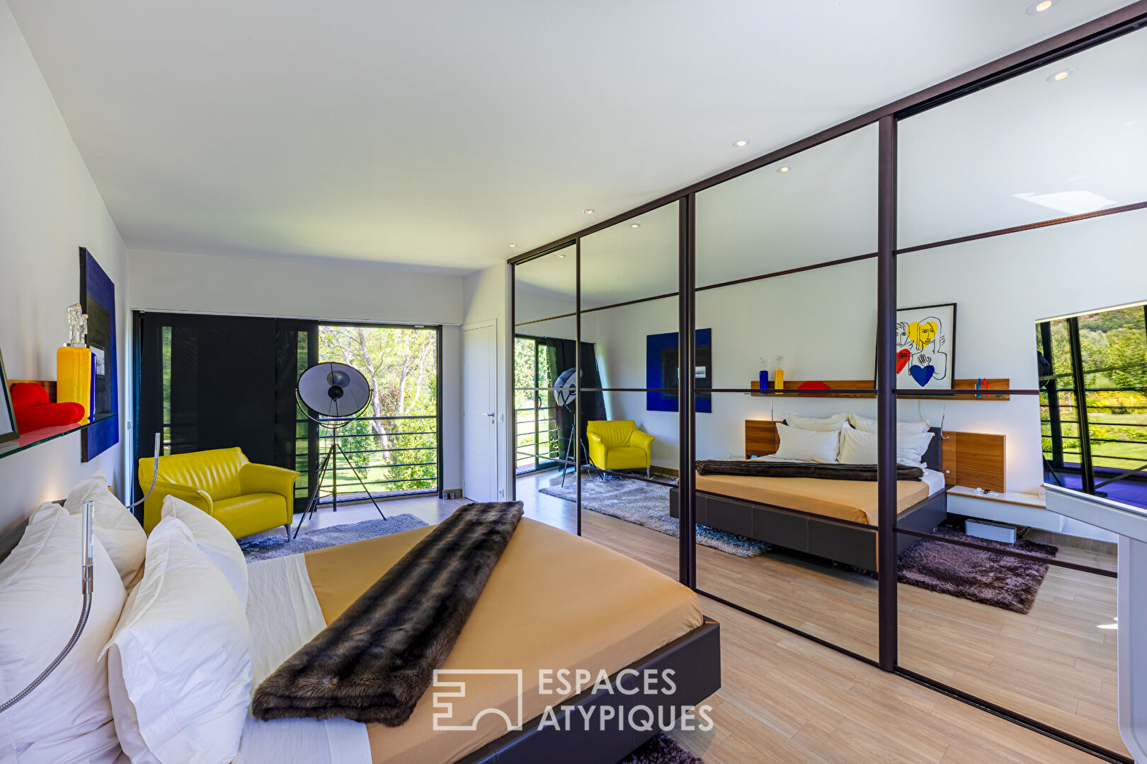 Au coeur des Boucles de Seine et de ses typiques falaises de calcaire, cette maison d'architecte est en symbiose avec le paysage fluvial et ses bateaux qui longent la propriété. Par sa forme allongée, elle capte la lumière unique du lieu, berceau de l'Impressionnisme. Elle s'affranchit de toute frontière visuelle grâce à son mur rideau ainsi que ses larges baies et est résolument tournée vers le jardin paysagé. Ses quatre terrasses révèlent des ambiances toutes différentes les unes des autres sous l'hospice de voiles d'ombrage et de pergola bioclimatique. Sa piscine et son terrain de boules lui confèrent une allure de maison de vacances toute l'année que ne contrediront pas le Golf et la Base de Loisirs du village, pas plus que l'immense forêt classée Natura 2000 environnante. A proximité, se dresse le Château de la Roche Guyon que l'on découvre depuis le salon. L'intérieur de la maison se découvre grâce à un chemin "passerelle" de 9 m de long, qui permet d'admirer en prenant de la hauteur, le jardin paysagé, la piscine ainsi que les différents niveaux de terrasses. L'entrée distribue tous les espaces de vie : à la proue, se découvre le sublime salon cathédral. La cuisine dinatoire, avec cellier, se ressent comme le coeur battant de la maison et, au dessus, la salle à manger domine les lieux et donne accès à la terrasse solarium, à l'abri des regards et du vent. A bâbord, se distribuent les chambres, toutes bénéficiant de leur salle d'eau privative : une première de 17,40 m² ayant la particularité d'être communicante avec un bureau pouvant faire office de chambre supplémentaire de 16,20 m². La deuxième avec sa mezzanine de 33,60 m² . La grande suite parentale de 37,5 m² avec dressing ouvrant sur une magnifique salle de bain, avec douche. La large baignoire faisant office de la poupe de ce magnifique paquebot ! La maison bénéficie de 569 m² de terrasse dont 213 m² couvertes en rez de jardin, 174 m² au niveau du rez-de-chaussée de la maison et de la piscine sans oublier le solarium de 56m². A l'extérieur, on admire le paysage au bord d'une piscine de 5x10 m, chauffée par pompe à chaleur et , et sa douche . L'ombrage de la piscine et des terrasses supérieures est assuré par 4 voiles d'ombrage motorisées. Le jardin de 6797 m² longe le chemin de halage en bord de Seine et comprend un terrain de boules et balançoire de 185 m², un jardin japonais de 185 m² et une jachère fleurie de 402 m². 3 robots entretiennent ce jardin et sa mise en lumière est gérée par domotique. Un abri de jardin avec auvent de stockage, un garage double couvert et stationnement de 2 véhicules supplémentaires complètent les prestations très nombreuses de ce bien hors-norme. Chauffage par pompe à chaleur - Ecole élémentaire dans le village - Collèges/et Lycées, privés à 20 mn ( Vernon et Mantes la Jolie); - A proximité : La Roche Guyon et Giverny - Autoroute A13 pour accès A14 en 10 minutes en voiture - Ligne J Mantes la Jolie à 9km ( TER vers Paris St-Lazare en 40 minutes) - Arrivée du RER Eole à Mantes la Jolie en 2024.( desservant La Défense et la Gare St Lazare). CLASSE ENERGIE : C / CLASSE CLIMAT : A Montant moyen estimé des dépenses annuelles d'énergie pour un usage standard, établi à partir des prix de l'énergie de l'année 2021 : entre 1740 euros et 2410 euros Contact : Julie 07 77 84 74 57 Julie VALODE RAUBER (EI) Agent Commercial - Numéro RSAC : 894 542 950 - Versailles.