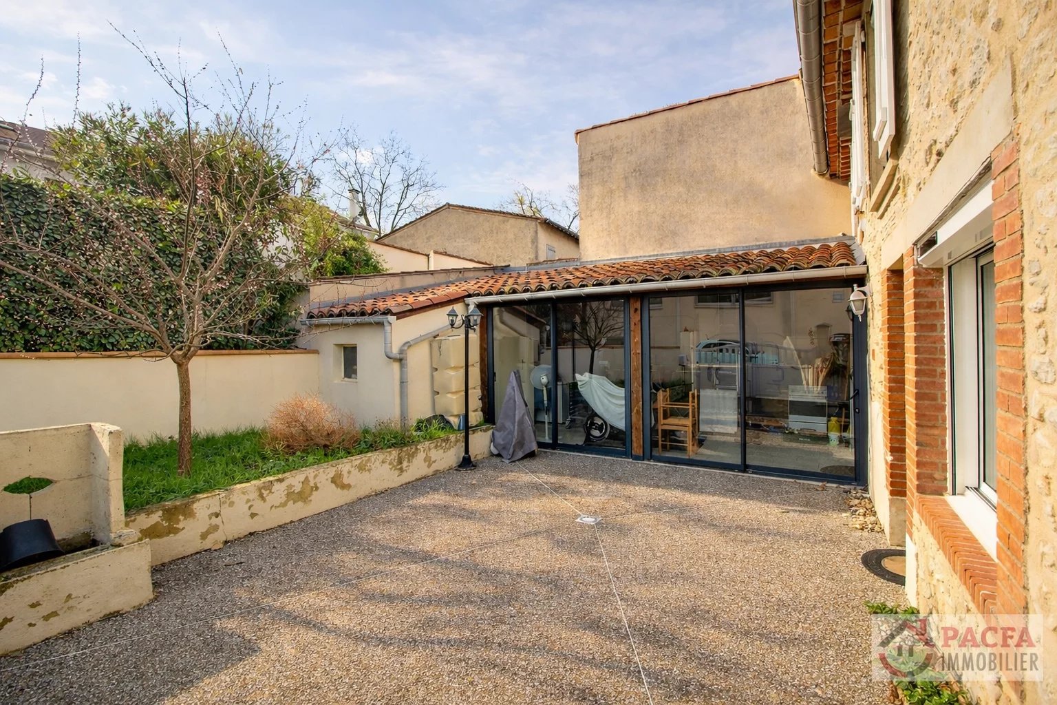 À l’extérieur, une terrasse avec petit espace jardinet prolonge agréablement les espaces de vie. Le stationnement est facile et gratuit dans la rue, et un portail motorisé permet également de rentrer un véhicule dans la cour si besoin.