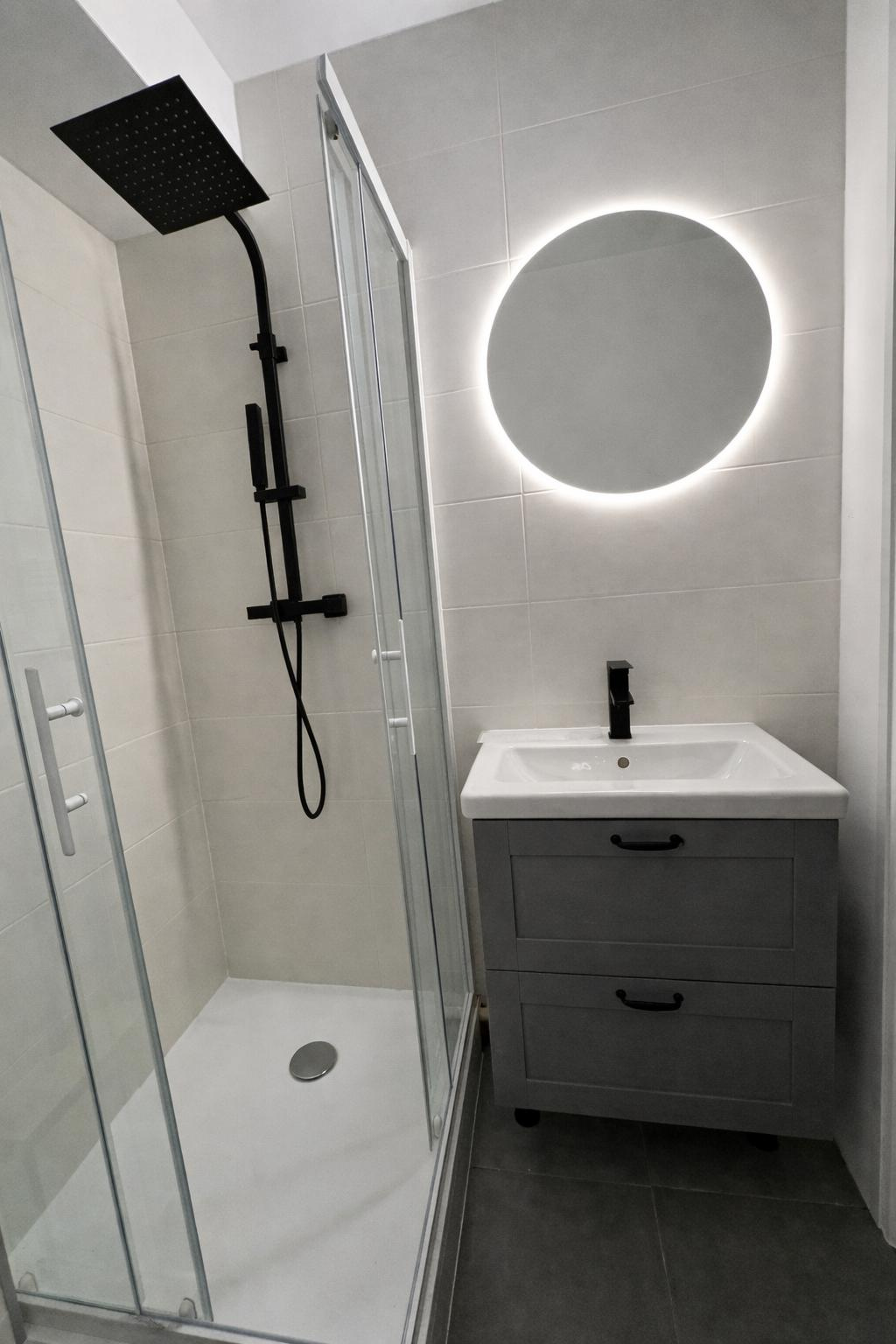 - une salle d'eau-WC neuve avec cabine douche, meuble vasque avec miroir, WC suspendu et chauffe-eau neuf !