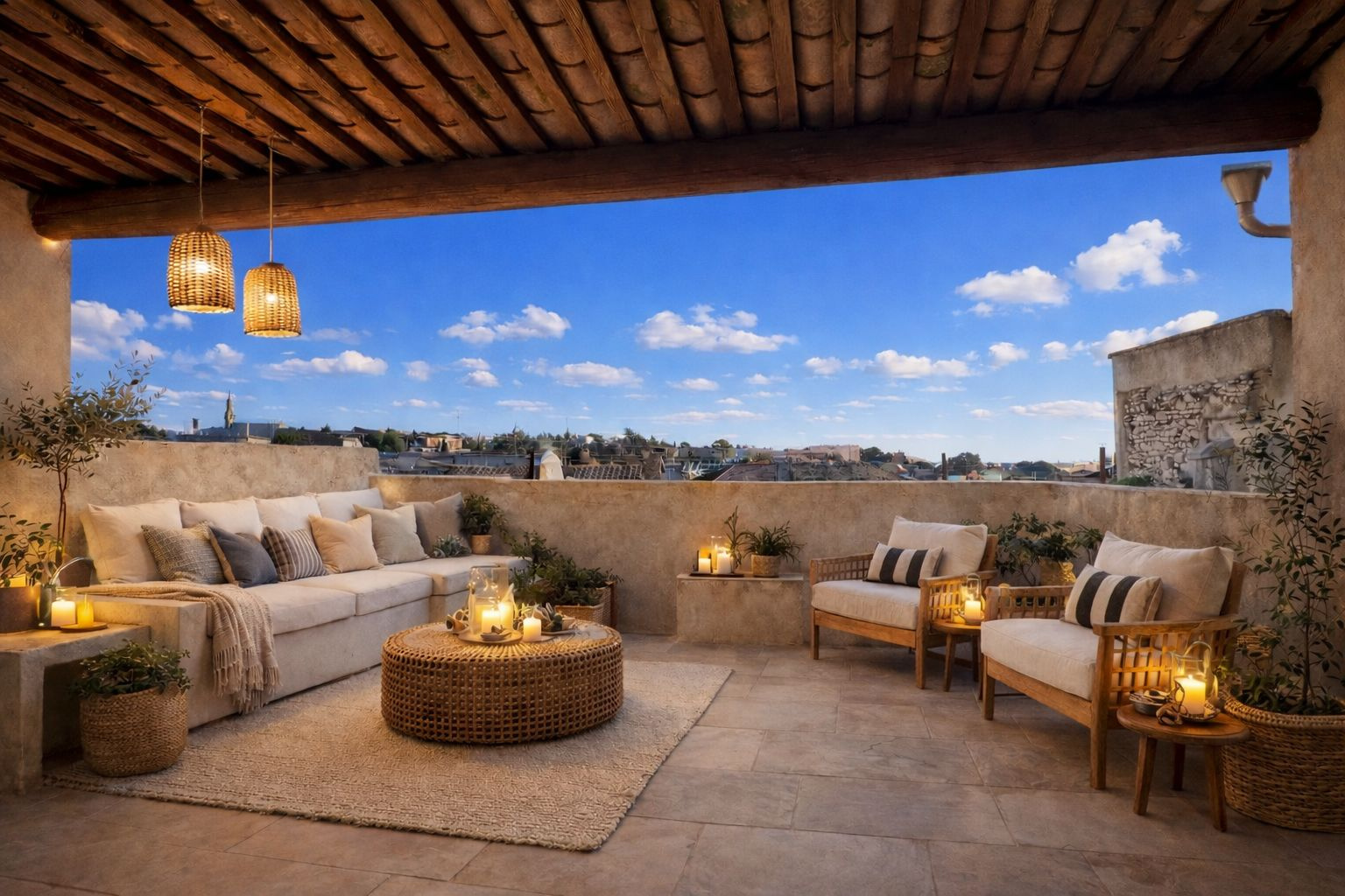 À l'extérieur, une superbe terrasse de 34 m2, sans vis-à-vis, offre une vue dégagée sur Nîmes. Un espace est déjà prévu pour l'installation d'une cuisine d'été, idéal pour profiter pleinement des beaux jours.