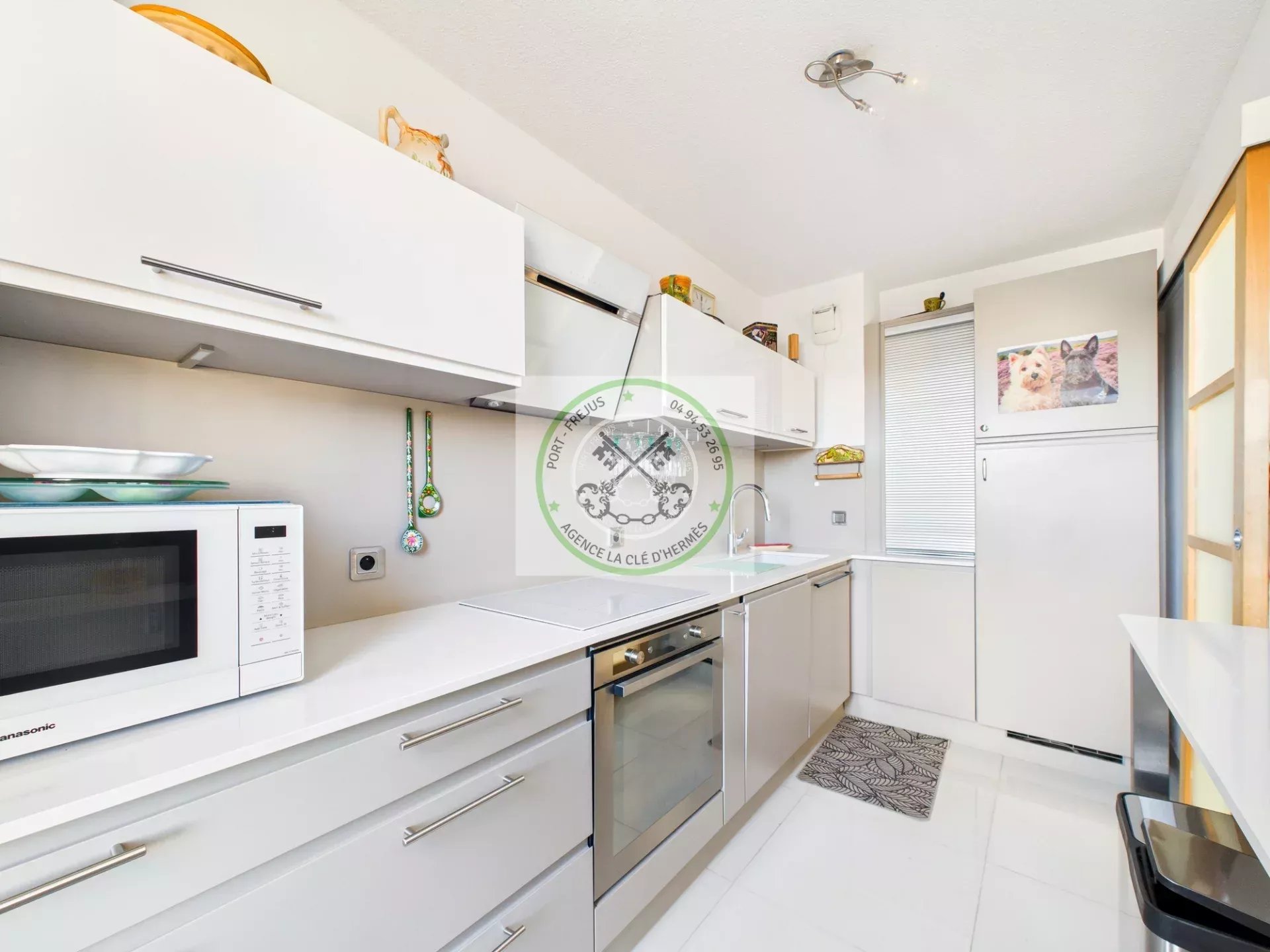 Le séjour avec cuisine entièrement équipée s’ouvre sur une terrasse de 8 m², exposée sud et équipée d’un store banne. Vous y découvrirez une vue imprenable sur la ville ainsi qu’une vue partielle sur la mer.