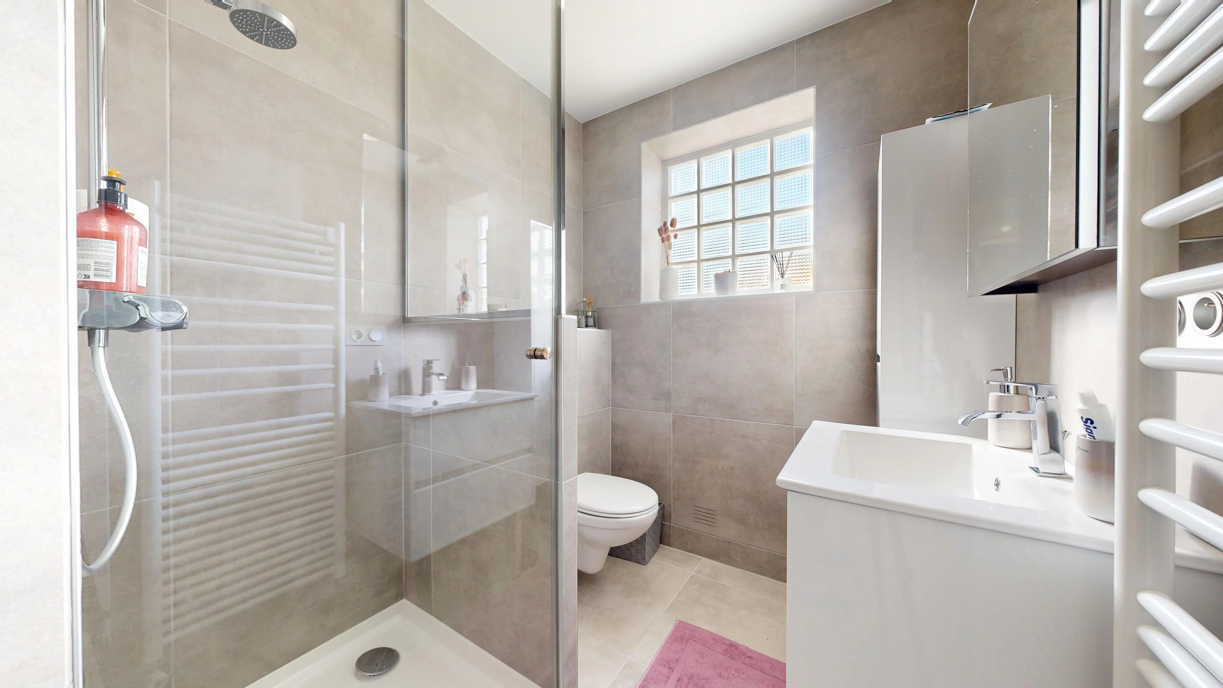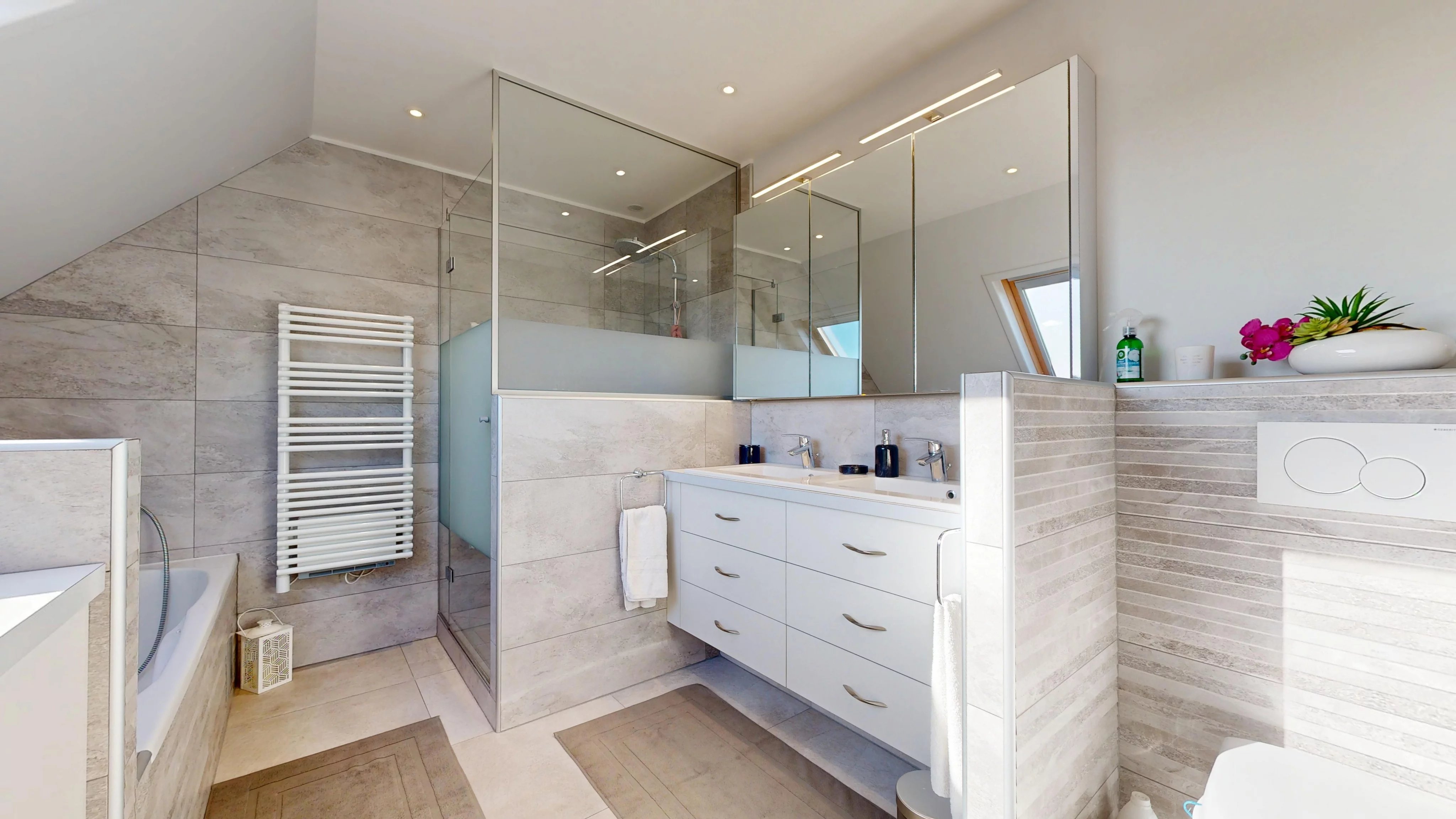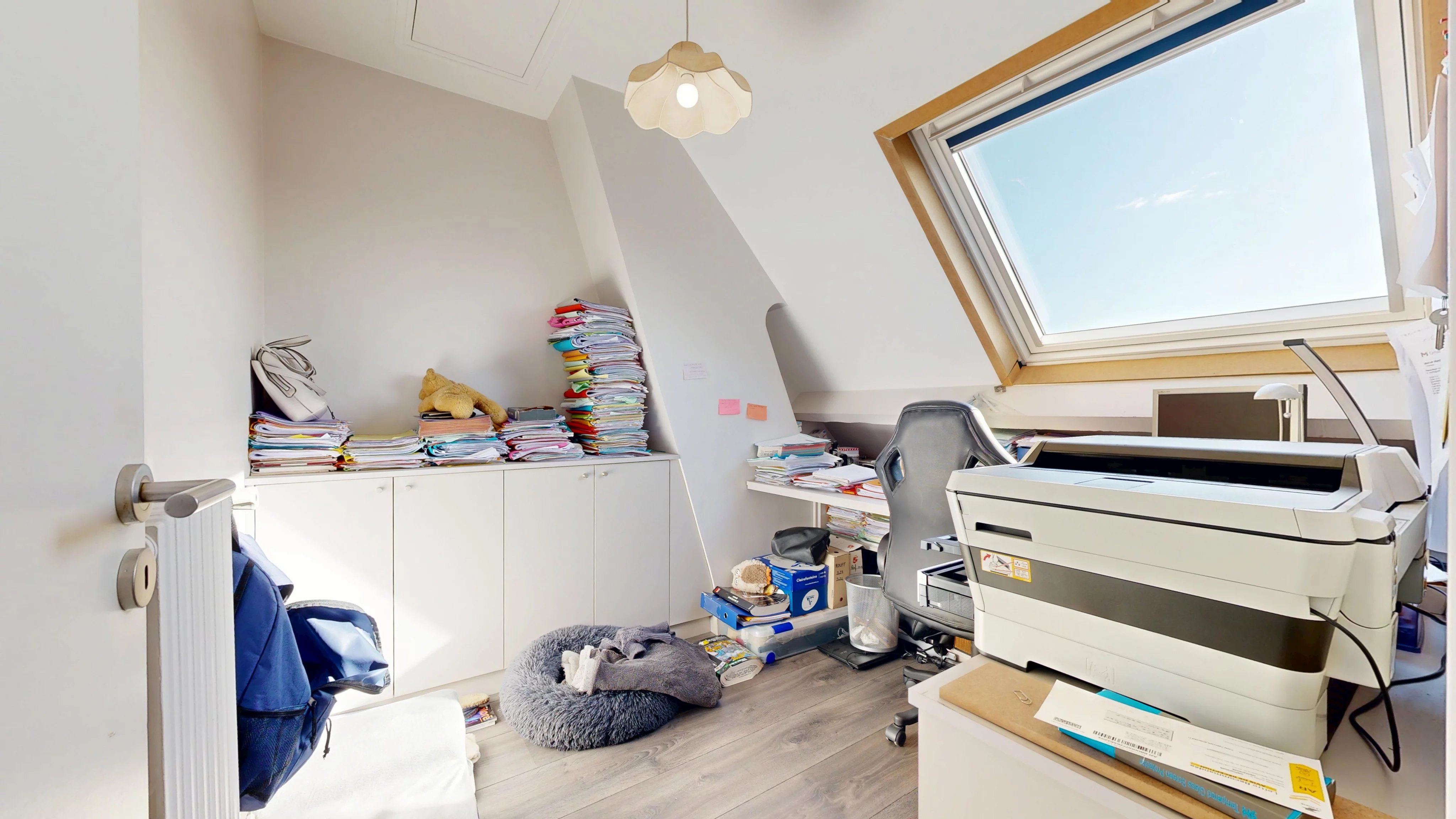 Au dernier niveau, vous trouverez deux chambres spacieuses avec rangements, une salle de bains avec WC (douche, baignoire et coin buanderie) ainsi qu’un bureau pouvant être aménagé en chambre d’enfant.