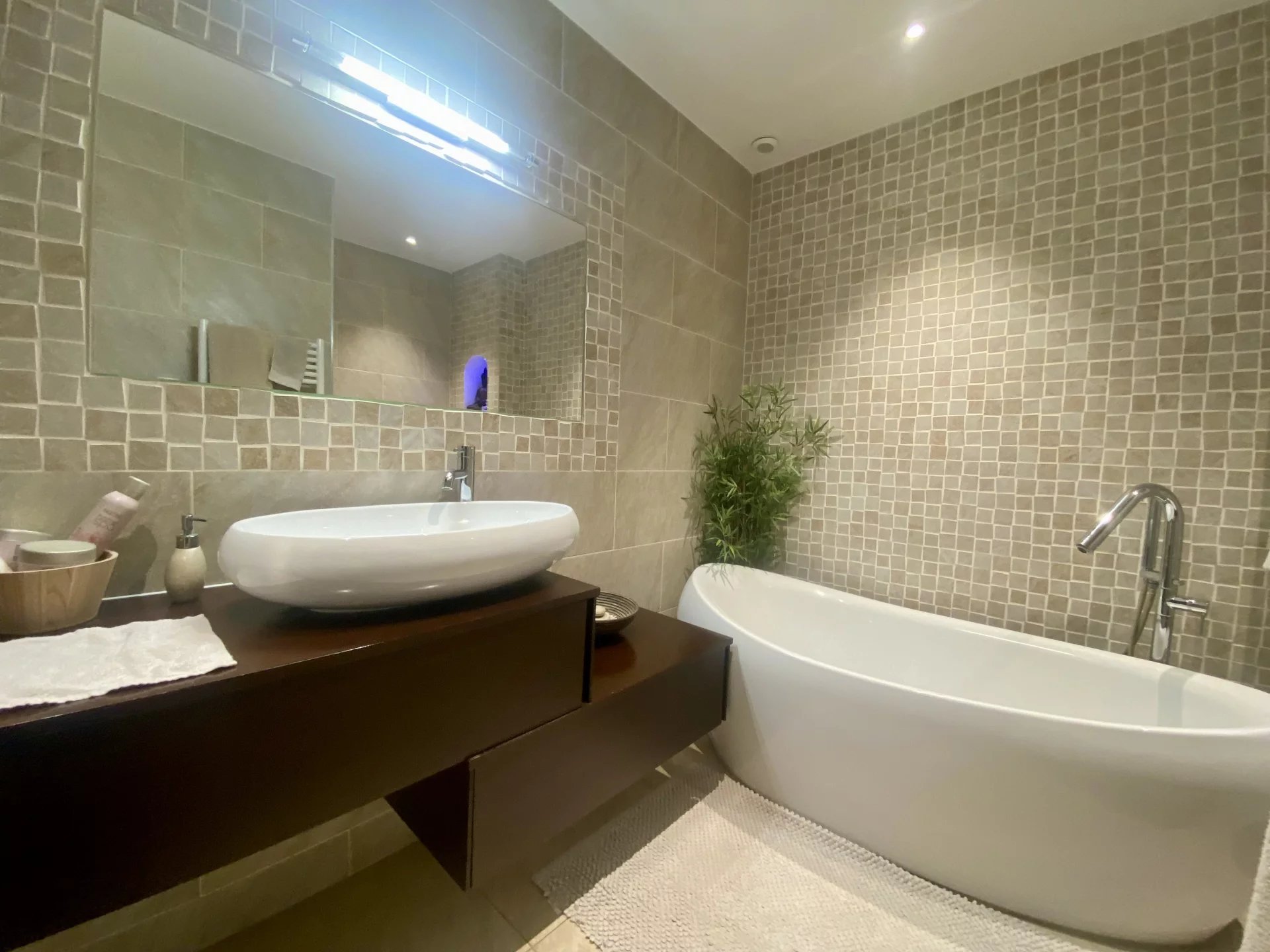 L’espace nuit du rez-de-chaussée comprend, une suite parentale avec sa salle de bains attenante, une deuxième chambre ainsi qu’une salle d’eau indépendante. À l’étage, une mezzanine surplombant le séjour vous conduit à un espace bureau ainsi qu’à deux chambres supplémentaires.