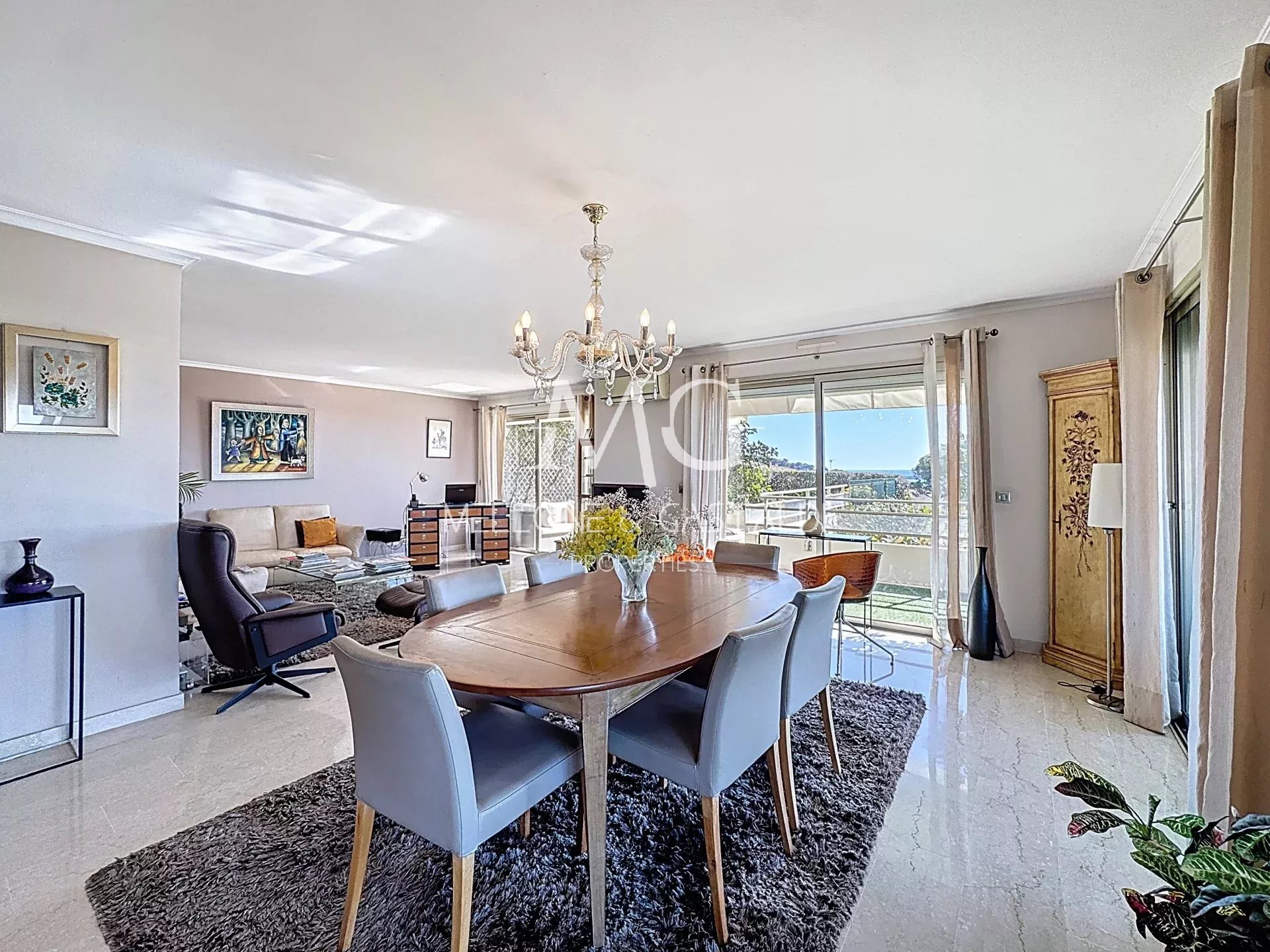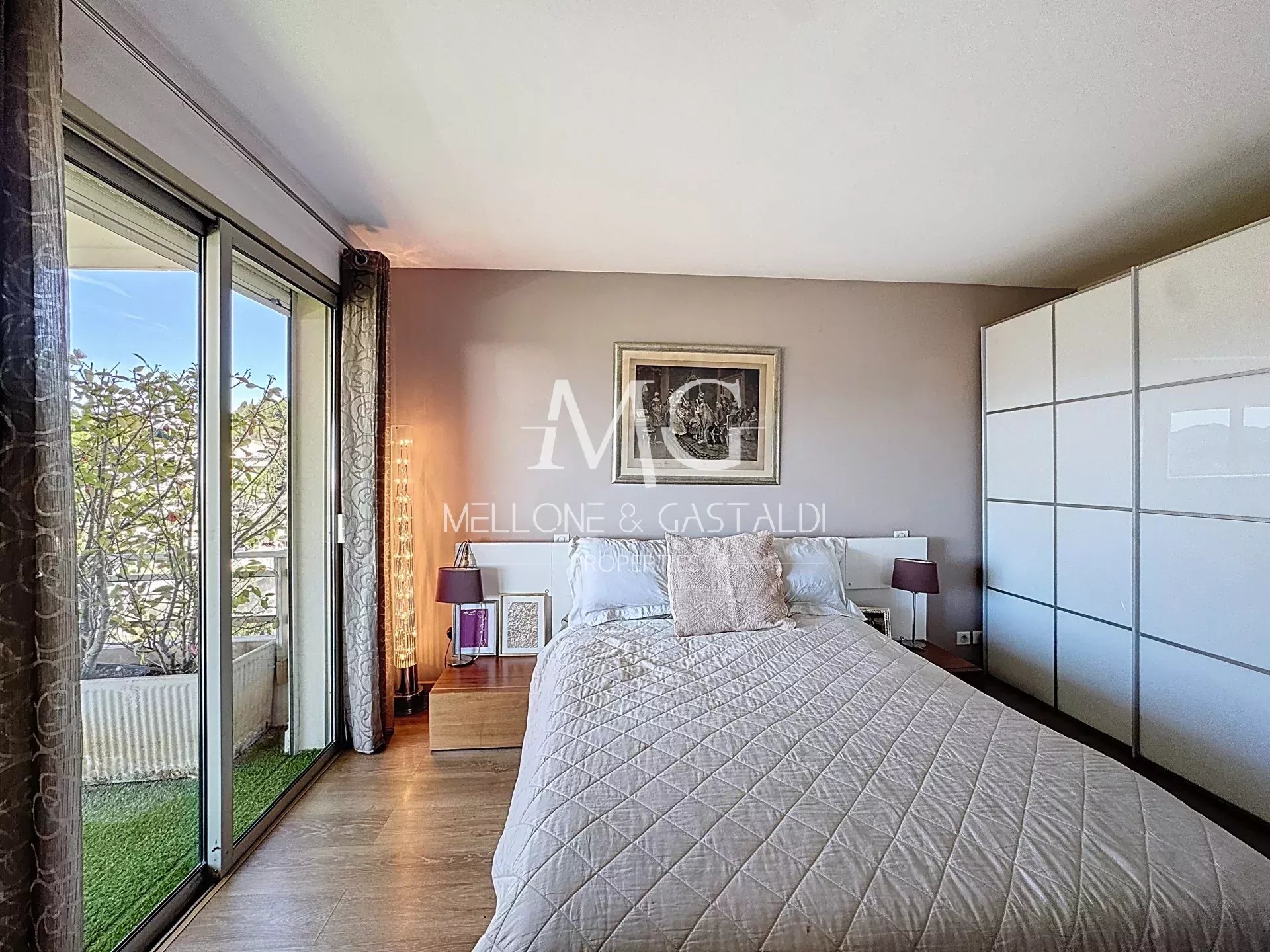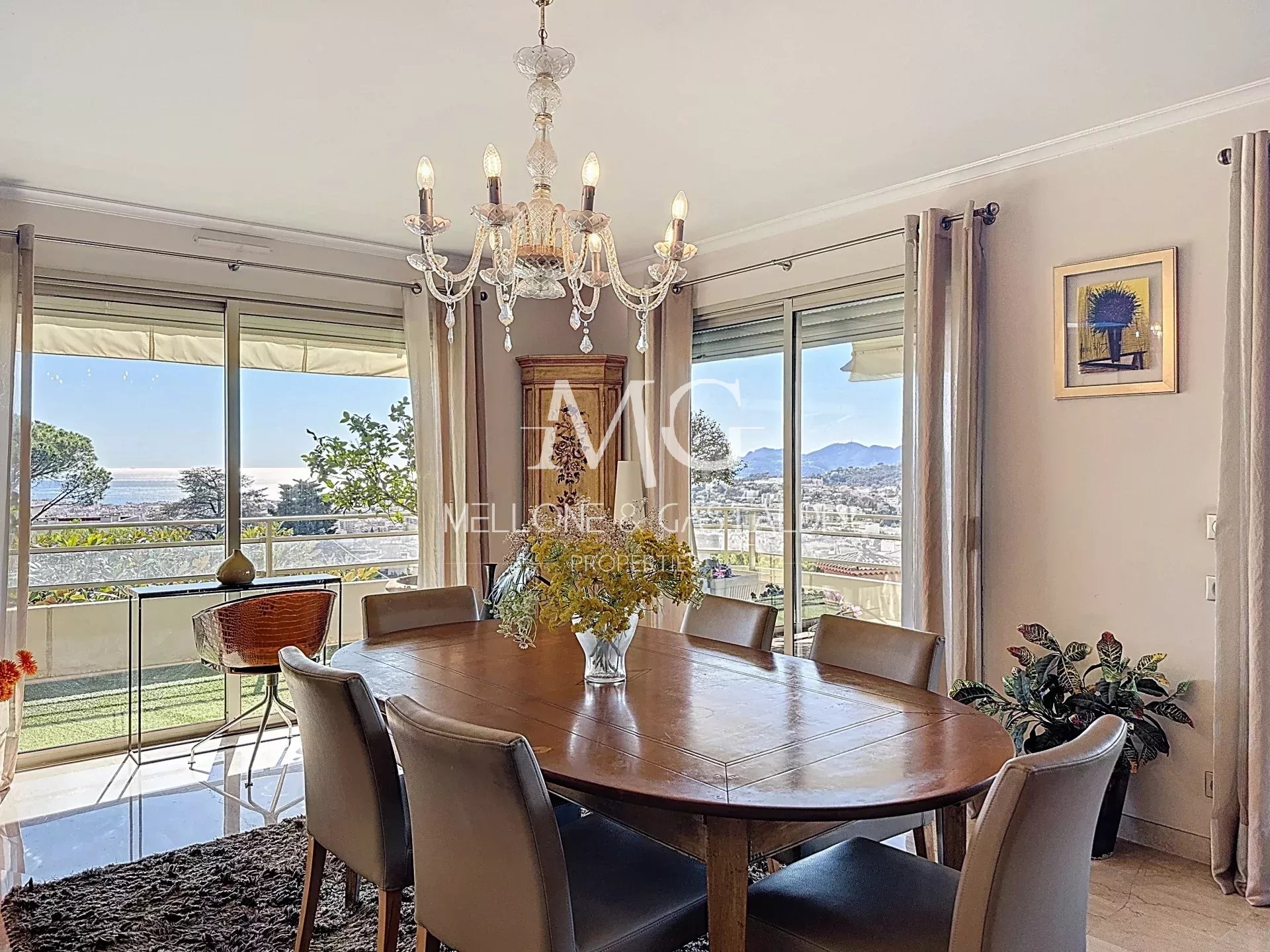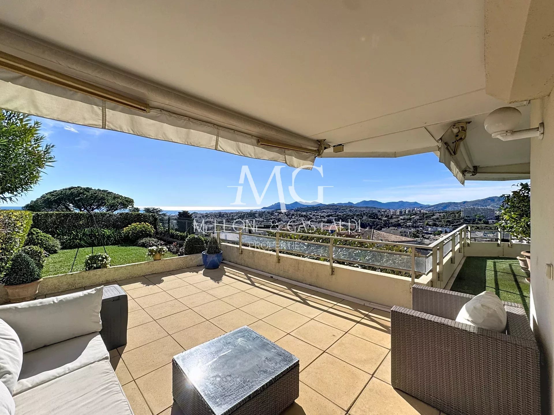 Vue mer panoramique d’exception sur la baie de Cannes Sur les hauteurs résidentielles du Vieux Cannet, secteur Collines, ce superbe appartement contemporain de 97 m² s’inscrit dans une résidence intimiste et sécurisée de grand standing. Dès l’entrée, la magie opère : une vue mer panoramique absolument spectaculaire s’étend des Îles de Lérins jusqu’aux reliefs de l’Estérel, offrant un tableau vivant à toute heure de la journée. Situé en rez-de-jardin surélevé, l’appartement bénéficie de 70 m² d’espaces extérieurs parfaitement exposés sud-ouest, véritables prolongements des pièces de vie, sans aucun vis-à-vis. Un intérieur élégant et parfaitement agencé La pièce de réception, aux volumes généreux, se compose d’un vaste séjour baigné de lumière et d’un espace salle à manger ouvert sur une cuisine américaine entièrement équipée, aux lignes contemporaines. L’espace nuit propose deux chambres en suite, chacune disposant de sa salle de douche privative, garantissant confort et intimité. Un toilette invité complète cet agencement harmonieux. Toutes les pièces s’ouvrent sur la terrasse et le jardin, créant une continuité intérieur/extérieur particulièrement recherchée sur la Côte d’Azur. Une résidence de standing aux prestations soignées Construite en 2015, la résidence offre un cadre de vie sécurisé et exclusif avec : - Piscine en copropriété - Salle de sport - Vidéosurveillance - Ascenseur - Accès sécurisé Un garage fermé ainsi qu’une cave viennent parfaire ce bien rare sur le marché.
