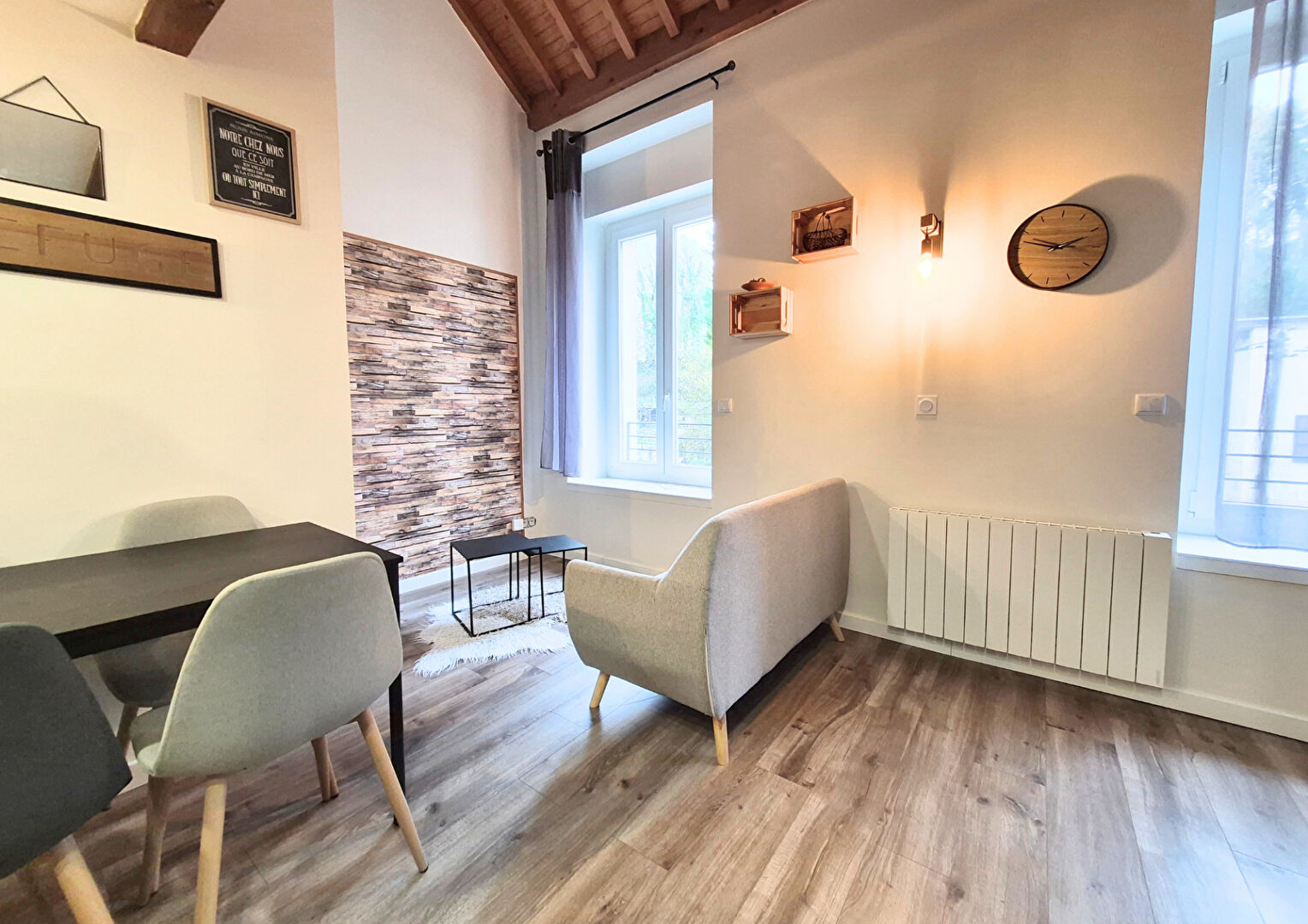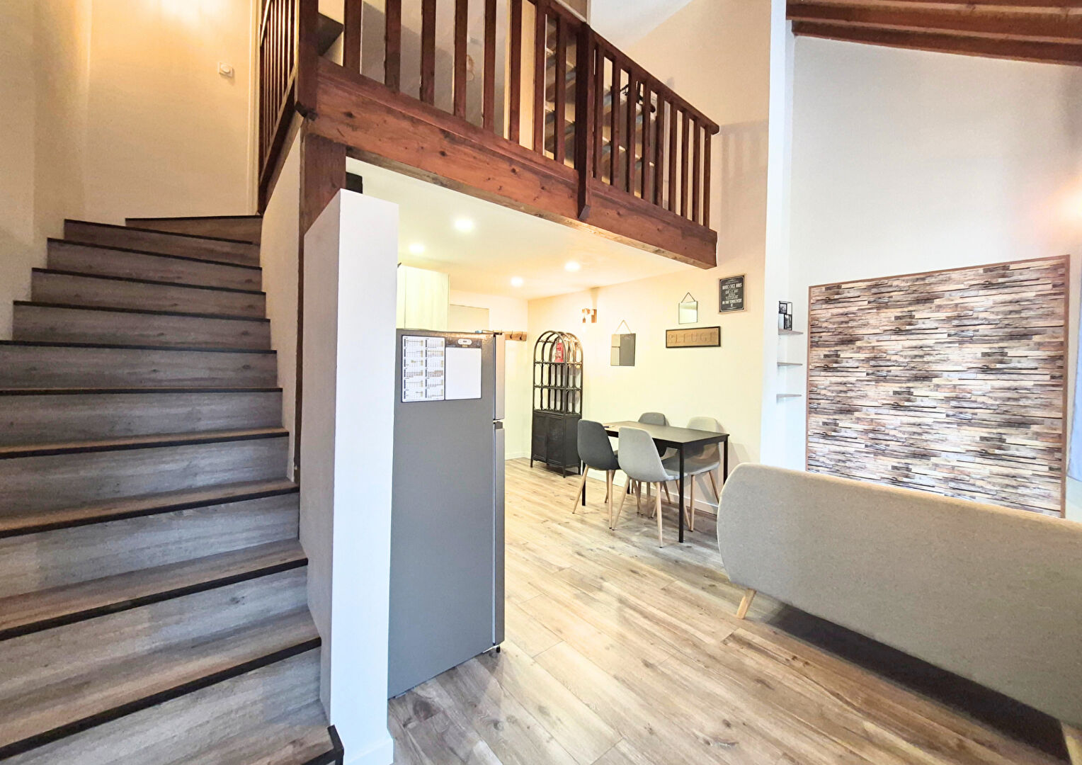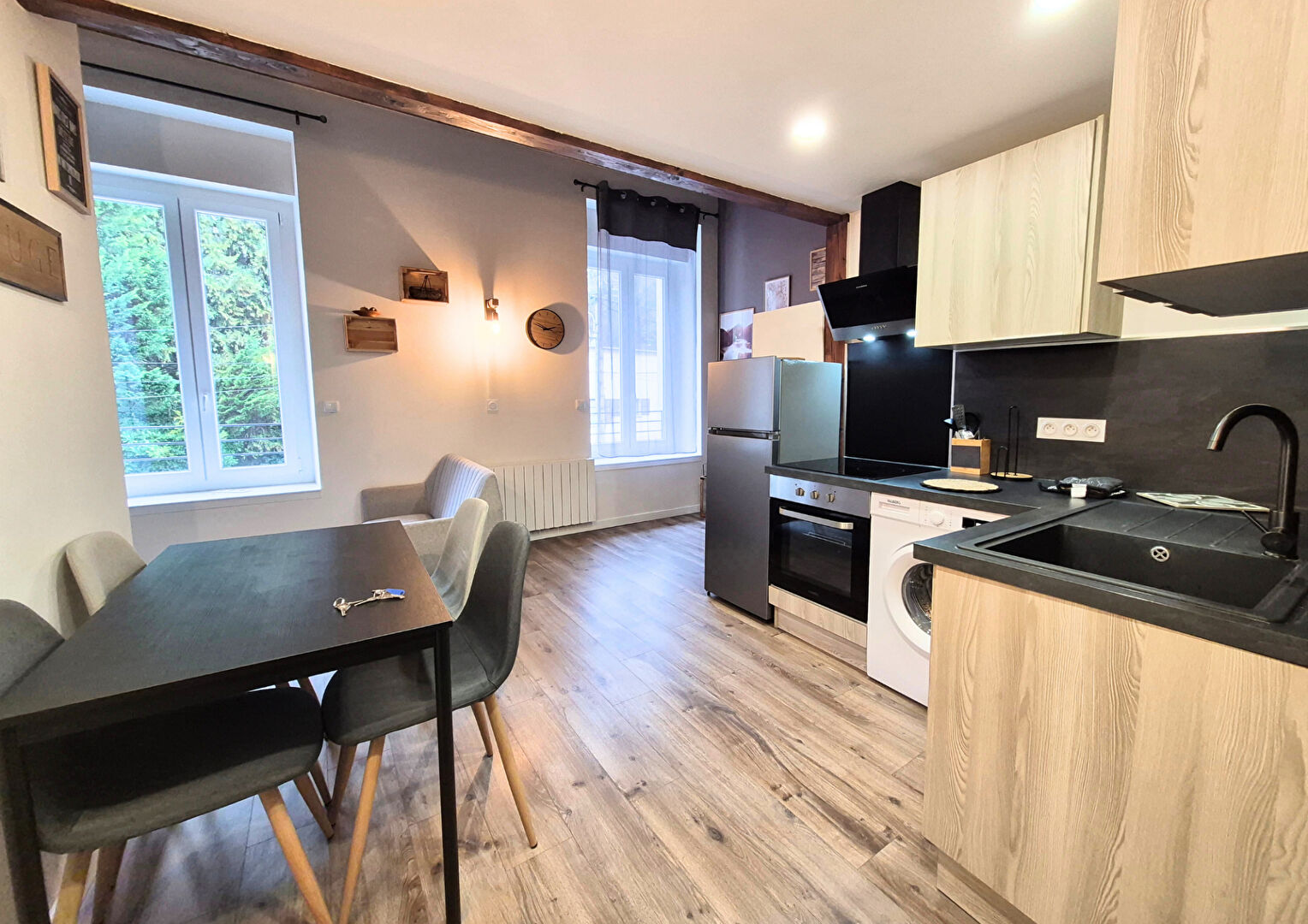 STUDIO MEUBLE + MEZZANINE entièrement rénové - 35 m² - RIVES - Disponible Découvrez ce joli studio rénové avec mezzanine entièrement meublé proche du centre de RIVES et de ses commodités dans une petite copropriété. Cet appartement se compose d'une cuisine équipée (meubles, plaques de cuisson, hotte, réfrigérateur, four, machine à laver) et ouverte sur la pièce principale, d'une mezzanine servant de coin nuit avec salle d'eau et un WC séparé. Stationnement collectif LES ATOUTS: - Entièrement rénové - Proche du centre-ville - Meublé avec gout - Spacieux - Stationnement Chauffage et eau chaude individuel électrique LOYER de 530 euros + 20 euros de provisions sur charges (régularisation annuelle) Provision TEOM à prévoir Dépôt de garantie : 1060 euros Honoraires à la charge du locataire : 392 euros TTC dont 107 euros TTC d'état des lieux d'entrée