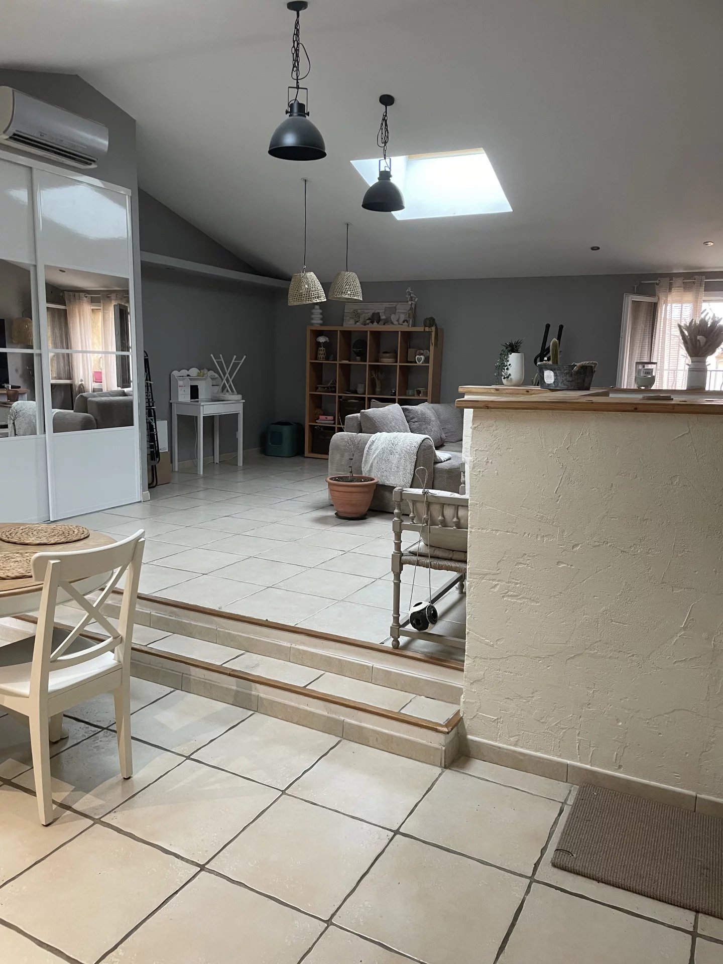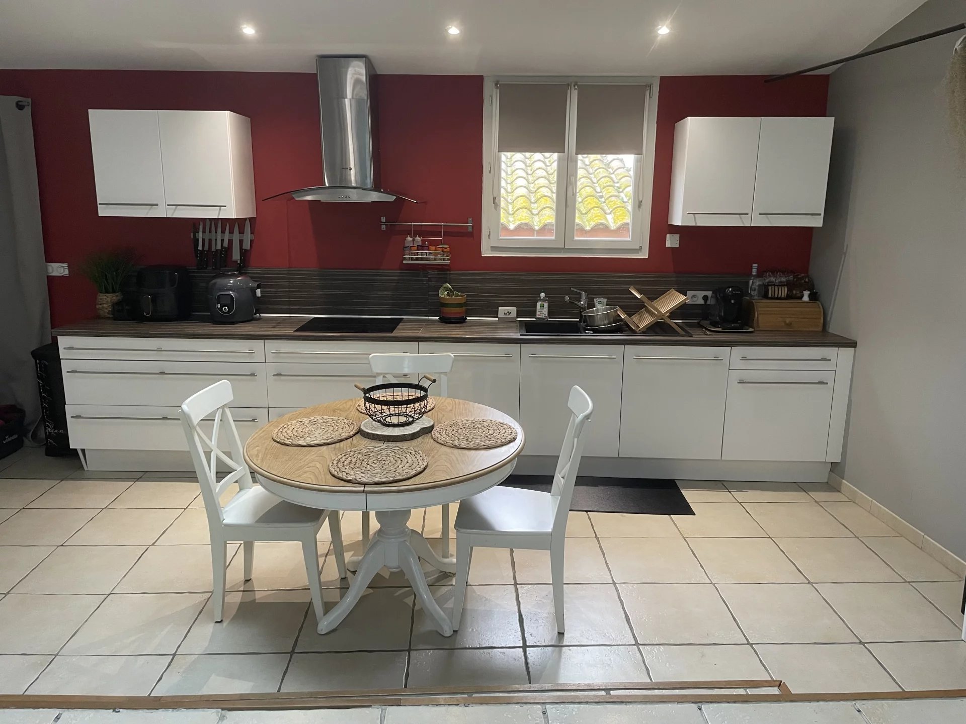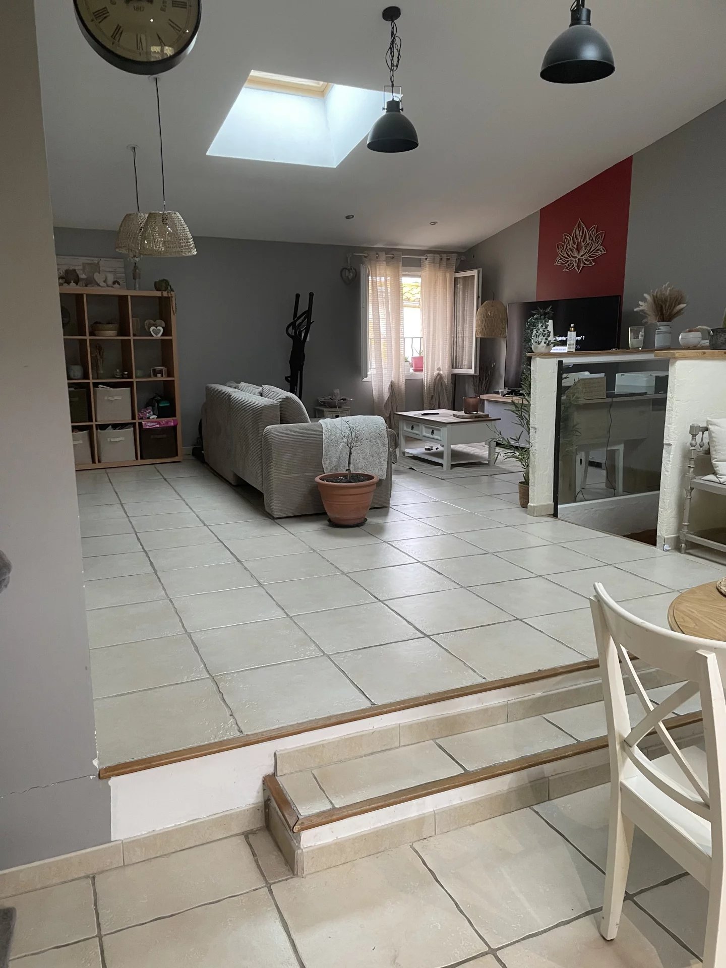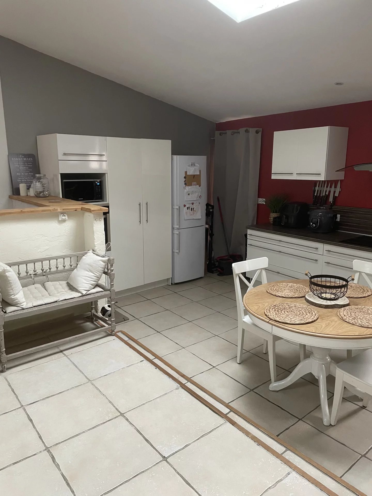 Les photos montrent le mobilier actuel : le canapé, la table basse, la table à manger et les 4 chaises seront remplacés. Logement loué sans télévision.