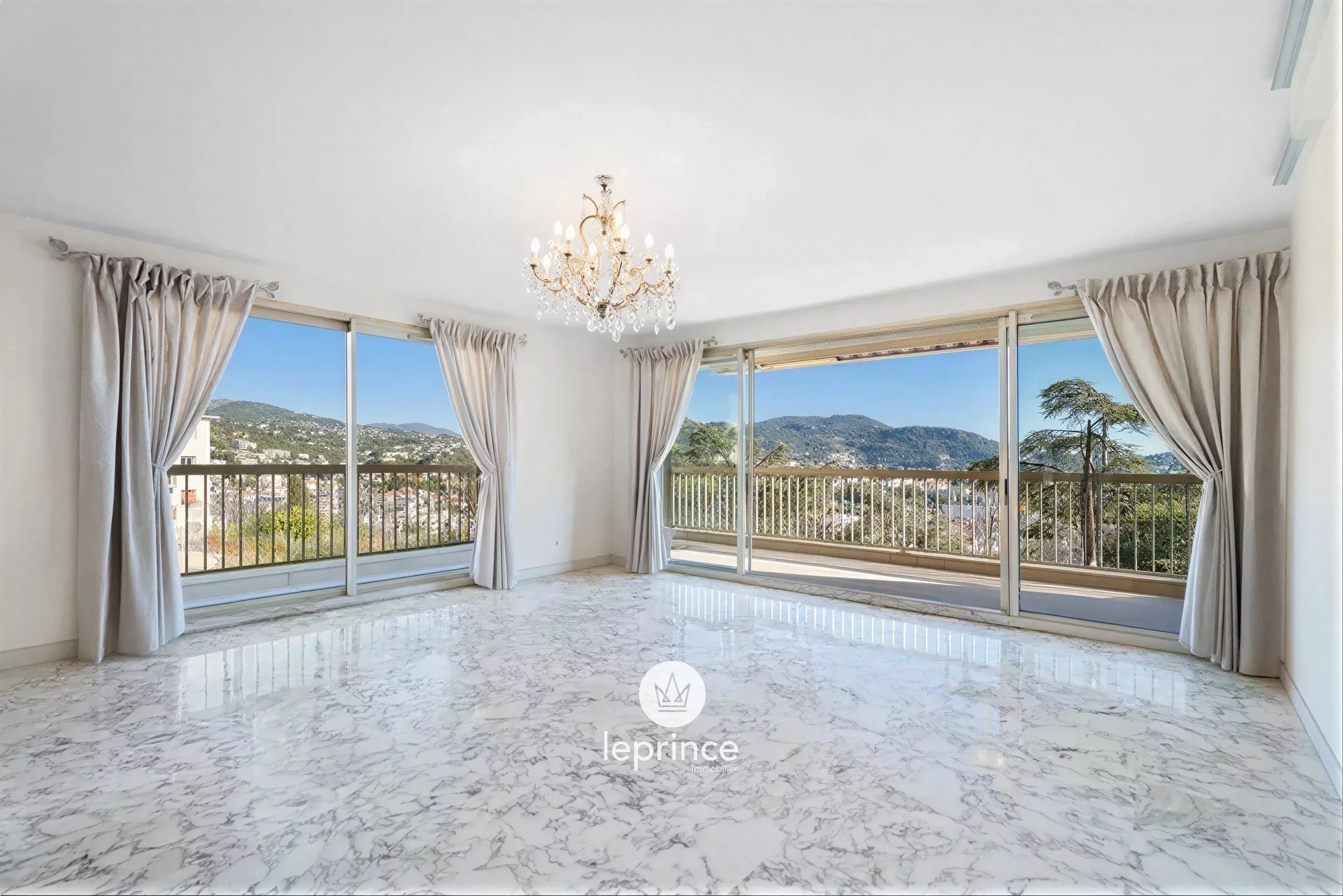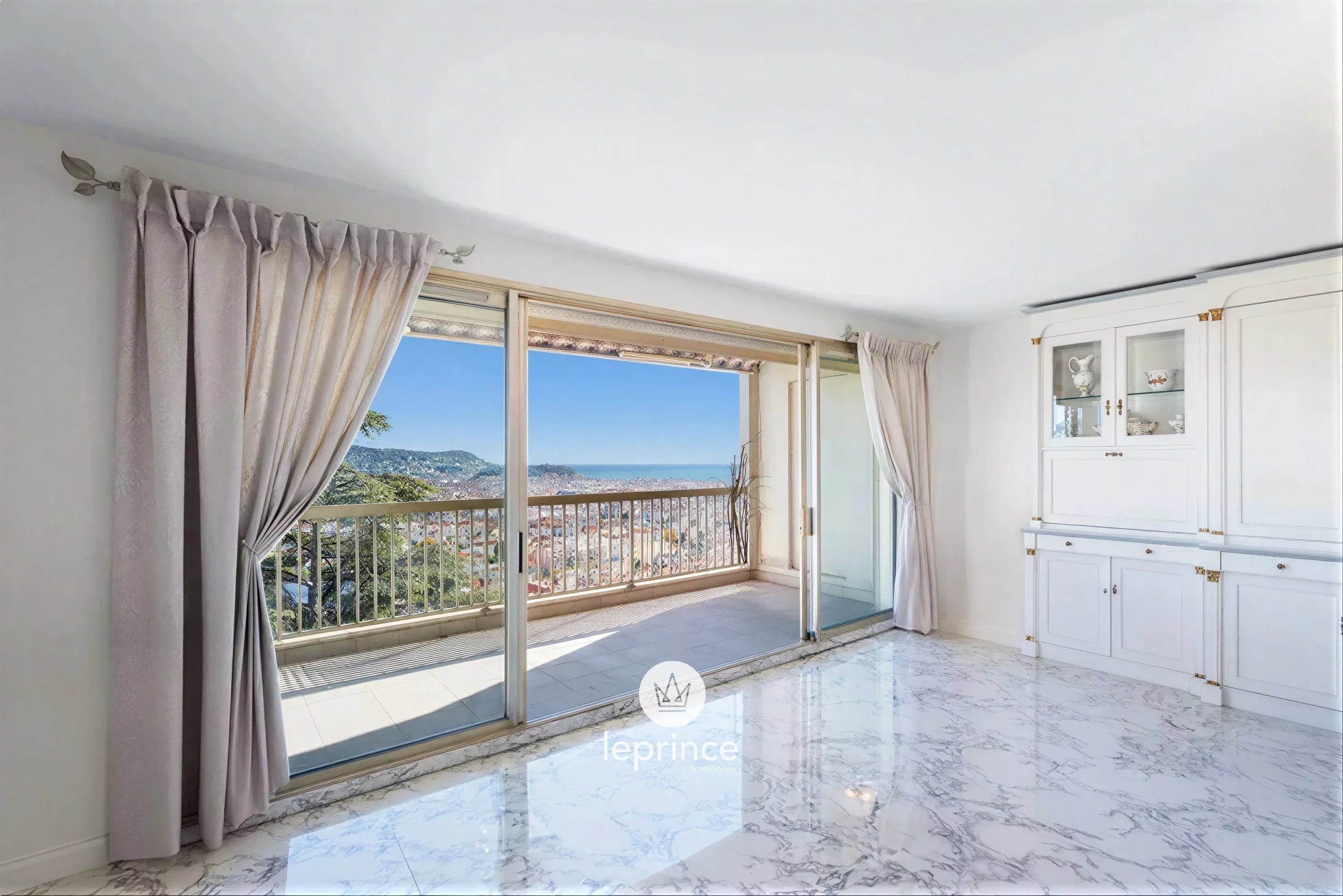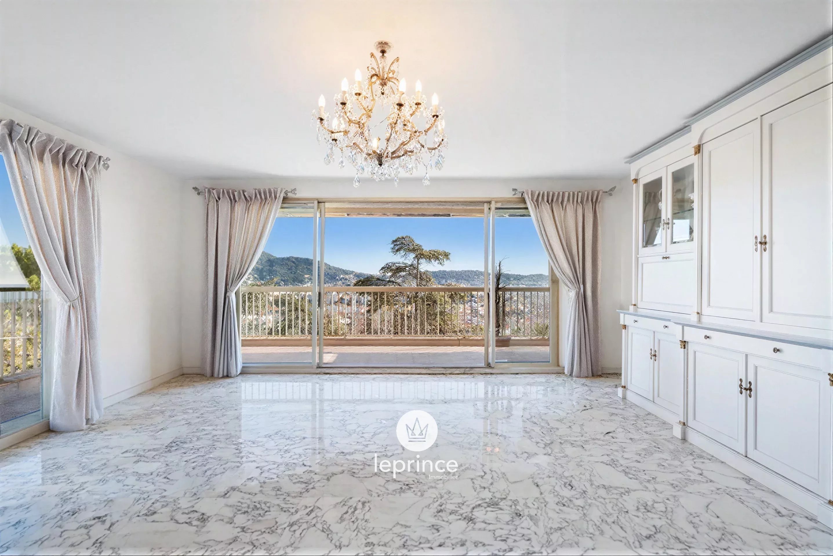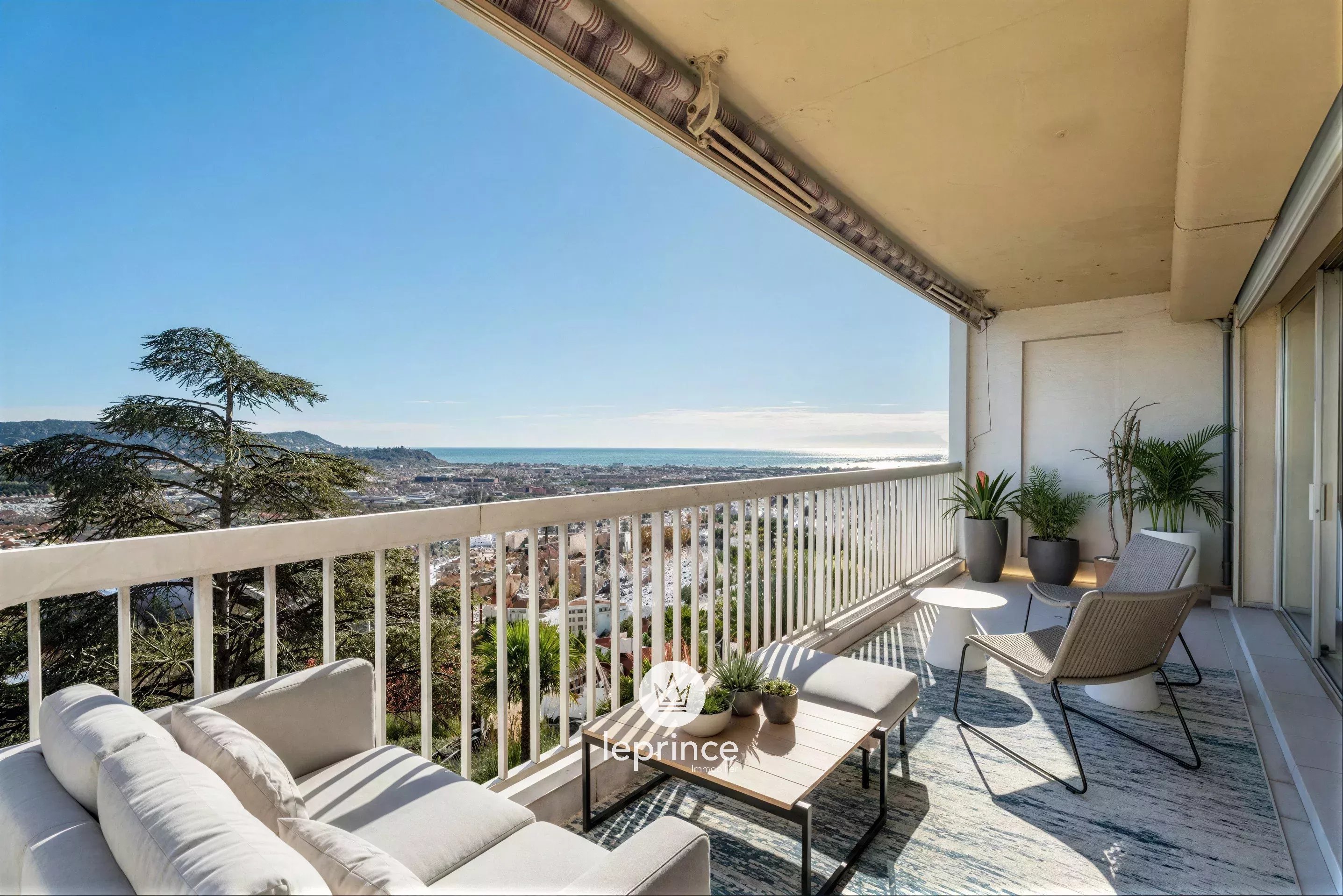 Pessicart / Parc Montebello: Situato a un Piano Alto di una residenza di prestigio degli anni ’70 con Piscina e Aree Verdi, scoprite questo appartamento di 4 Vani di circa 110 m² con una terrazza di oltre 45 m2 che offre una vista Panoramica sulla città, sul Mare e sulle Colline