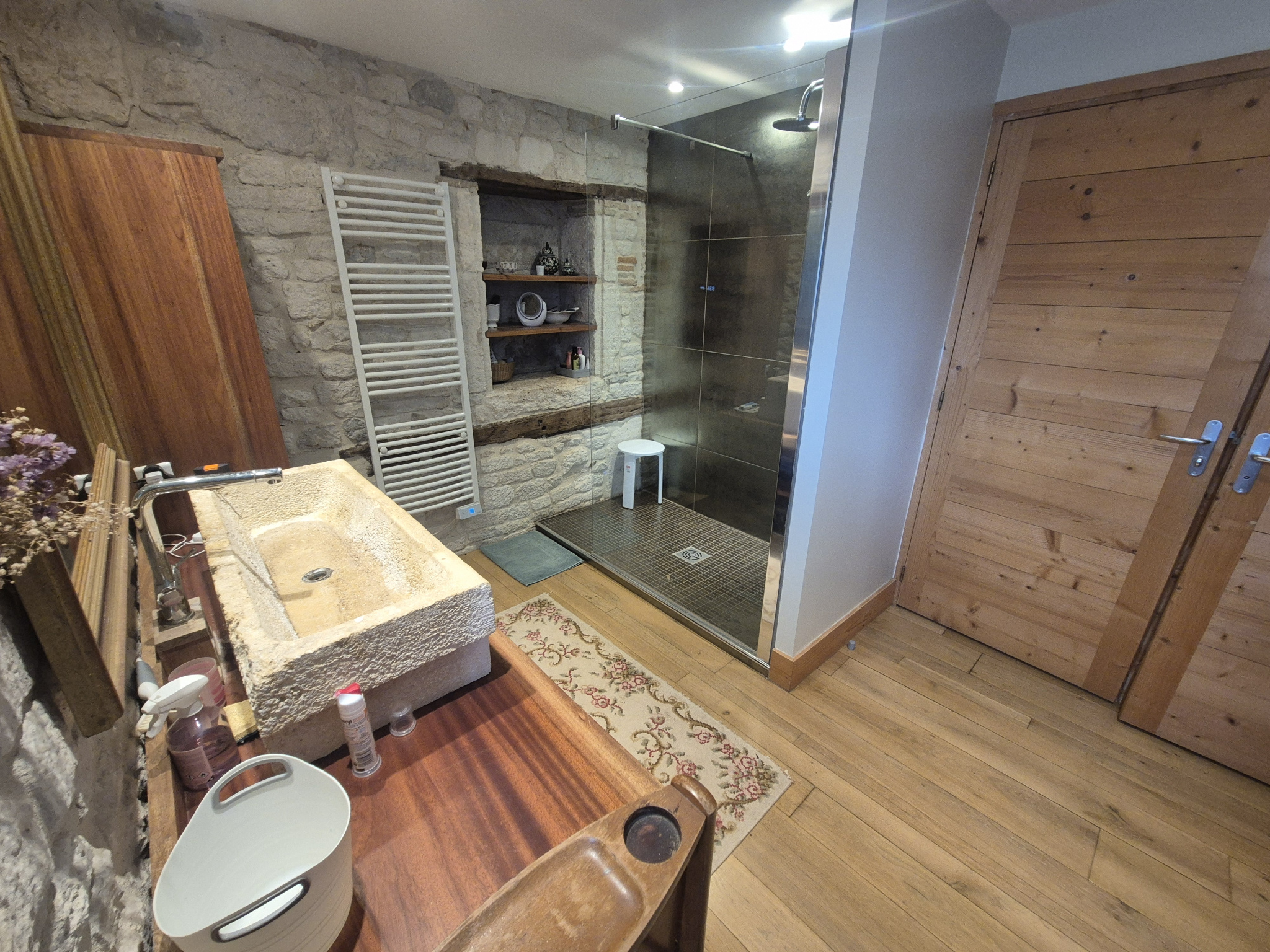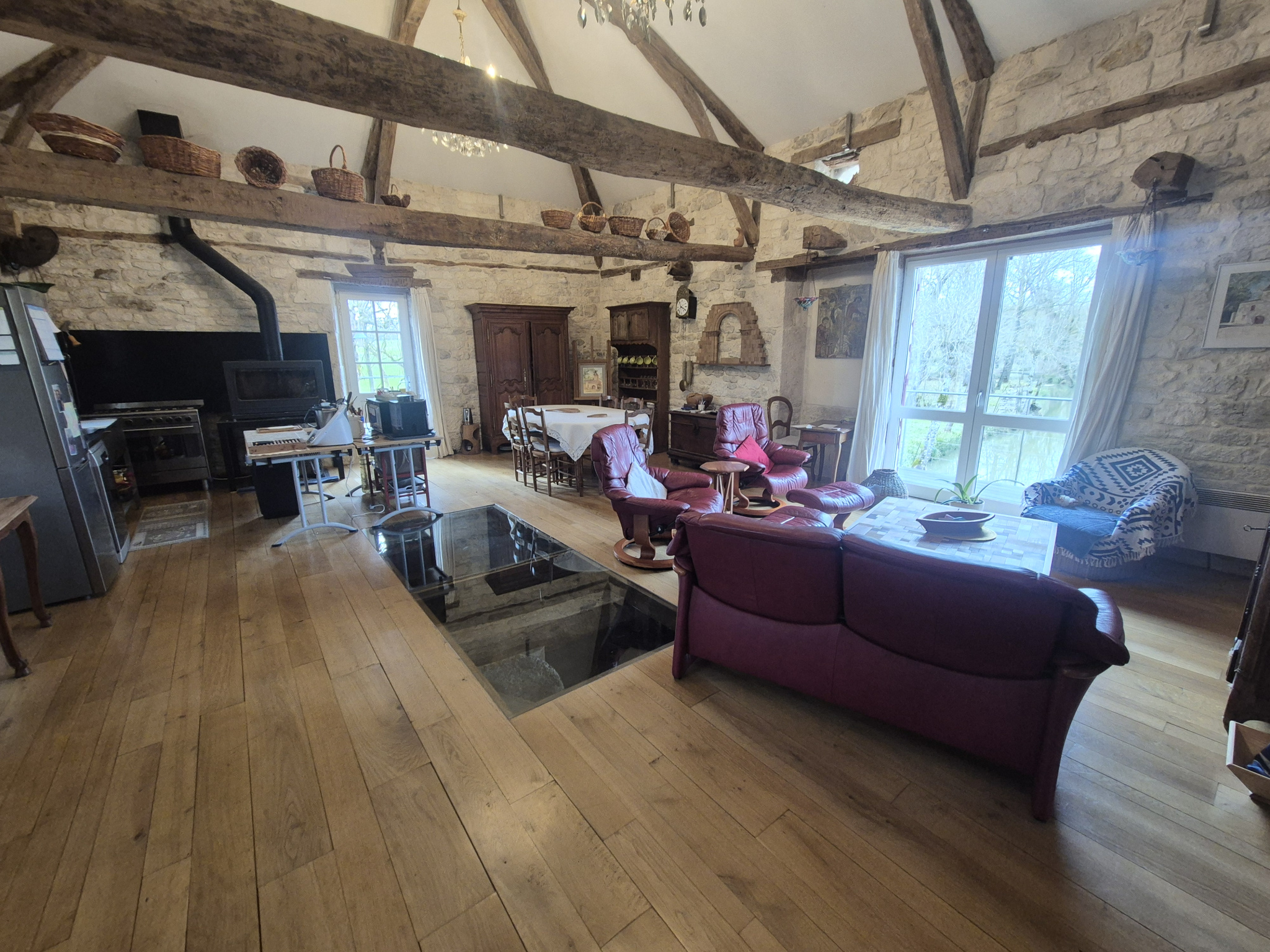 Au niveau supérieur un grand séjour de presque 60 m2 , avec un grand verre pour voir les meules , sa cuisine ouverte et une terrasse plein Sud et ses écureuils ...