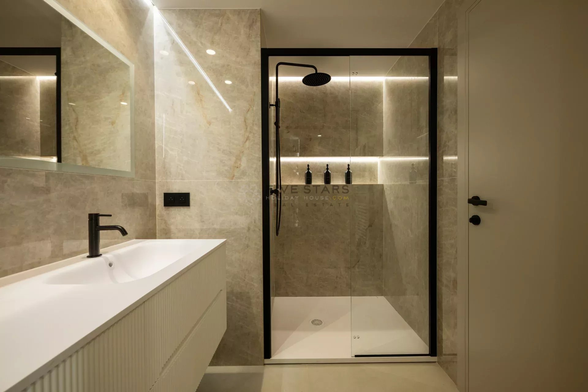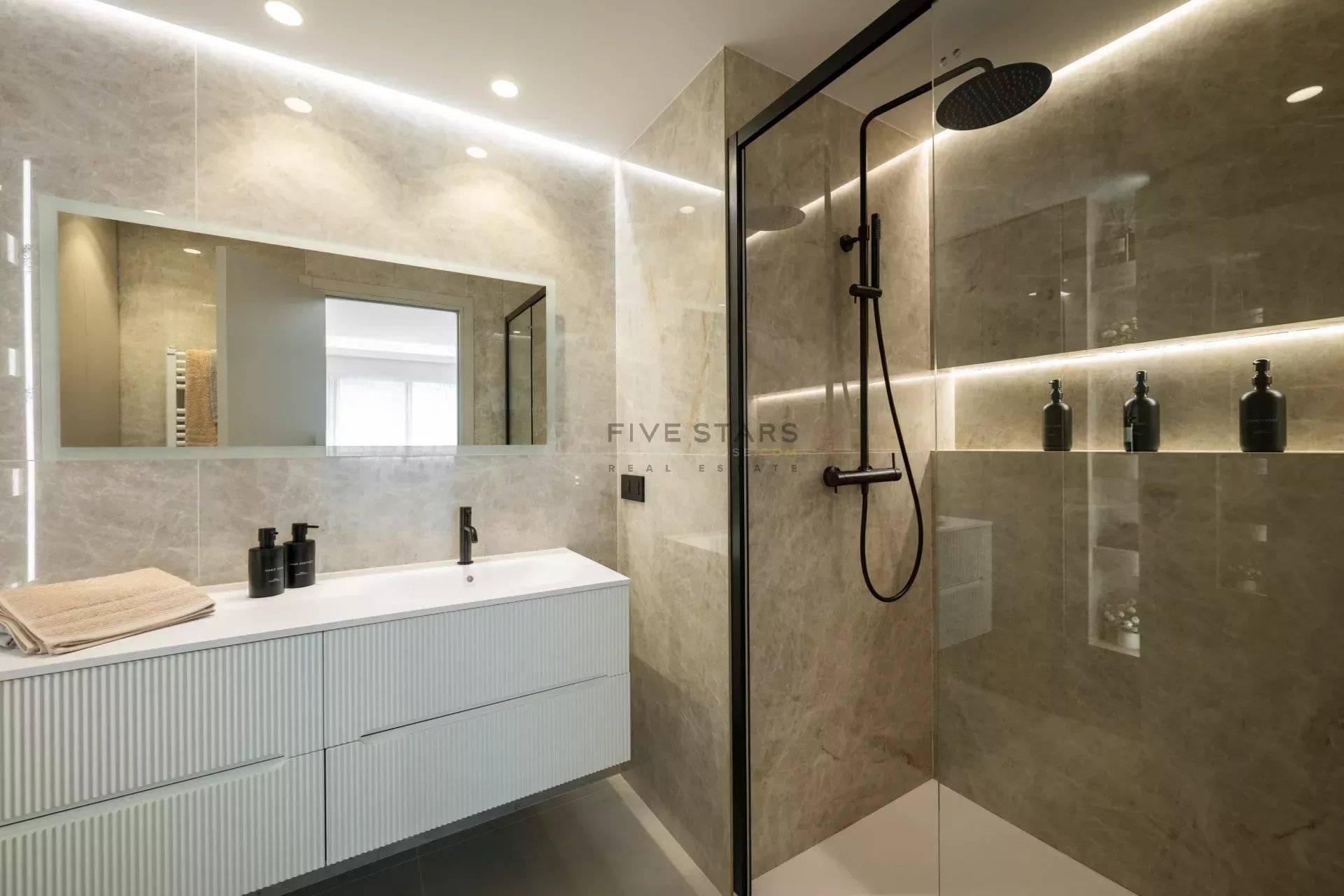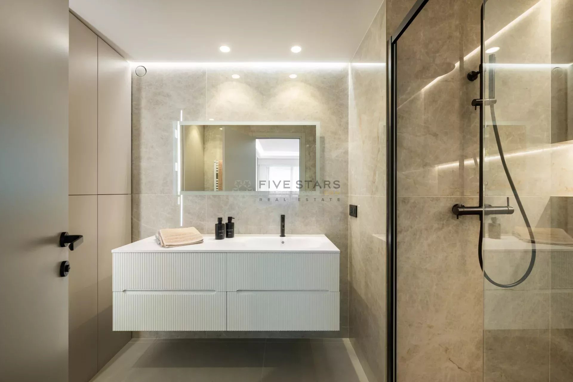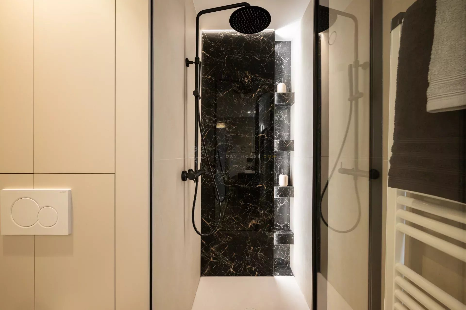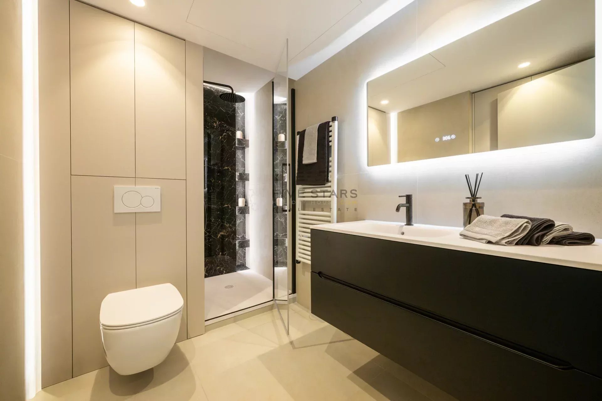 L’appartamento comprende due camere da letto, di cui una suite, ciascuna dotata del proprio bagno con doccia all’italiana e WC, con finiture eleganti e spazi contenitivi perfettamente integrati.