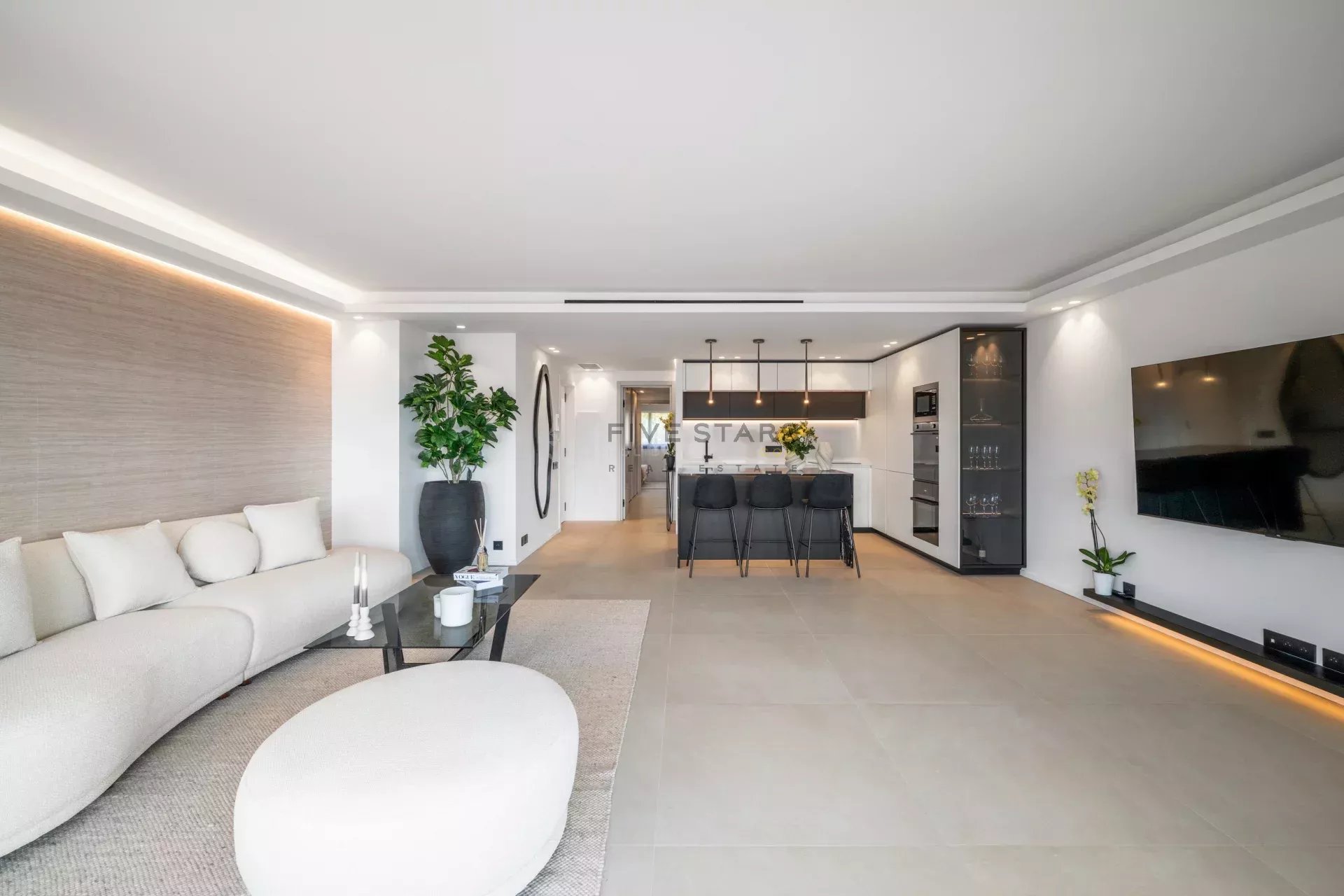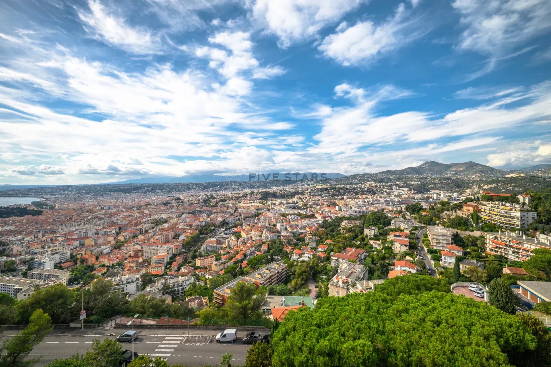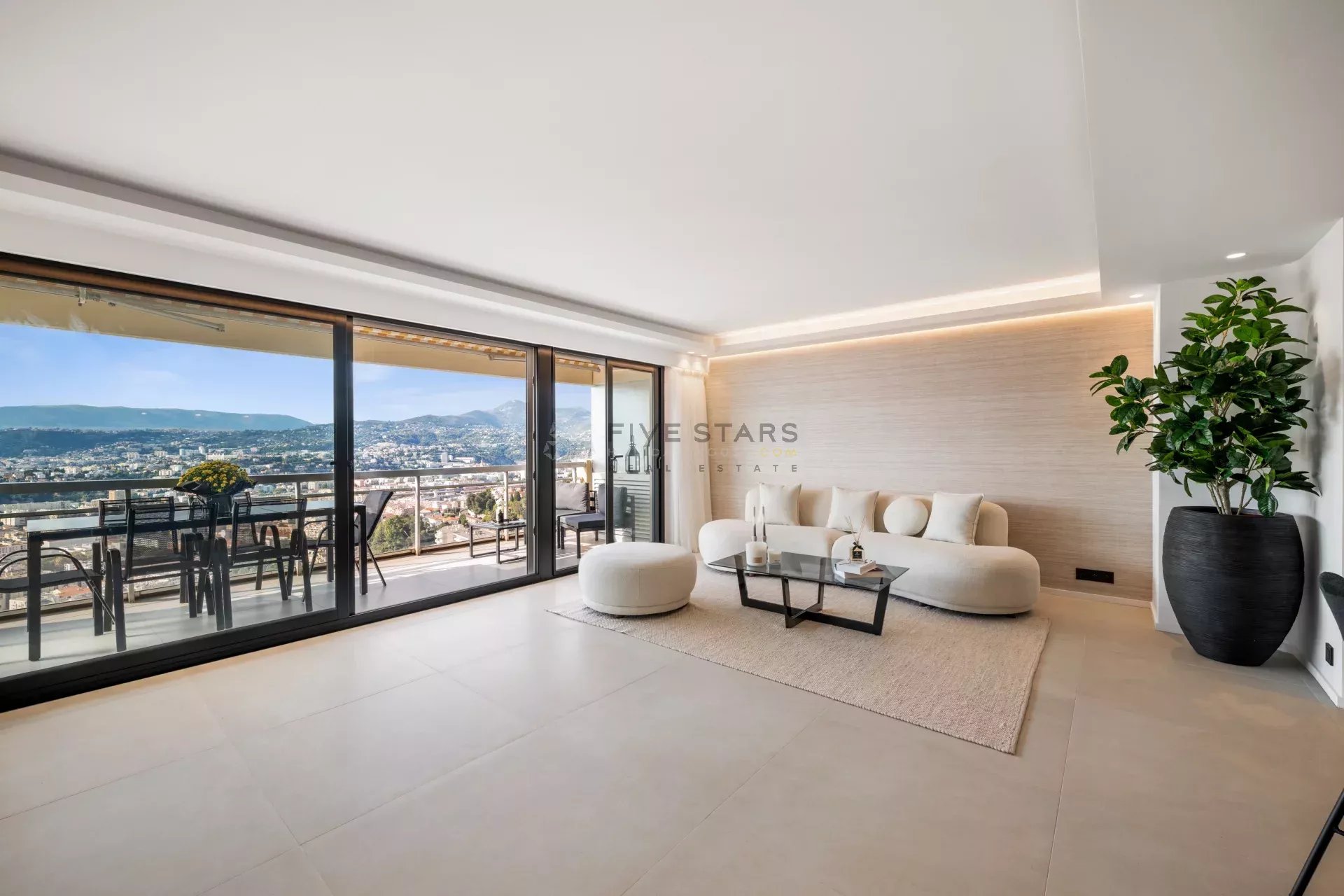 L’ampio e luminoso soggiorno, con cucina a vista completamente attrezzata e isola centrale, si apre su una terrazza di 11 m² che offre una splendida vista panoramica sul mare e sulla città di Nizza.