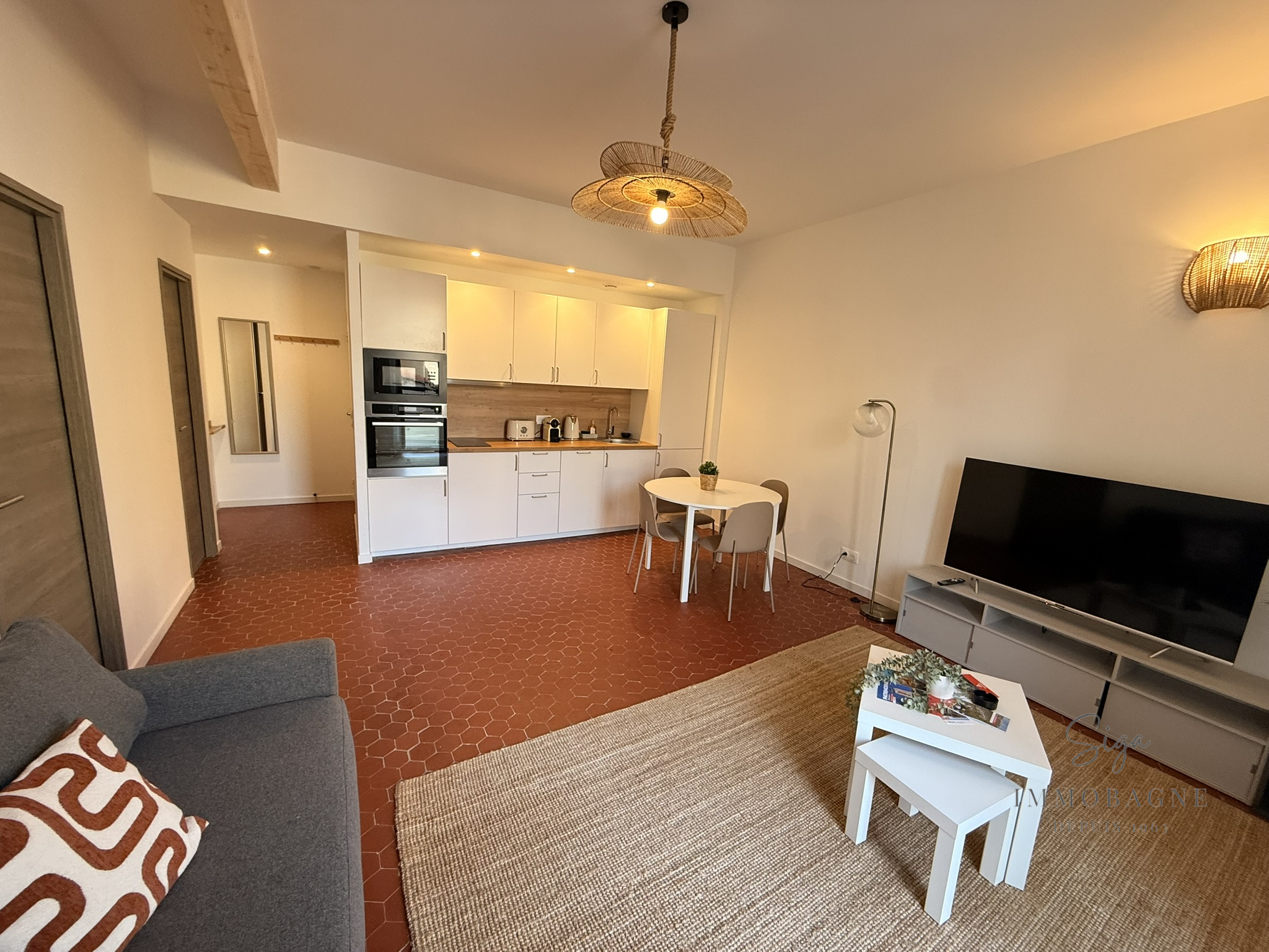 SIGA-IMMOBAGNE vous propose au calme avec bcp de charme ce superbe T2 de 42.71 m2 carrez avec terrasse de 5 m2 entièrement équipé et meublé. Il est situé en 2ème étage sur 3 sans ascenseur dans un petit immeuble de 7 lots entièrement rénové proche de la place de l'horloge et de la gare. Il est composé d'un séjour cuisine us donnant sur la terrasse ou l'on pourra diner à 4 personnes, d'une chambre et d'une salle d'eau avec douche à l'italienne et wc. MDT exclusif 1055. Pas de procédure en cours. Gare SNCF et routière 5 minutes à pieds.