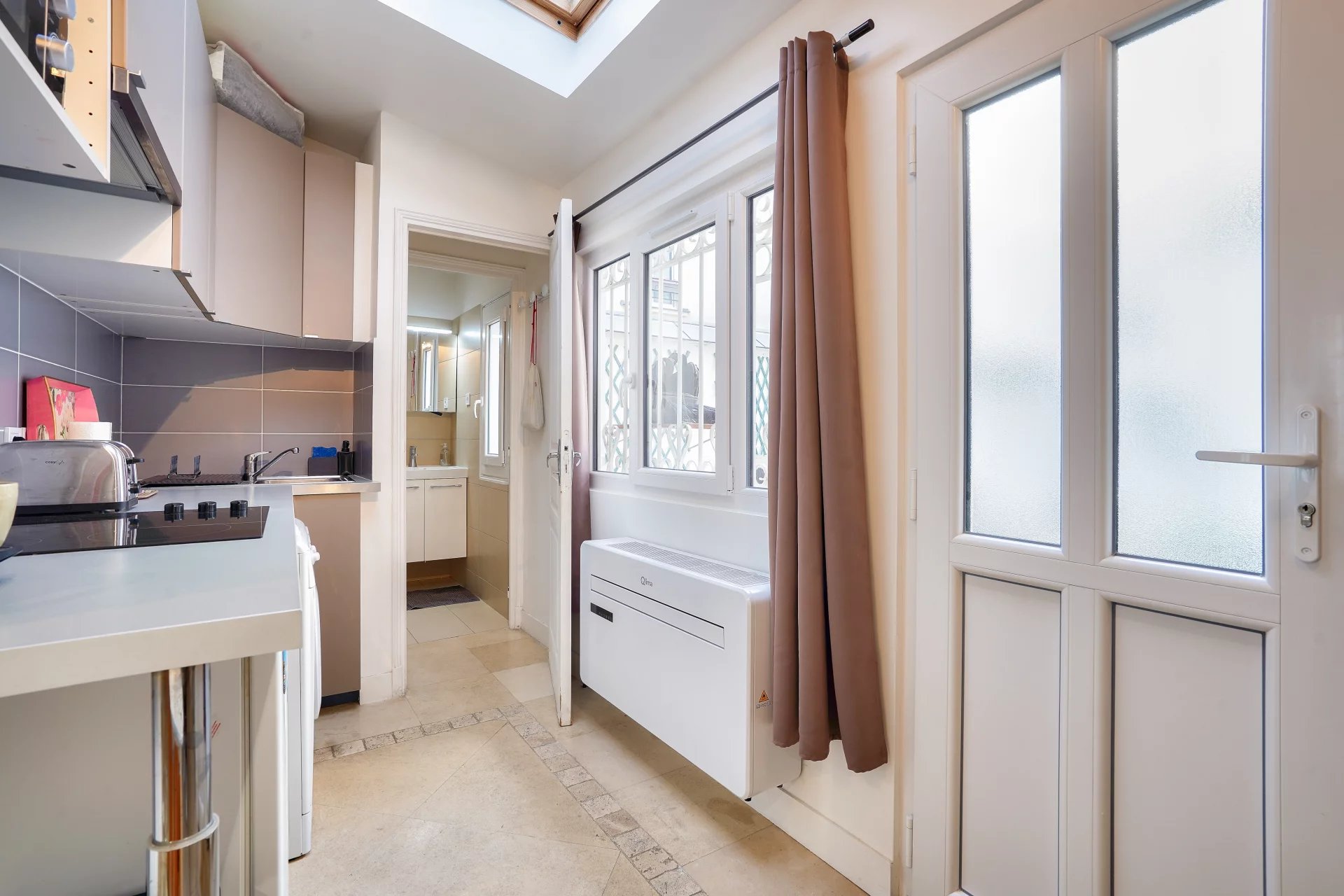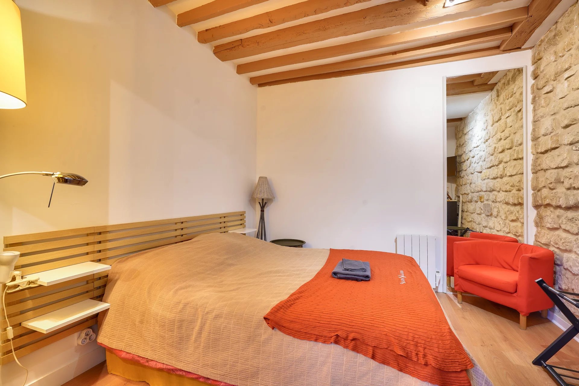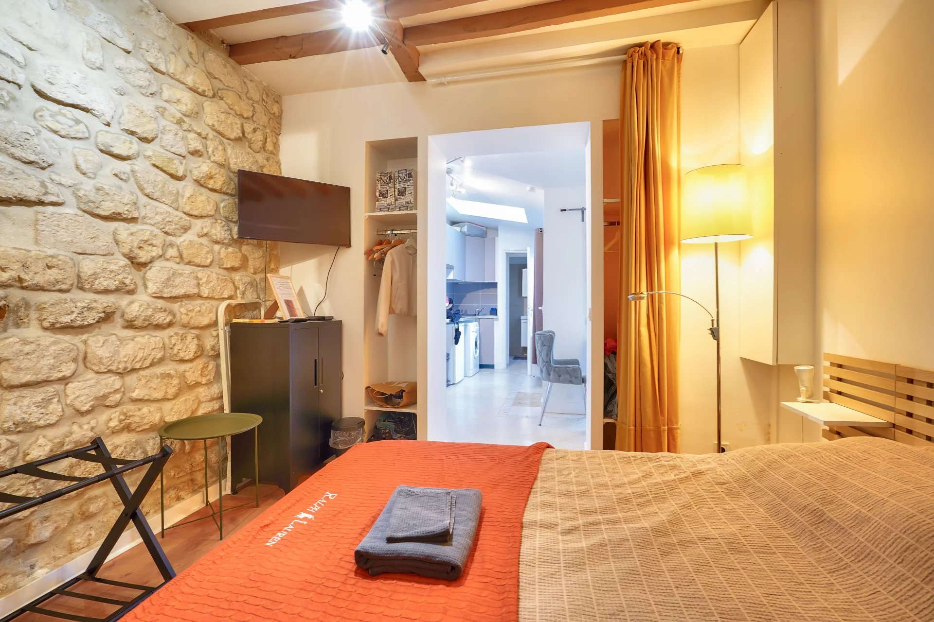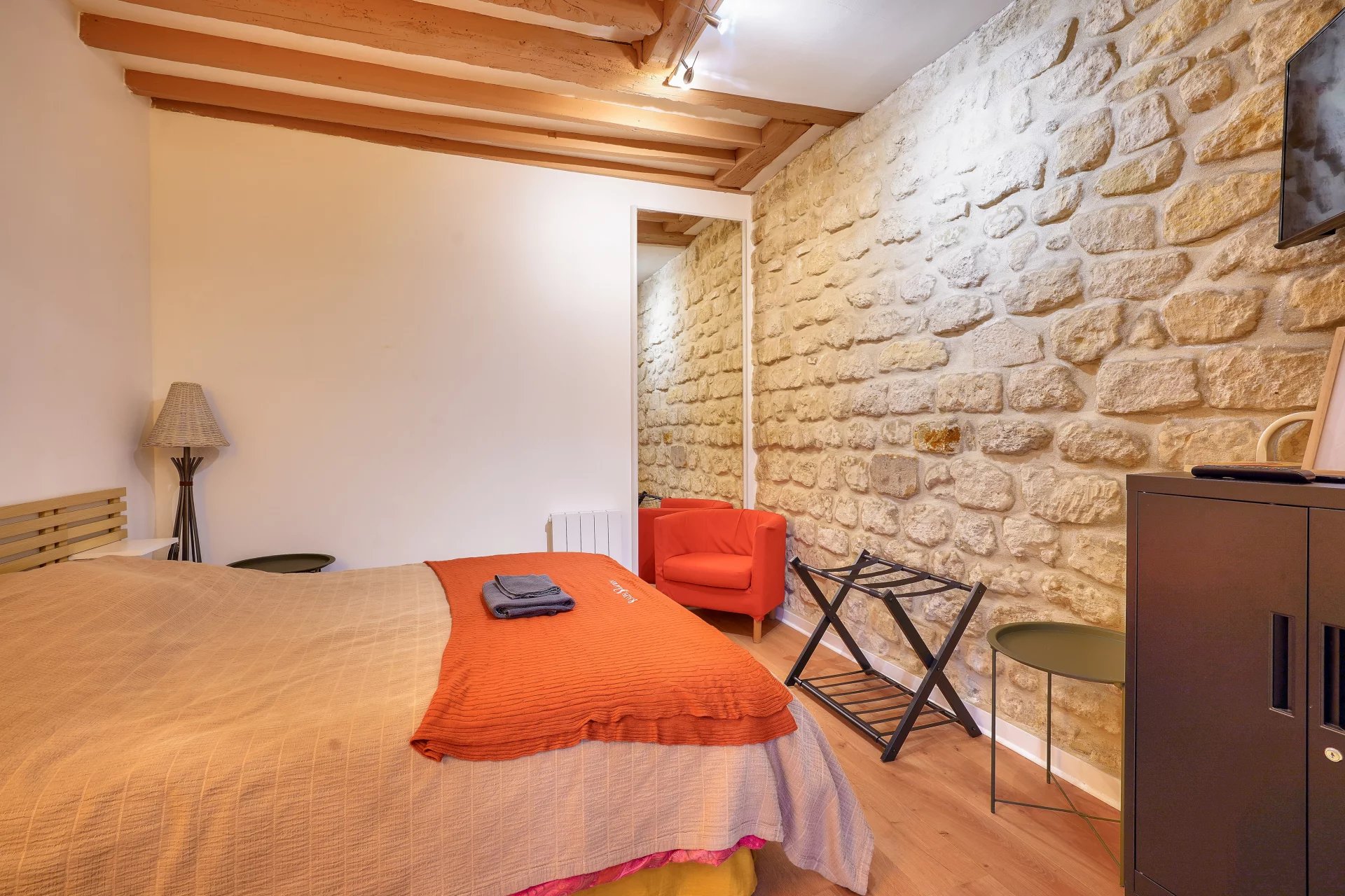 Le studio se compose d’une pièce de vie lumineuse avec grande baie vitrée donnant sur la cour, d’un espace nuit avec mur en pierres apparentes, d’une cuisine fonctionnelle et d’une salle d’eau moderne.