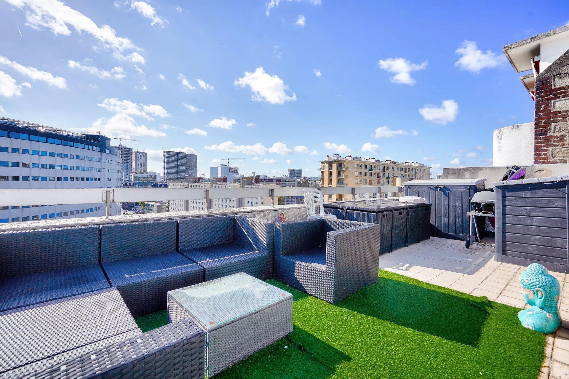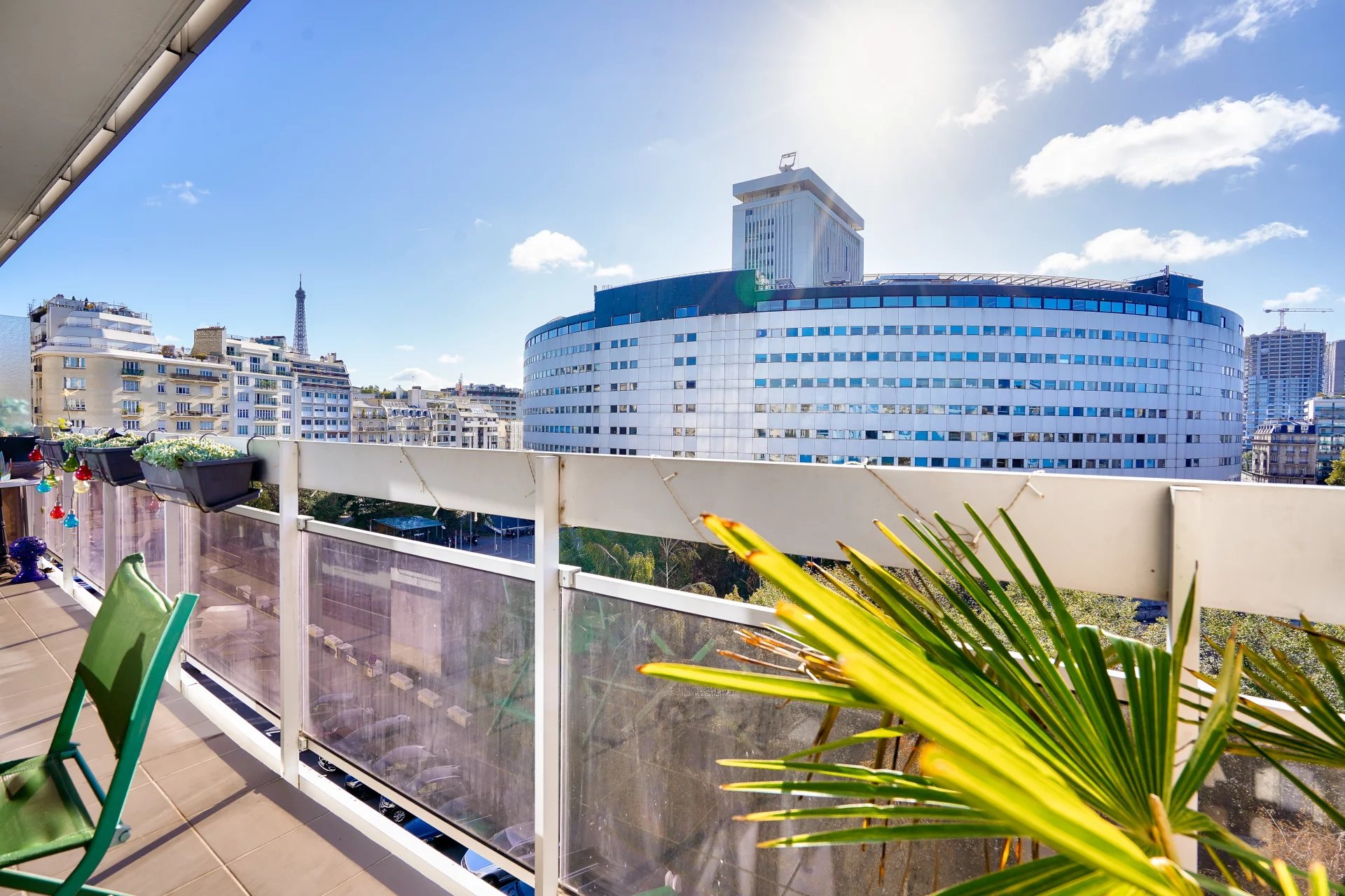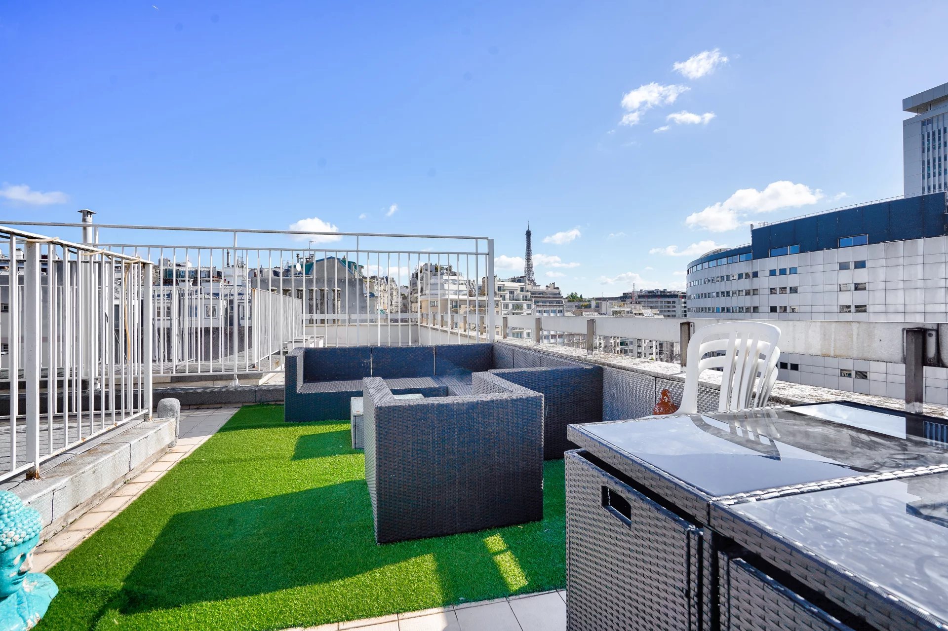 • Enfin, le rooftop accessible par l’escalier commun offre 30 m² de terrasse sans vis-à-vis, avec une vue imprenable sur la Tour Eiffel. La copropriété a approuvé les travaux permettant de créer un accès direct au toit-terrasse depuis la terrasse de l'étage inférieur.