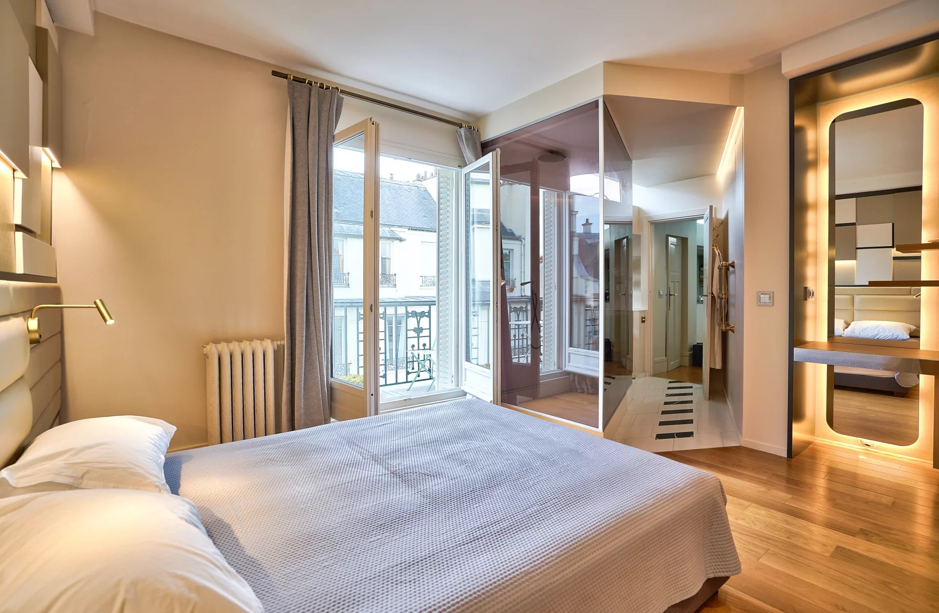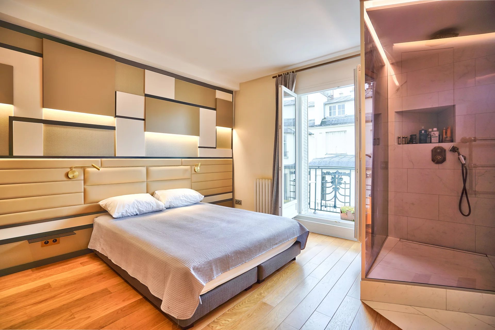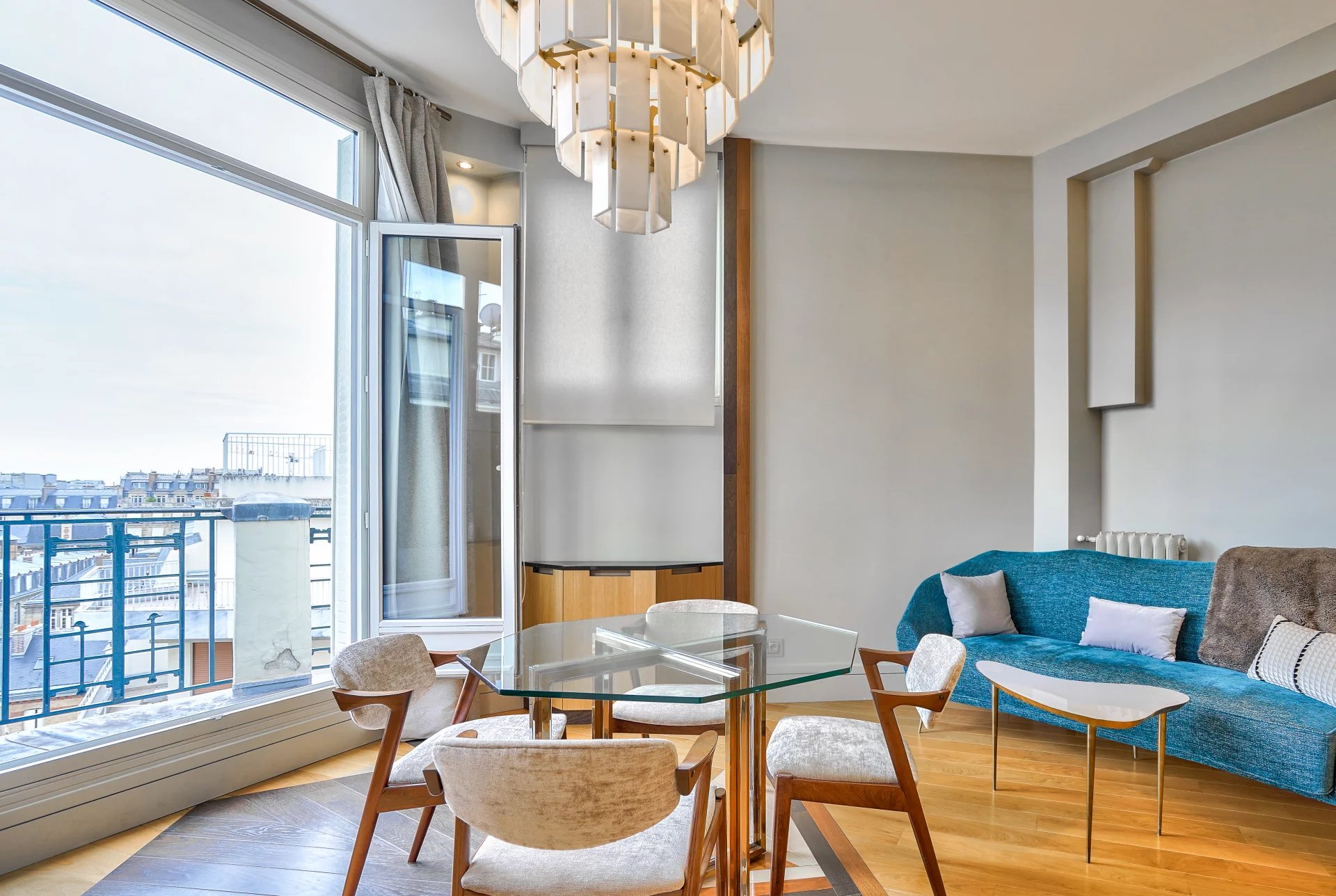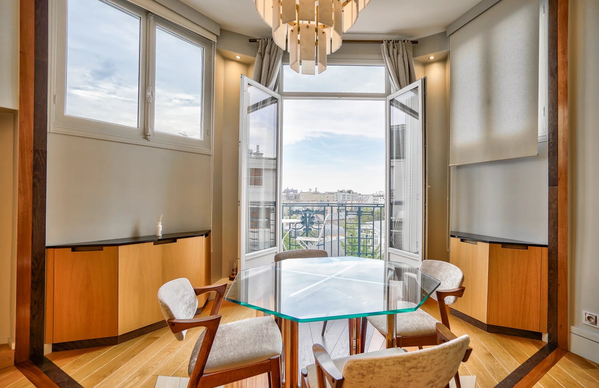 Situé à deux pas de la prestigieuse place de Mexico et du Trocadéro, ainsi que de tous les commerces de bouche de qualité, des transports et des commodités, cet appartement, rénové avec beaucoup de goût et de beaux matériaux par un architecte, est niché au 6ᵉ étage avec ascenseur d’un bel immeuble ancien. L'appartement se compose d'une entrée ouvrant sur une cuisine équipée à l'agencement optimal, d'un spacieux séjour bénéficiant d’une belle hauteur sous plafond, avec un accès direct à une terrasse offrant une vue dégagée — idéale pour profiter de chaque coucher de soleil. La chambre, aérée et au calme, dispose elle aussi d'un balcon-terrasse avec vue sur la Tour Eiffel. La salle de douche attenante à la chambre propose un espace bien-être optimisé et décoré avec soin. La double exposition nord-ouest et sud-ouest confère à cet appartement une luminosité remarquable, avec une vue dégagée sur les toits parisiens et la Tour Eiffel depuis les balcons. Une cave complète ce bien.