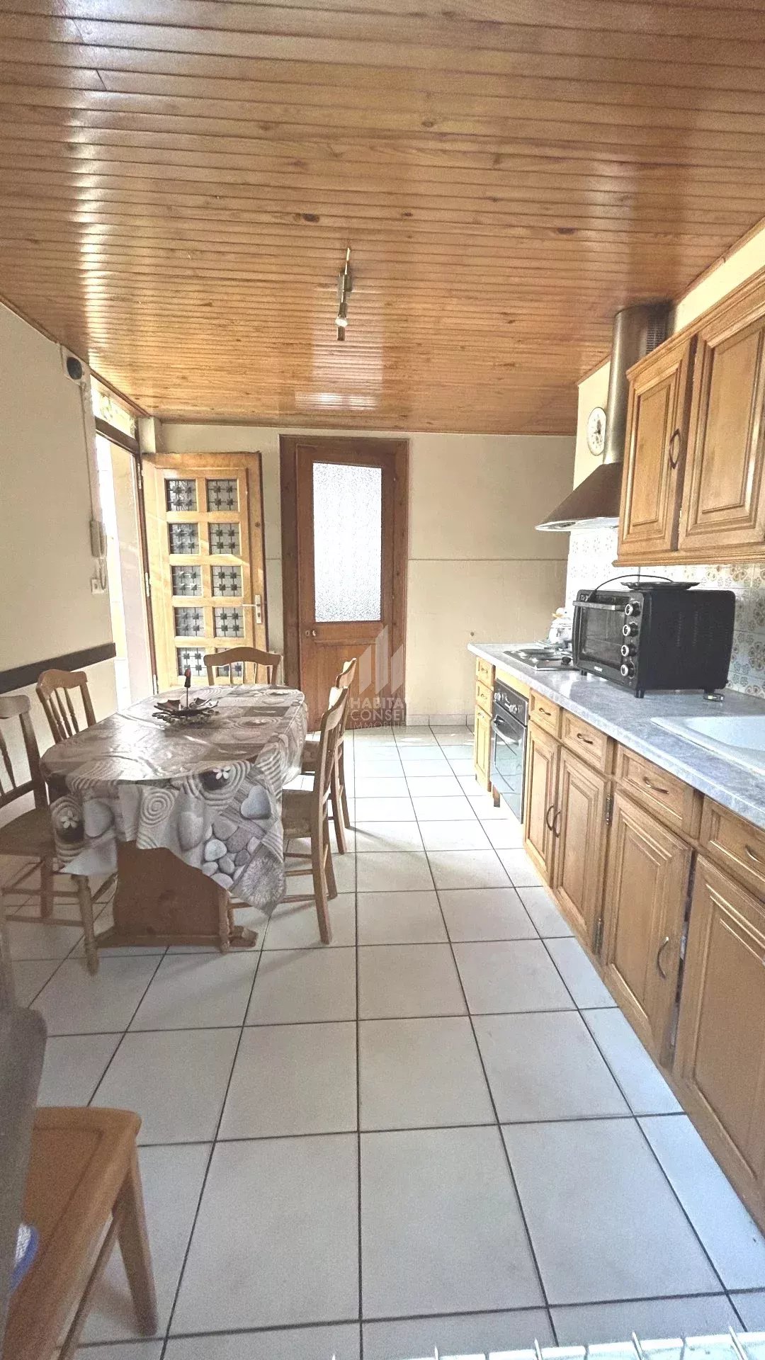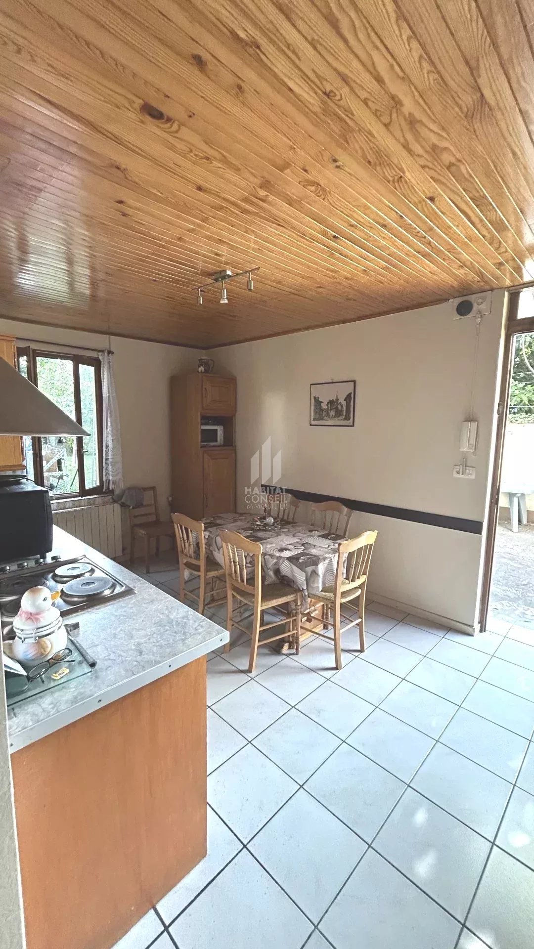 Au rez-de-chaussée : une cuisine indépendante, un salon, ainsi qu’une salle d’eau avec WC. Les menuiseries de ce niveau sont en double vitrage.