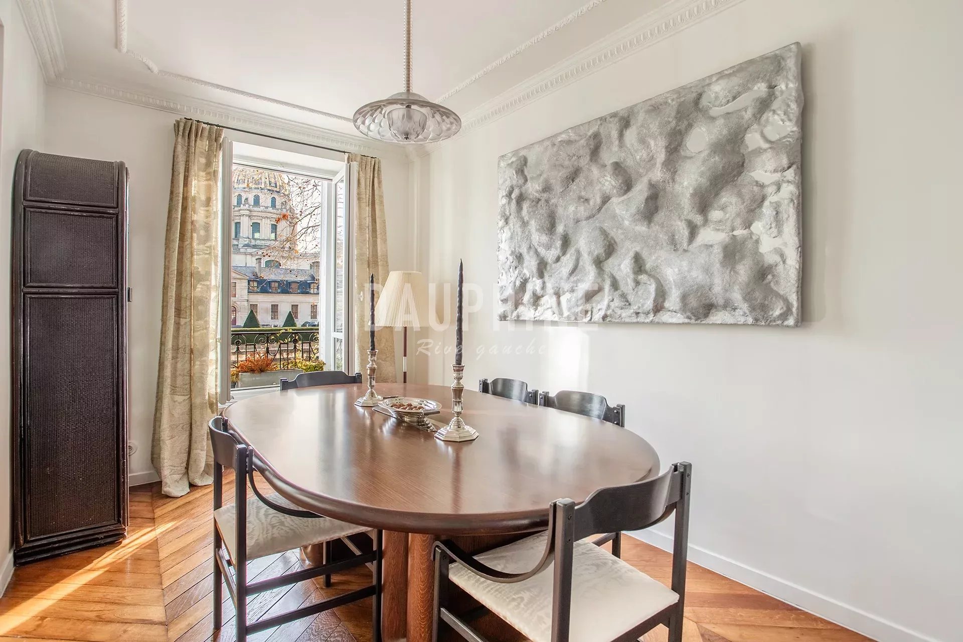 Dans le quartier emblématique des Invalides, cet appartement d’environ 56 m² bénéficie d’une vue dégagée et directe sur le dôme des Invalides, véritable présence architecturale qui accompagne le lieu au quotidien.