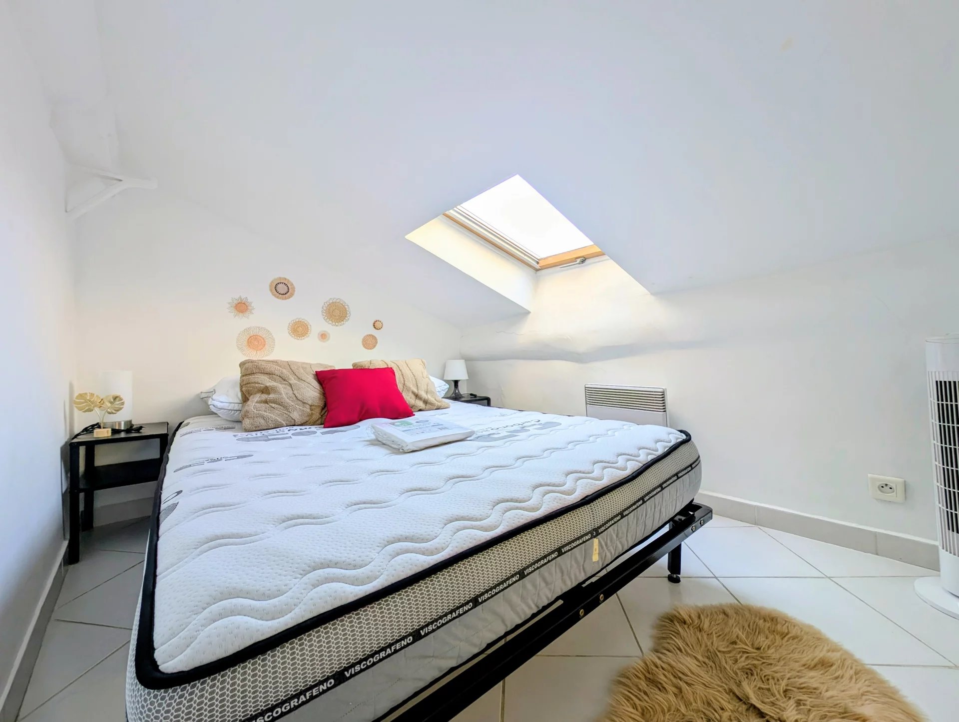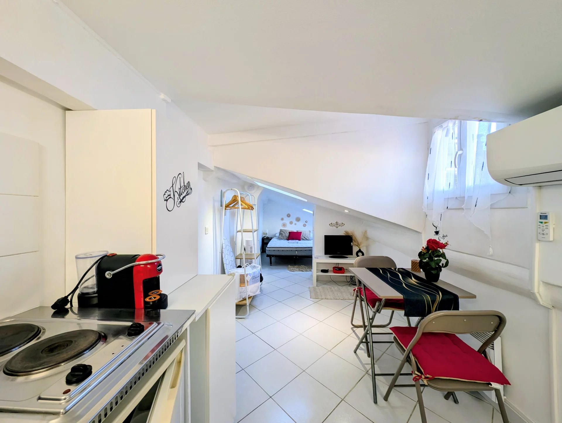 Vieux-Nice – Située au cœur de la vieille ville, à proximité immédiate de la mer, des commerces et des restaurants, cette mansarde pleine de charme se trouve dans un bel immeuble d’époque classé, sans ascenseur.