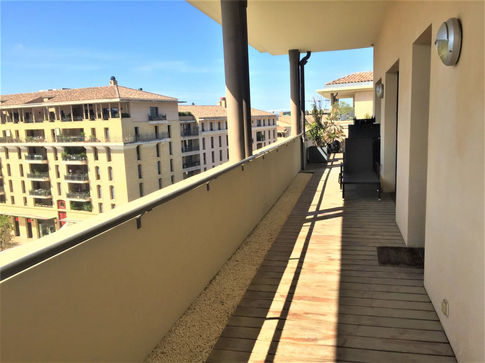 🏡 Le bien se compose : d'une entrée, d'un spacieux séjour avec cuisine équipée et aménagée, donnant sur une belle terrasse en L avec vue dégagée sur les Allées Provençales, de trois chambres dont une suite parentale avec sa salle de bain et son solarium, d'une salle d'eau et d'un WC séparé.