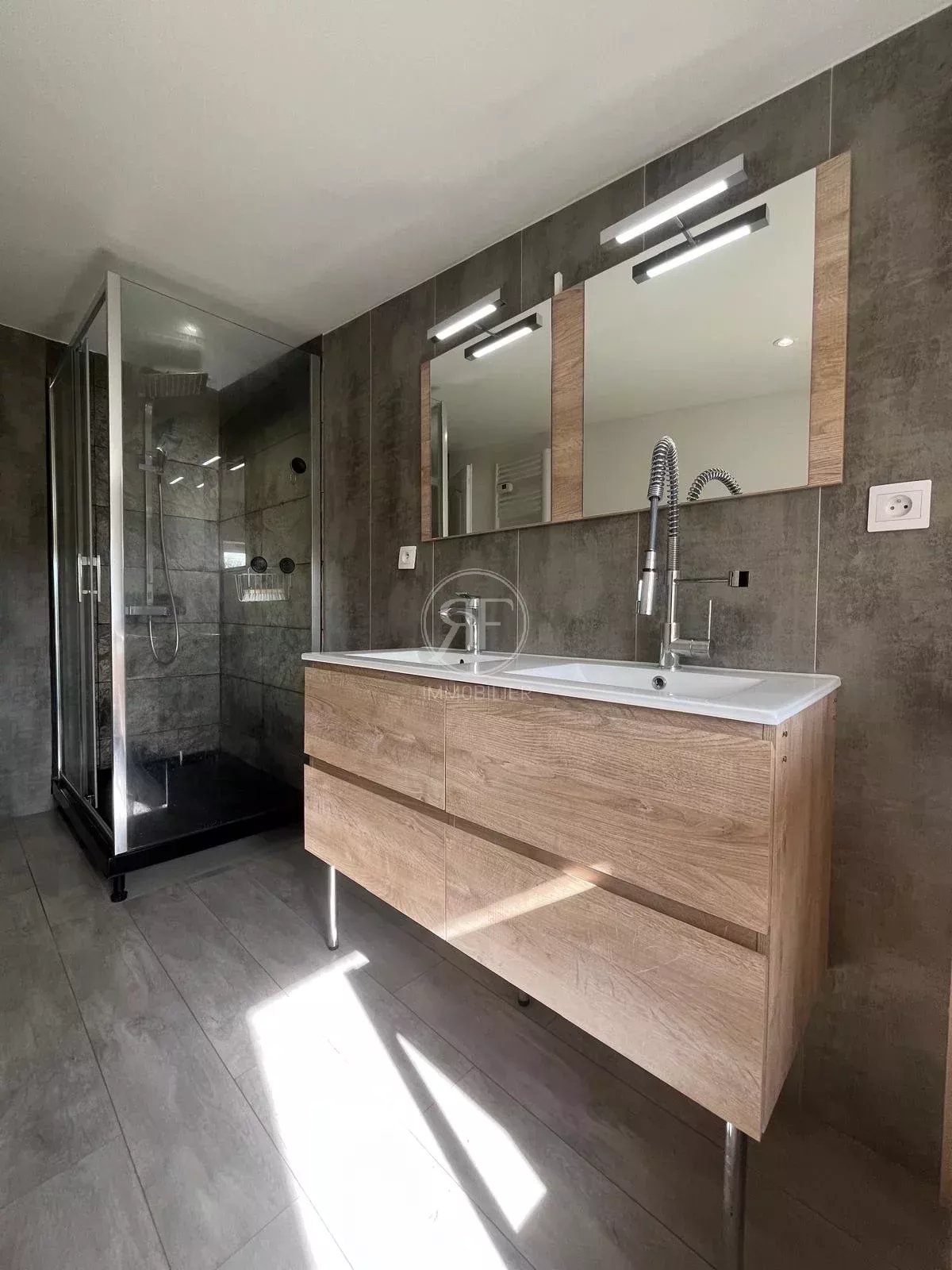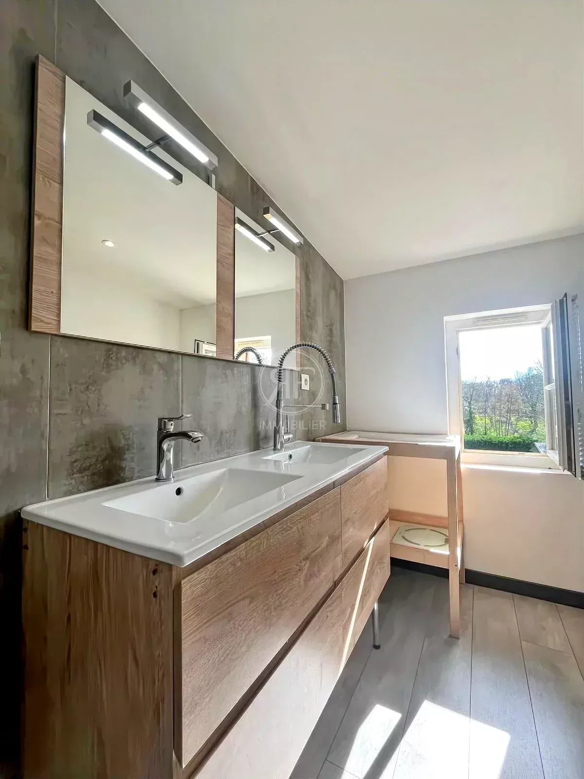 Elle se compose au RDC d'un bel espace lumineux cuisine ouverte/salle à manger (Exposition Sud) de 35m² avec sa cheminée insert donnant sur une terrasse semi-couverte.