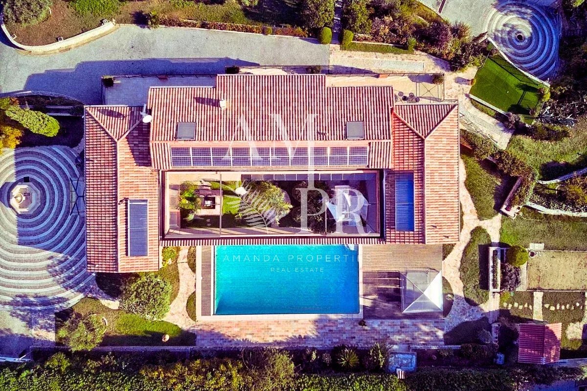 Un bijou d’architecture niché sur les hauteurs de Super Cannes. Cette somptueuse villa de 410 m² de plain-pied, édifiée en 2008, offre une vue imprenable sur la mer et le Cap d’Antibes. Un écrin de verdure et un potentiel unique Située sur un magnifique terrain plat de 5000 m², elle bénéficie d’un cadre idyllique avec piscine et possibilité de construire une seconde villa. Des volumes majestueux et un confort absolu Superbe entrée donnant sur un salon et une salle à manger aux volumes impressionnants (hauteur sous plafond de 4,50 m) Cuisine entièrement équipée avec patio 5 chambres avec salles de bains attenantes Appartement indépendant, bureau, annexes, caves et garages de 250 m² Technologie & Écologie à la pointe: Panneaux photovoltaïques & solaires Deux pompes à chaleur Isolation thermique & phonique Baies vitrées, volets et stores électriques Un bien rare où luxe, espace et innovation se rencontrent ! Contactez-nous pour une visite exclusive.