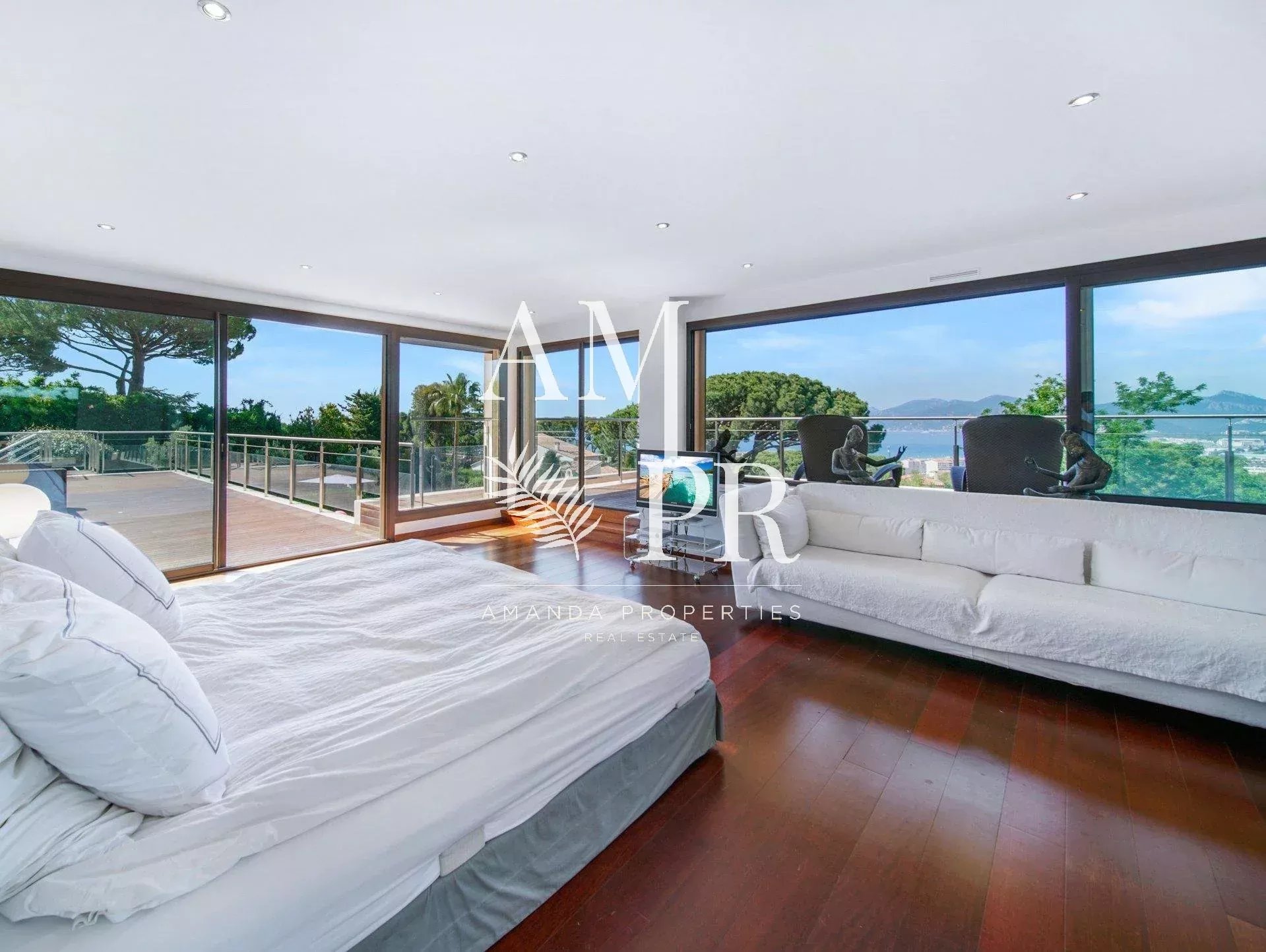 Amanda Properties propose à Cannes dans un secteur résidentiel et calme, cette splendide villa d'architecte confortablement équipée avec des prestations de standing, sauna et piscine, offrant une belle vue sur la mer les collines de l'Estérel et le coucher de soleil. Nichée sur la prestigieuse colline de la Croix des Gardes, cette villa d'architecte offre de beaux volumes intérieurs ainsi que de beaux espaces extérieures qui enchanteront vos vacances à Cannes! D'une surface d'environ 450m², elle se compose de; - un spacieux séjour/salon - une salle à manger - une cuisine entièrement équipée - une chambre parentale avec sa salle de douche et vue mer - une seconde chambre avec sa salle de bain et vue mer - un bureau avec canapé lit et sa salle de douche - un appartement indépendant avec sa cuisine, deux chambres et une salle de douche. - Pool house avec sauna Un jardin plat paysagé avec sa piscine et de nombreuses terrasses vous permettront de vous détendre et profiter pleinement du soleil de la Côte d'Azur! Parking pour véhicules à l'intérieur de la villa