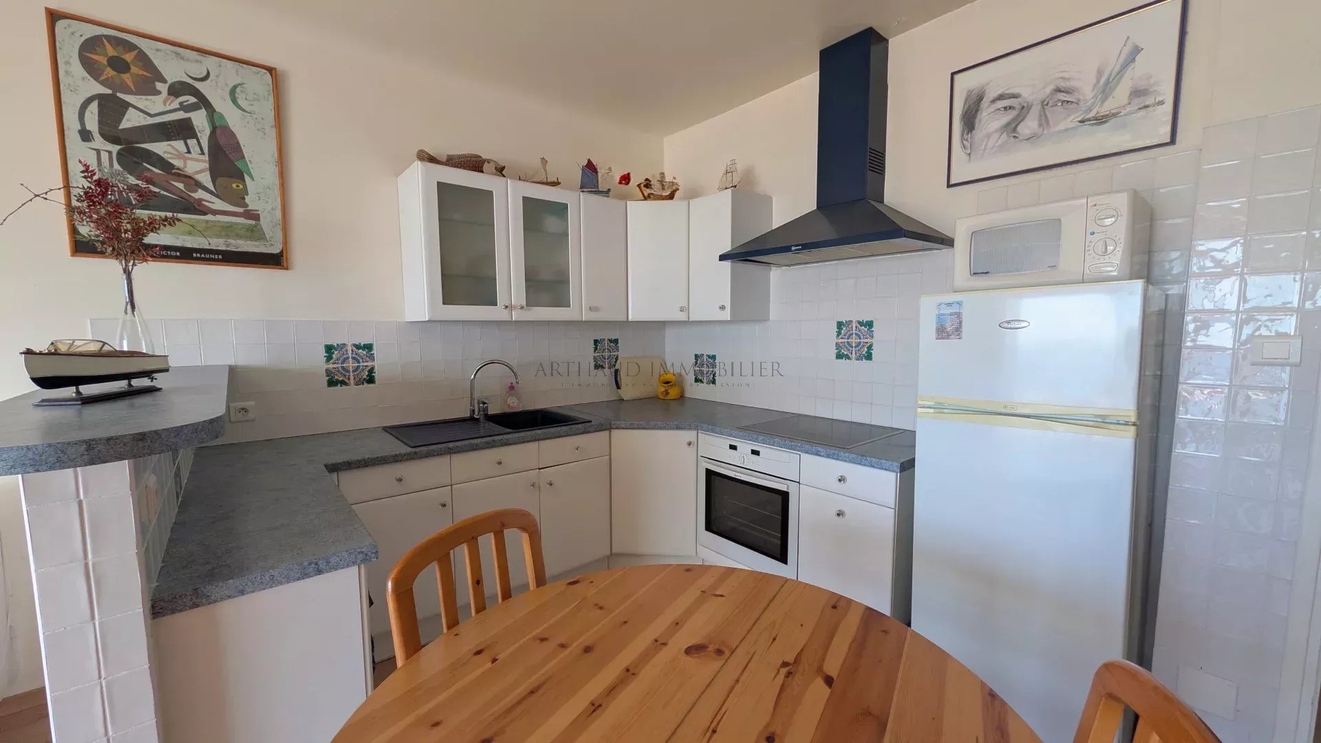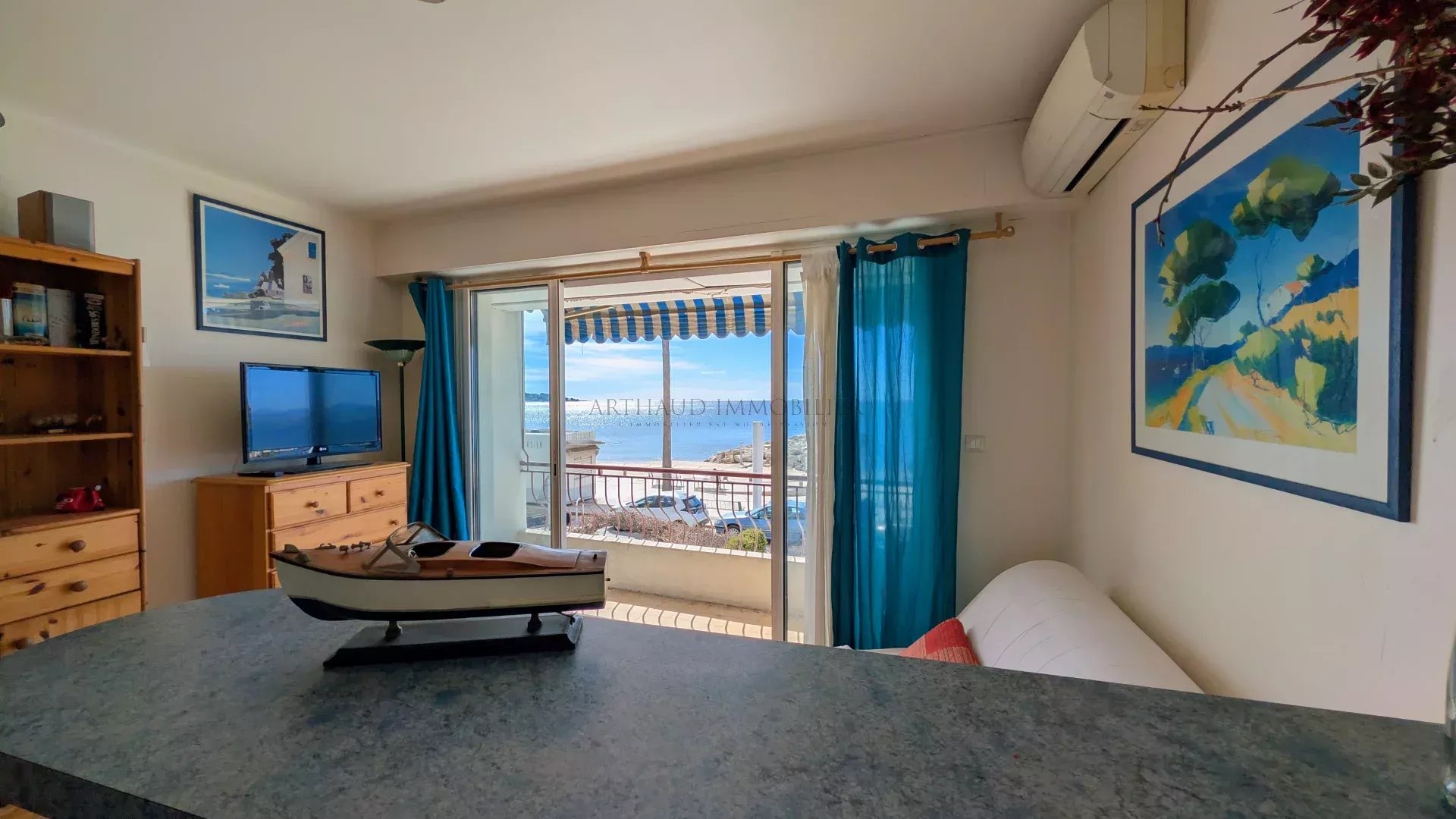 Séjour plein Sud donnant sur le balcon face mer, espace nuit indépendant (configuration petit 2 pièces), cuisine, salle d’eau et w.c.