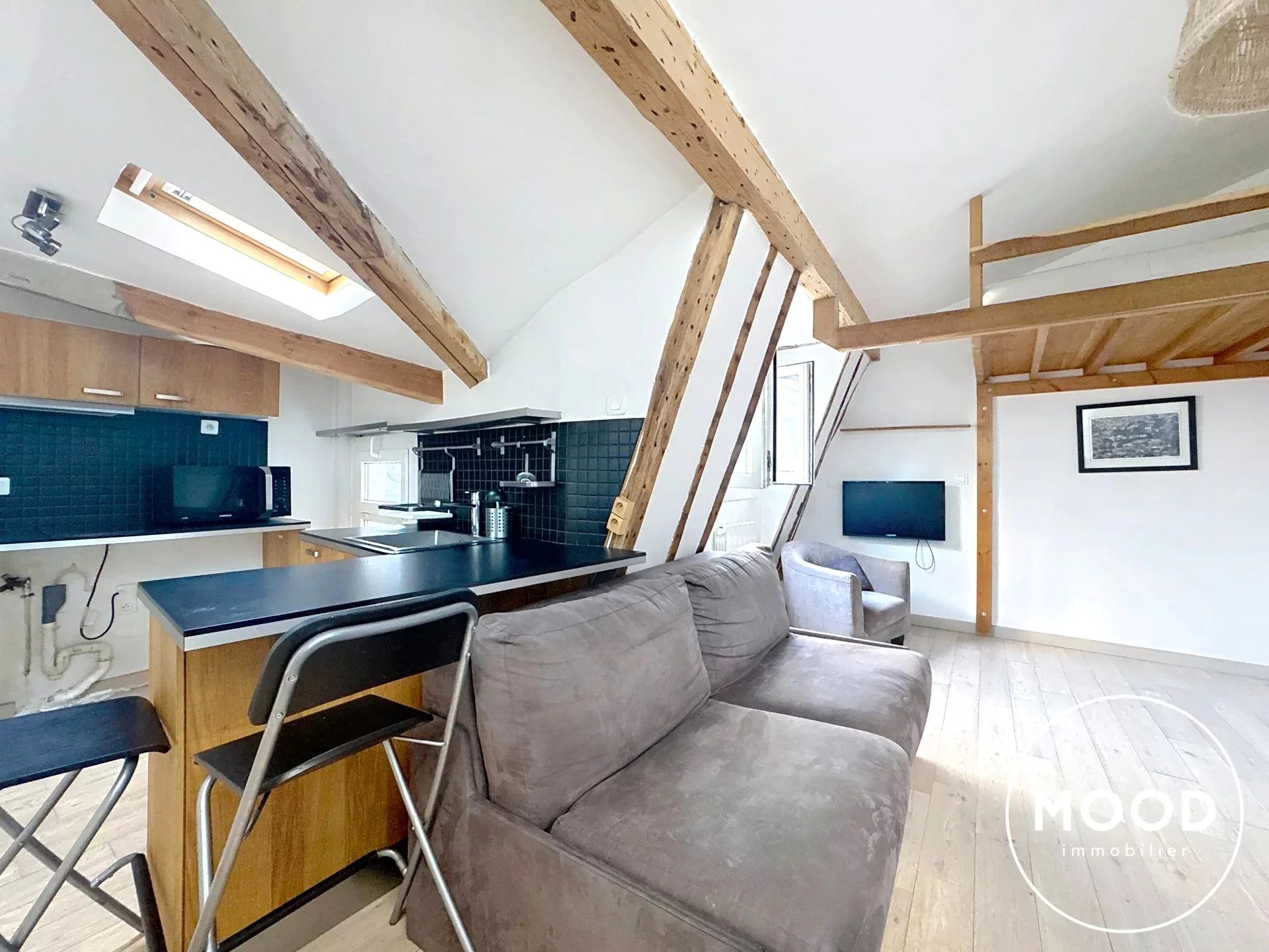 Cet appartement de 25,20 m² loi Carrez se compose d’une pièce principale avec poutres apparentes, d’une mezzanine aménagée en espace de couchage offrant une optimisation idéale de l’espace, d’une cuisine aménagée à l’entrée, d'une salle d’eau avec WC ainsi qu'un débarras privatif de 3,25m² sur le palier.