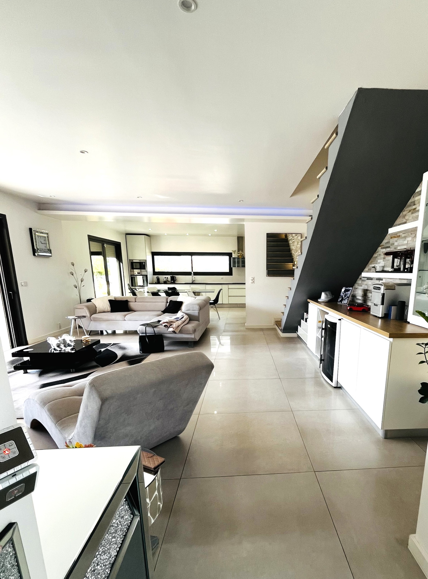 En rez de chaussée: un espace séjour salon cuisine complètement équipée de 56 M2 donnant sur une belle terrasse en partie couverte , la piscine , le jardin ..