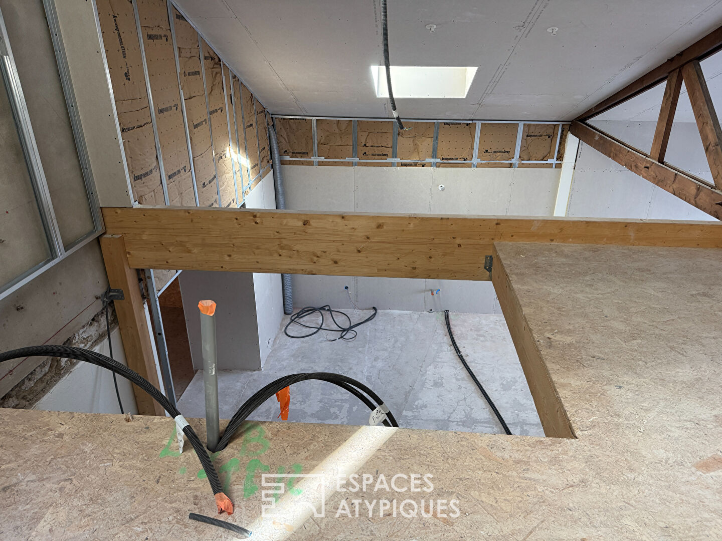 Idéalement située entre le quartier prisé de Saint-Michel et le centre-ville, cette maison en pierre d'environ 190 m², actuellement en cours de métamorphose, dévoile un potentiel architectural hors norme. Derrière sa façade traditionnelle se cache une réinterprétation résolument contemporaine des volumes, où la noblesse du bâti ancien rencontre la force d'un design "Esprit Loft" Le rez-de-chaussée s'ouvre sur une entrée menant à la pièce maîtresse du lieu : un spectaculaire open-space de 130 m². Véritable ode au style industriel, cet espace est magnifié par des armatures métalliques apparentes et une hauteur sous plafond vertigineuse. La lumière y est omniprésente, portée par une baie vitrée aux dimensions exceptionnelles. Véritable trait d'union entre intérieur et extérieur, elle s'ouvre sur une terrasse carrelée aux allures de jardin d'hiver, offrant un écrin de quiétude absolu en pleine ville. Selon les plans , le projet propose la configuration suivante : Au rez-de-chaussée : une entrée fonctionnelle dessert une vaste cuisine ouverte sur un salon séjour. Pour une vie facilitée de plain-pied, ce niveau offre une pièce pouvant faire office de chambre ou de bureau, ainsi qu'une buanderie et un WC indépendant A l'étage : Une mezzanine survole l'espace, créant une jonction audacieuse entre une suite parentale avec dressing et salle d'eau nichée dans la partie loft et deux chambres avec salle d'eau et WC situées dans la partie ancienne de la demeure. Pour les projets les plus ambitieux, le dernier niveau révèle une vaste pièce sous combles. Entièrement aménageable, cet espace laisse libre cours à vos envies : atelier d'artiste, bureau inspirant ou chambres additionnelles. Avec l'isolation, les huisseries, l'électricité et le placo déjà réalisés, le gros oeuvre est amorcé. Ce bien n'attend plus que vos finitions pour révéler tout son éclat. Le garage permet de servir d'espace de stockage . Ce lieu de vie singulier est une opportunité rare pour les amoureux de volumes bruts et d'architecture de caractère souhaitant personnaliser une rénovation d'exception. Ce bien est non soumis au DPE Les informations sur les risques auxquels ce bien est exposé sont disponibles sur le site Géorisques : georisques.gouv.fr Isabelle DEVOS (EI) Agent Commercial - Numéro RSAC : 518 348 032 - SAINT-BRIEUC.