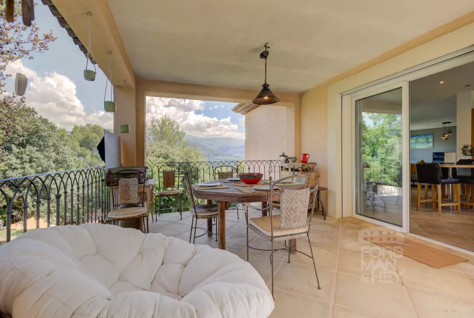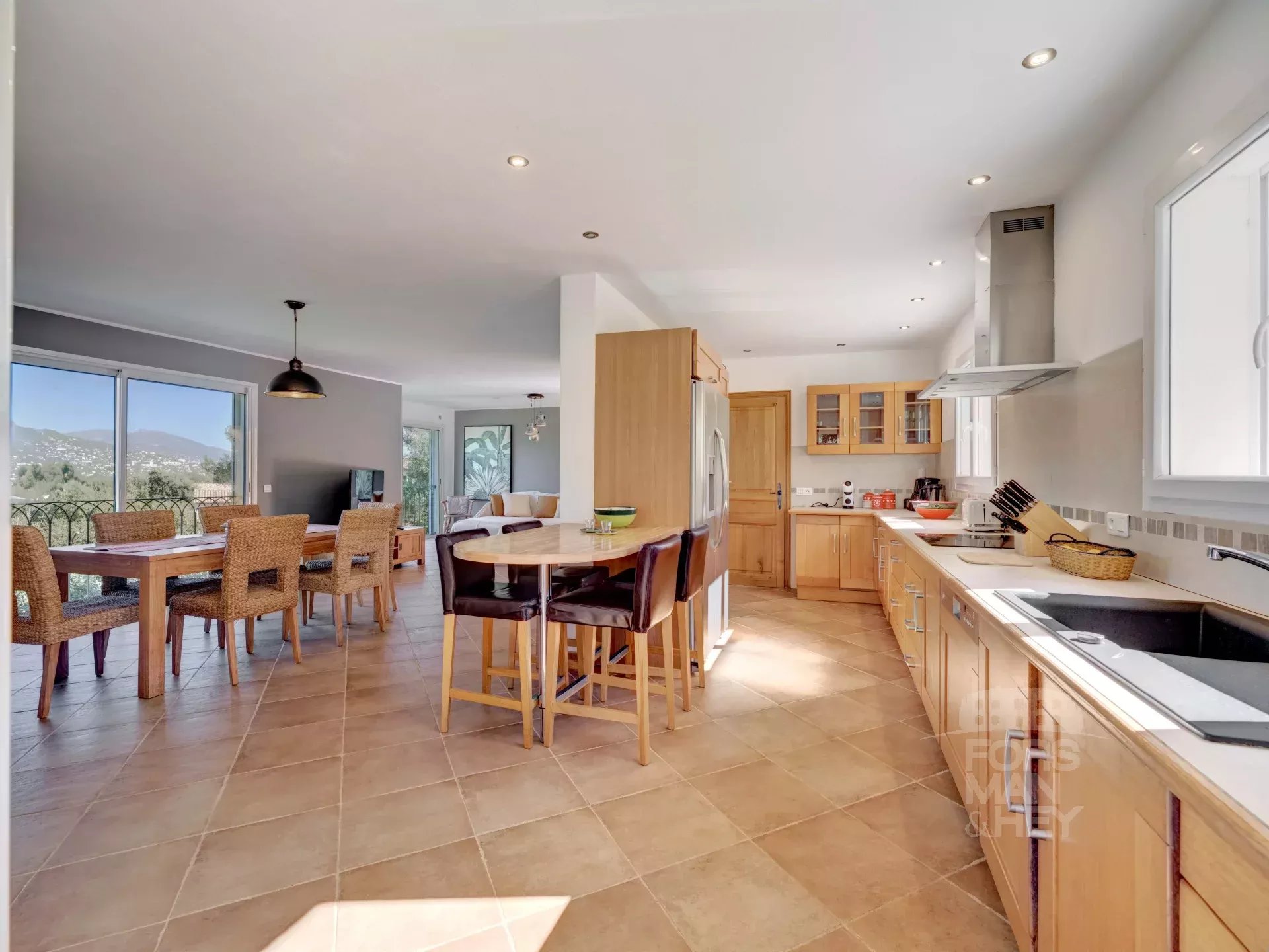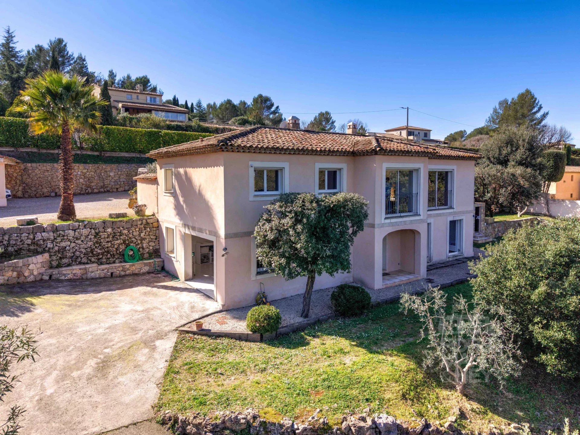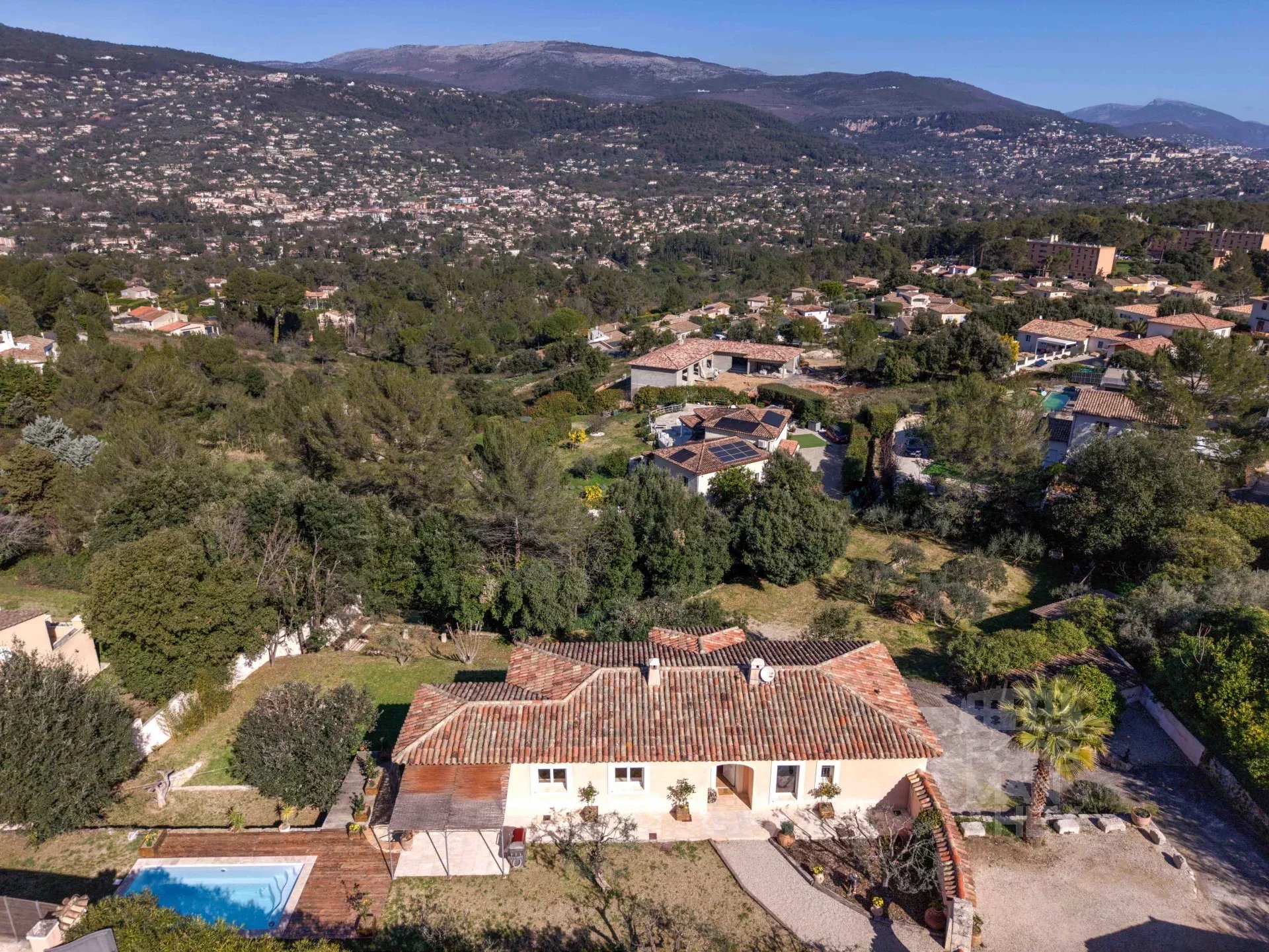 Elle comprend 4/5 chambres, 3 salles de bains, des espaces de réception spacieux et une cuisine entièrement équipée prolongée par une terrasse couverte 3 saisons. Le grand garage double pourrait facilement être transformé en studio indépendant. La propriété bénéficie également d'une nouvelle piscine, de nombreuses places de parking et d'un grand terrain offrant la possibilité de construire une deuxième villa/maison d'amis en toute indépendance.