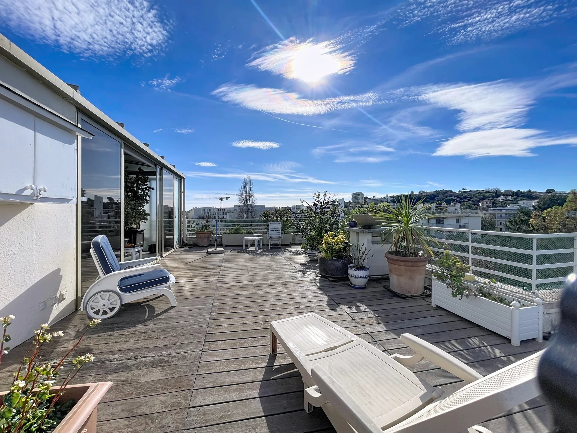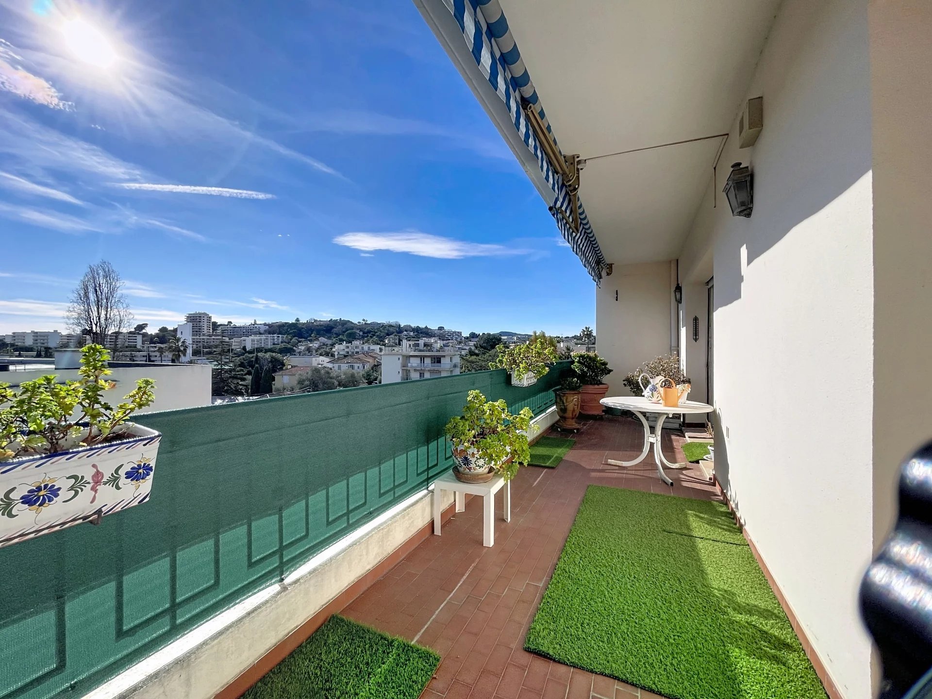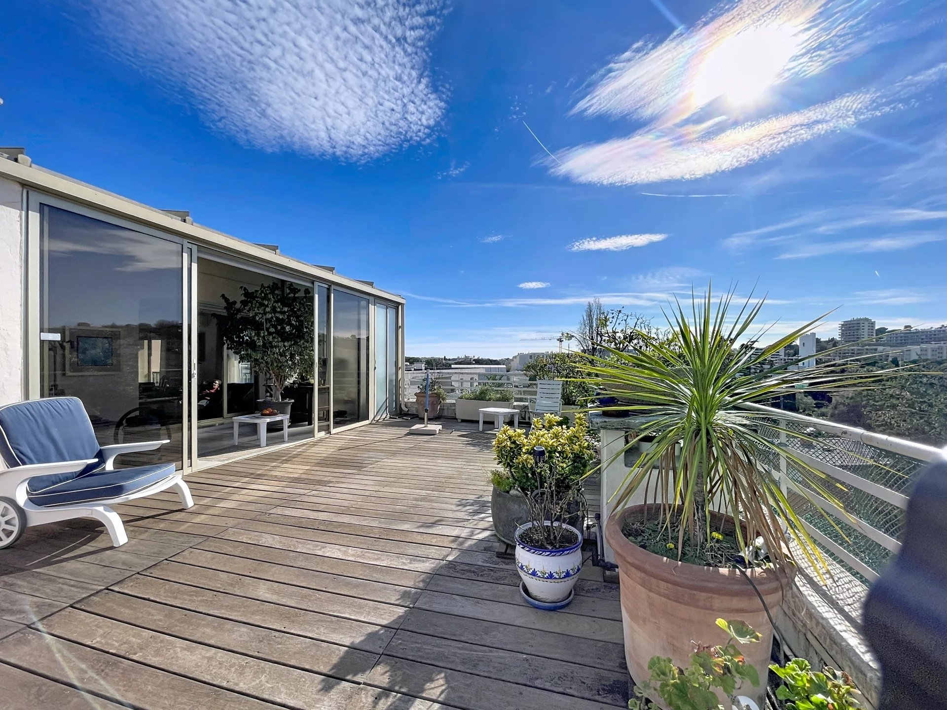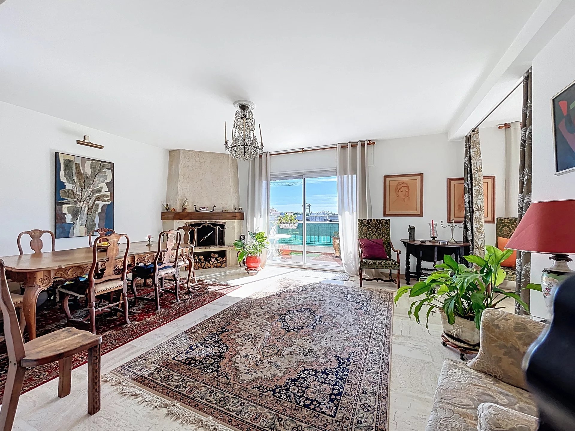 Co-exclusivité. Rare sur le marché. Situé dans une petite copropriété avec ascenseur, proche des commerces et du centre-ville d'Antibes, appartement traversant de 3/4 pièces d'une superficie de 154 m2 en 4ème et dernier étage avec balcons et terrasses sur 3 cotés, dont la principale et magnifique terrasse de 65 m2 avec vue montagnes et vue latérale sur la mer. Cet appartement bénéficie d'une triple exposition ce qui le rend très lumineux. Il se compose d'une entrée, d'une salle à manger avec cheminée donnant sur une terrasse exposée Sud, d'un salon avec véranda qui ouvre sur la grande terrasse orientée ouest, d'une spacieuse cuisine avec balcon orienté nord, d'une chambre avec salle d'eau et WC, d'une 2ème chambre avec salle de bains, 2 WC indépendants. Nombreux rangements. L'appartement est situé au calme. Une cave, un parking et un garage complètent parfaitement le bien. Possibilité de le transformer en 4 pièces, très beaux volumes. *** Bien en copropriété. 56 lots principaux. Quote-part des charges environ 300 euros par mois. Pas de procédure connue en cours. Les informations sur les risques auxquels ce bien est exposé sont disponibles sur le site Géorisques : georisques.gouv.fr