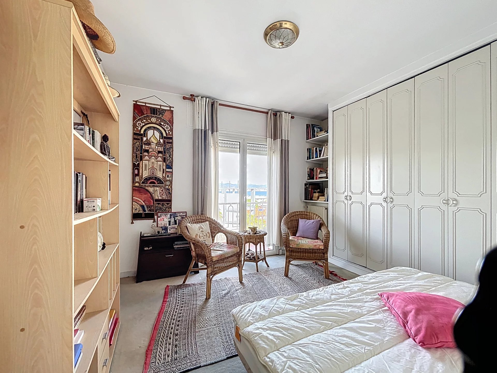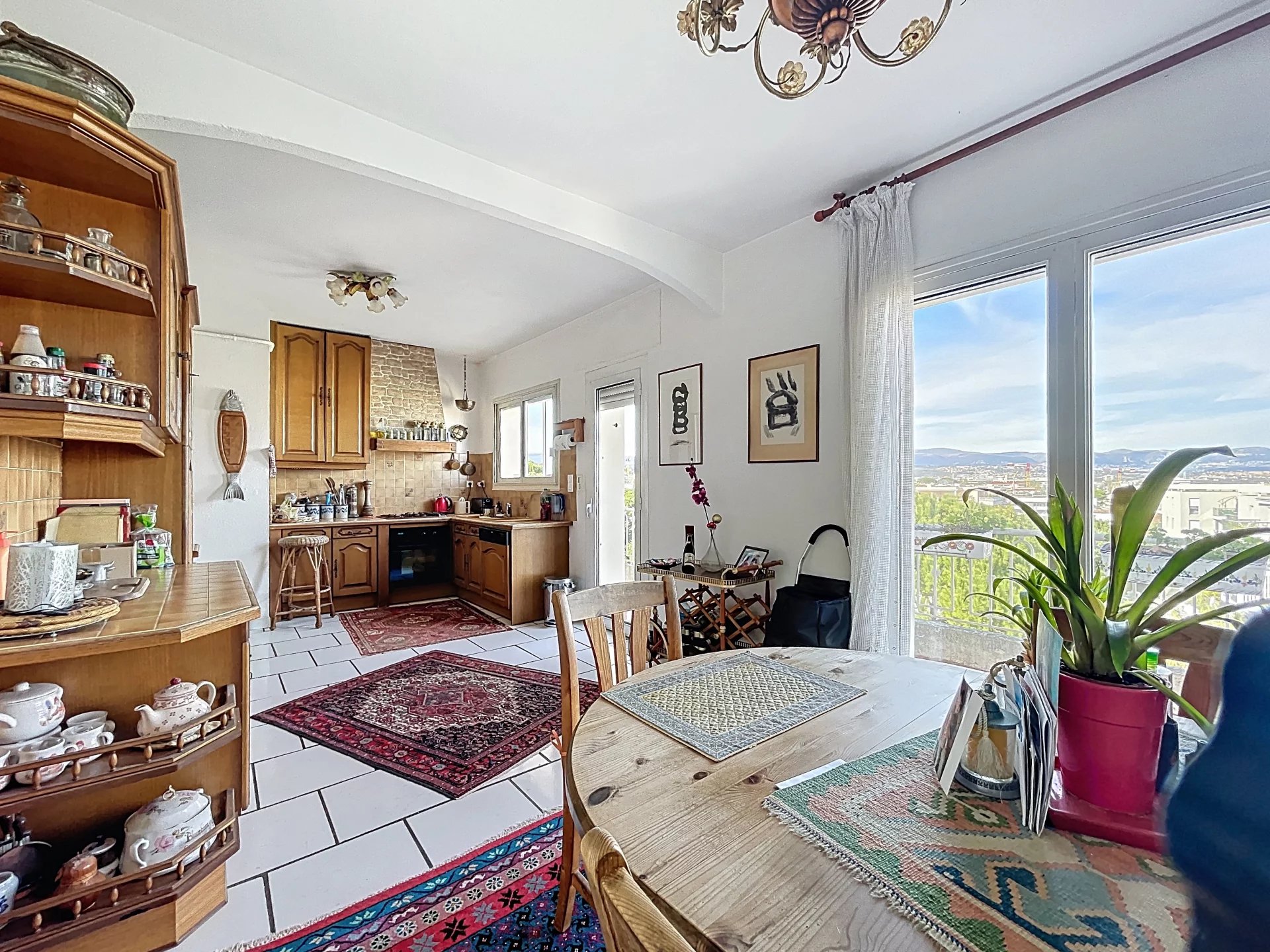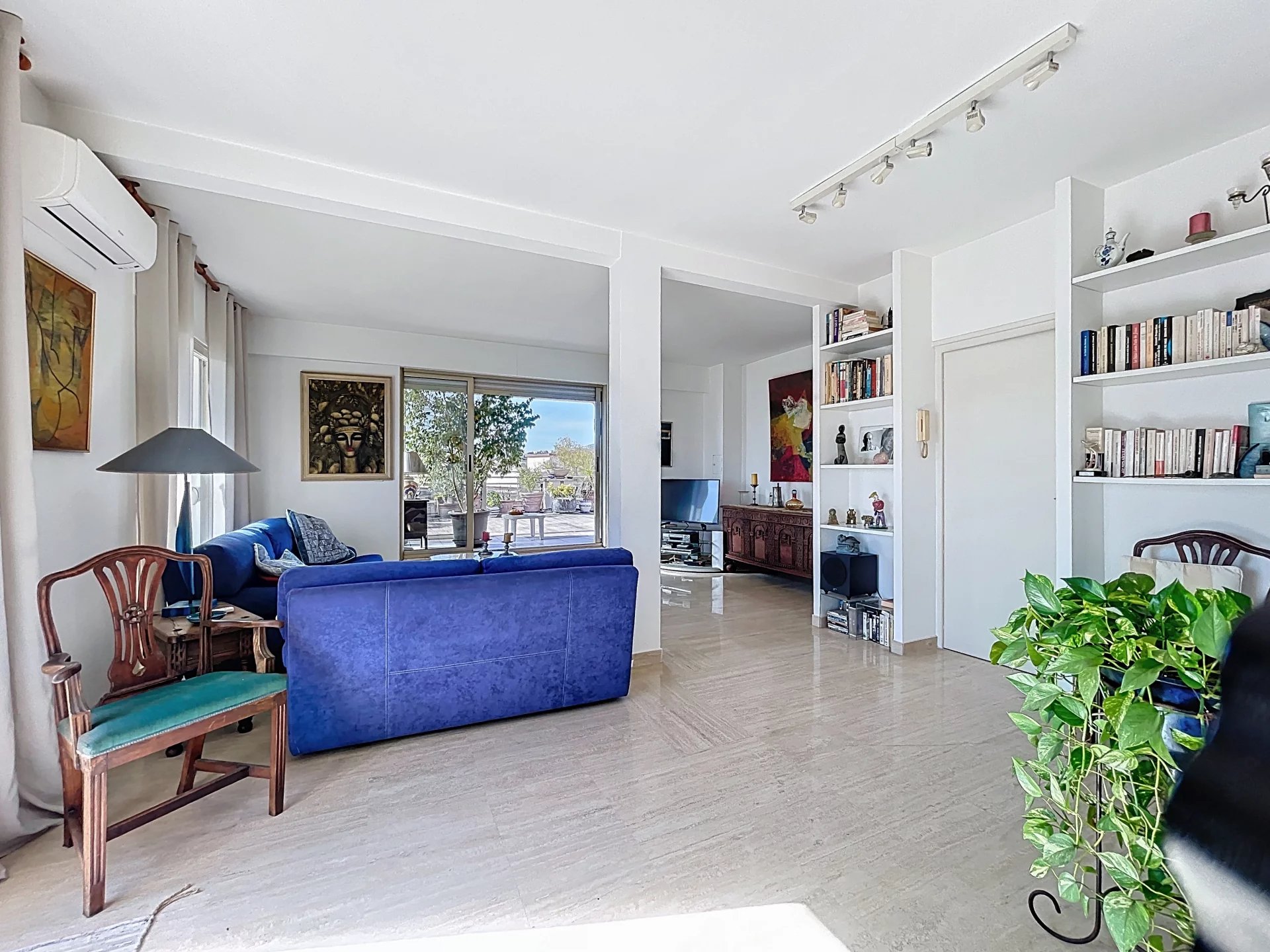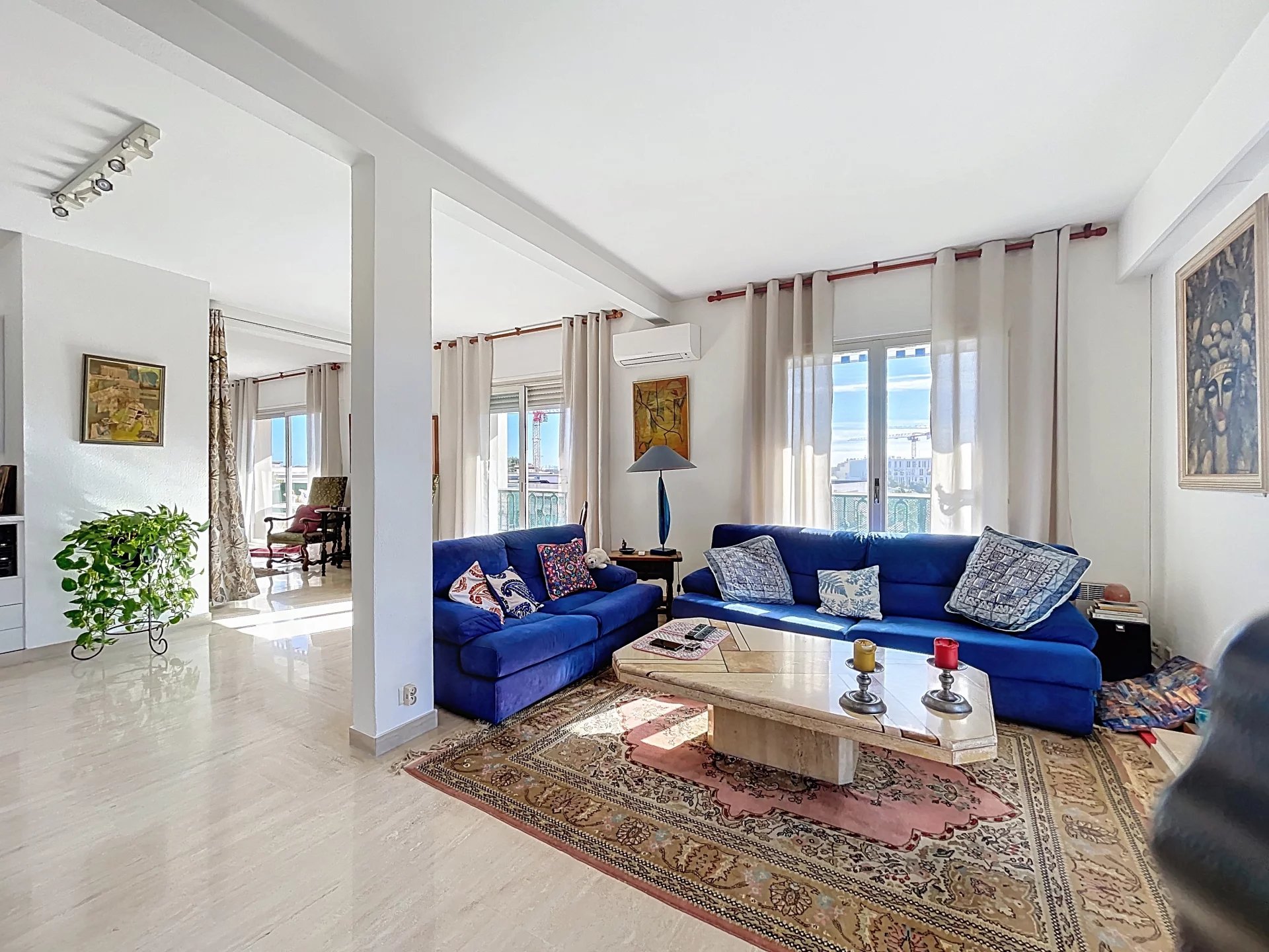 Co-exclusivité. Rare sur le marché. Situé dans une petite copropriété avec ascenseur, proche des commerces et du centre-ville d'Antibes, appartement traversant de 3/4 pièces d'une superficie de 154 m2 en 4ème et dernier étage avec balcons et terrasses sur 3 cotés, dont la principale et magnifique terrasse de 65 m2 avec vue montagnes et vue latérale sur la mer. Cet appartement bénéficie d'une triple exposition ce qui le rend très lumineux. Il se compose d'une entrée, d'une salle à manger avec cheminée donnant sur une terrasse exposée Sud, d'un salon avec véranda qui ouvre sur la grande terrasse orientée ouest, d'une spacieuse cuisine avec balcon orienté nord, d'une chambre avec salle d'eau et WC, d'une 2ème chambre avec salle de bains, 2 WC indépendants. Nombreux rangements. L'appartement est situé au calme. Une cave, un parking et un garage complètent parfaitement le bien. Possibilité de le transformer en 4 pièces, très beaux volumes. *** Bien en copropriété. 56 lots principaux. Quote-part des charges environ 300 euros par mois. Pas de procédure connue en cours. Les informations sur les risques auxquels ce bien est exposé sont disponibles sur le site Géorisques : georisques.gouv.fr