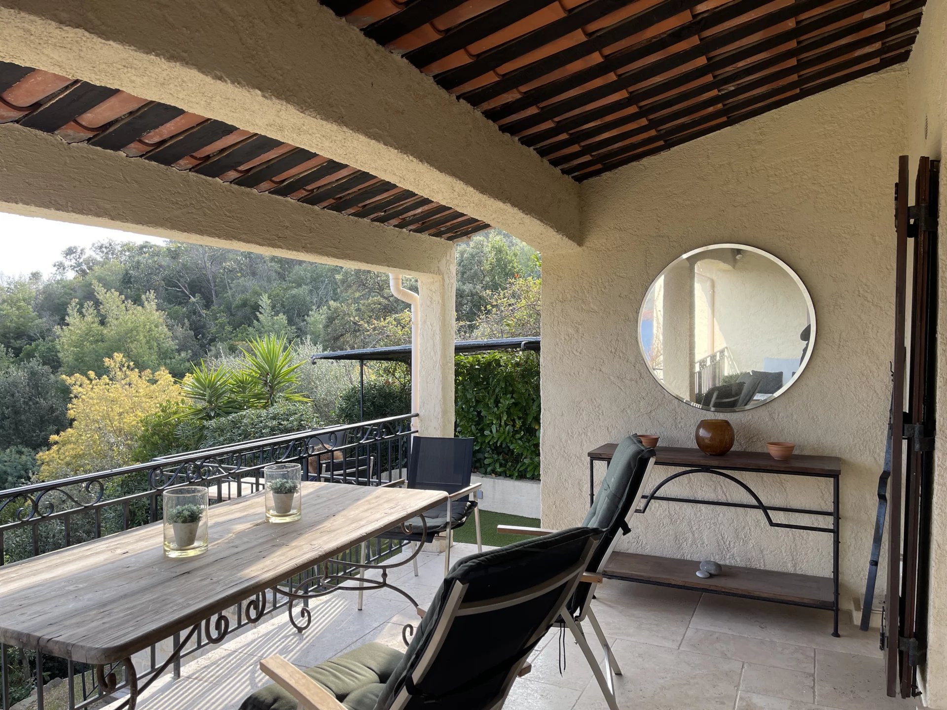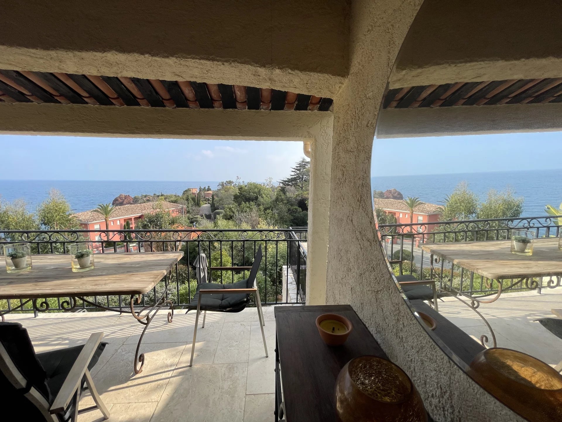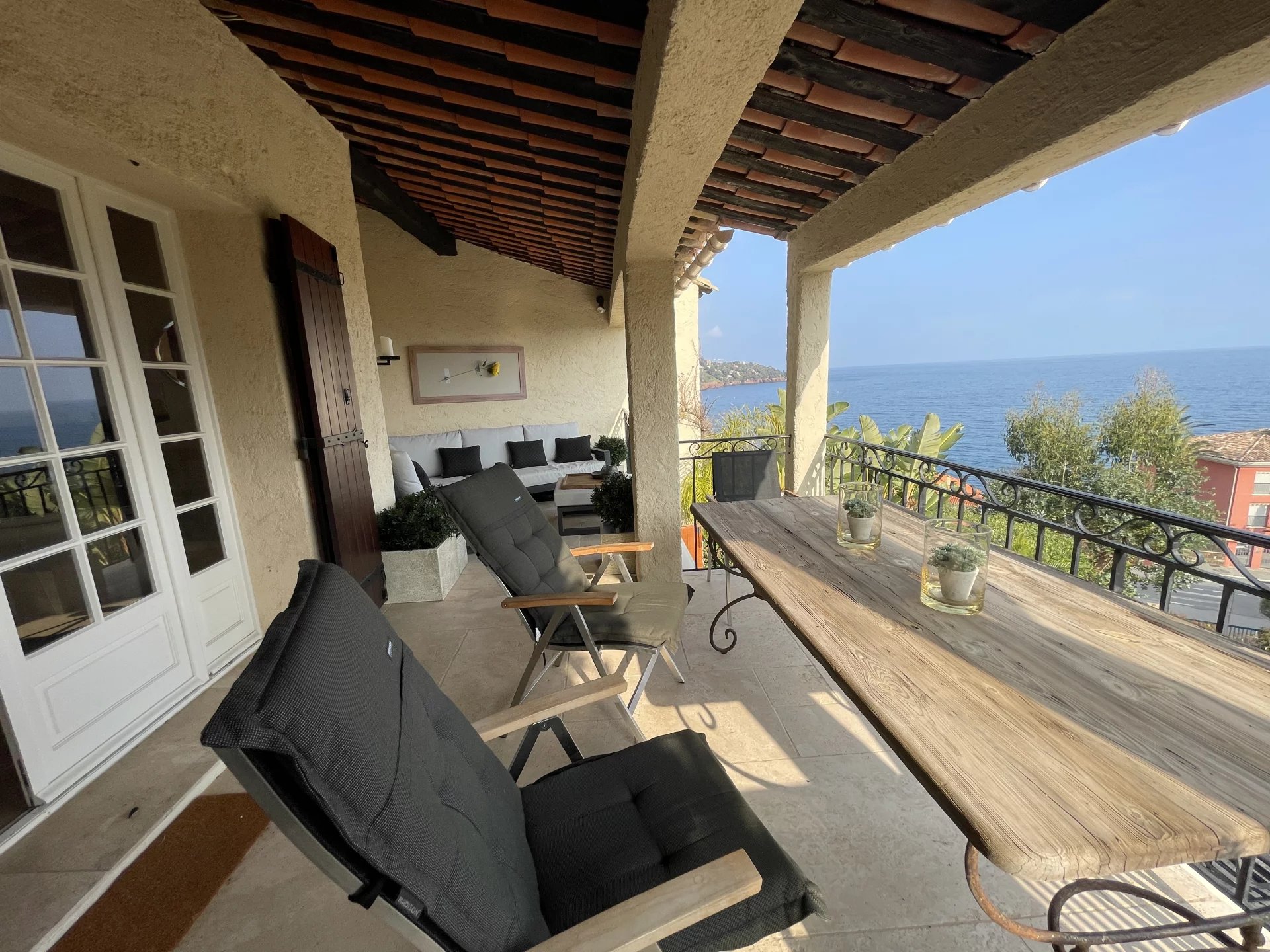 EN EXCLUSIVITE : En domaine privé et sécurisé à Théoule-sur-Mer, côté Miramar Figueirette à 5 minutes à pieds de la plage et du port, voici un luxueux havre de paix vue mer panoramique, rénové avec des matériaux sobres, haut de gamme et intemporels. Les volumes s'harmonisent pour la séduction. Les espaces se conjuguent sur 125 m² en deux appartements réunis avec terrasses. Deux cuisines équipées, deux salles de douche dont une avec hammam, un salon avec une cheminée décorative réconfortante, un séjour haut sous plafond, deux terrasses vue mer avec un barbecue Weber gaz. Au niveau inférieur : un puits de lumière andalou. Une cuisine équipée. Une chambre "vénitienne" avec un intime store drapé électrique et une ambiance cosy avec un poële à bois, une discrète salle de douche. Equipements : volets en bois et électriques, stores électriques, adoucisseur d'eau, chauffage au sol au rez-de-jardin. Un espace de rangement/buanderie avec un lave-linge et un sèche-linge Miele. Deux toilettes séparés à chaque étage. Grande terrasse tropicale. Douche extérieure. Eau froide incluse dans les charges. Accès piétons direct. Parking privatif. Piscine en copropriété. 5 unités de climatisation réversible. Vendu entièrement meublé. Quelques marches pour accéder au bonheur ! DPE en cours.
