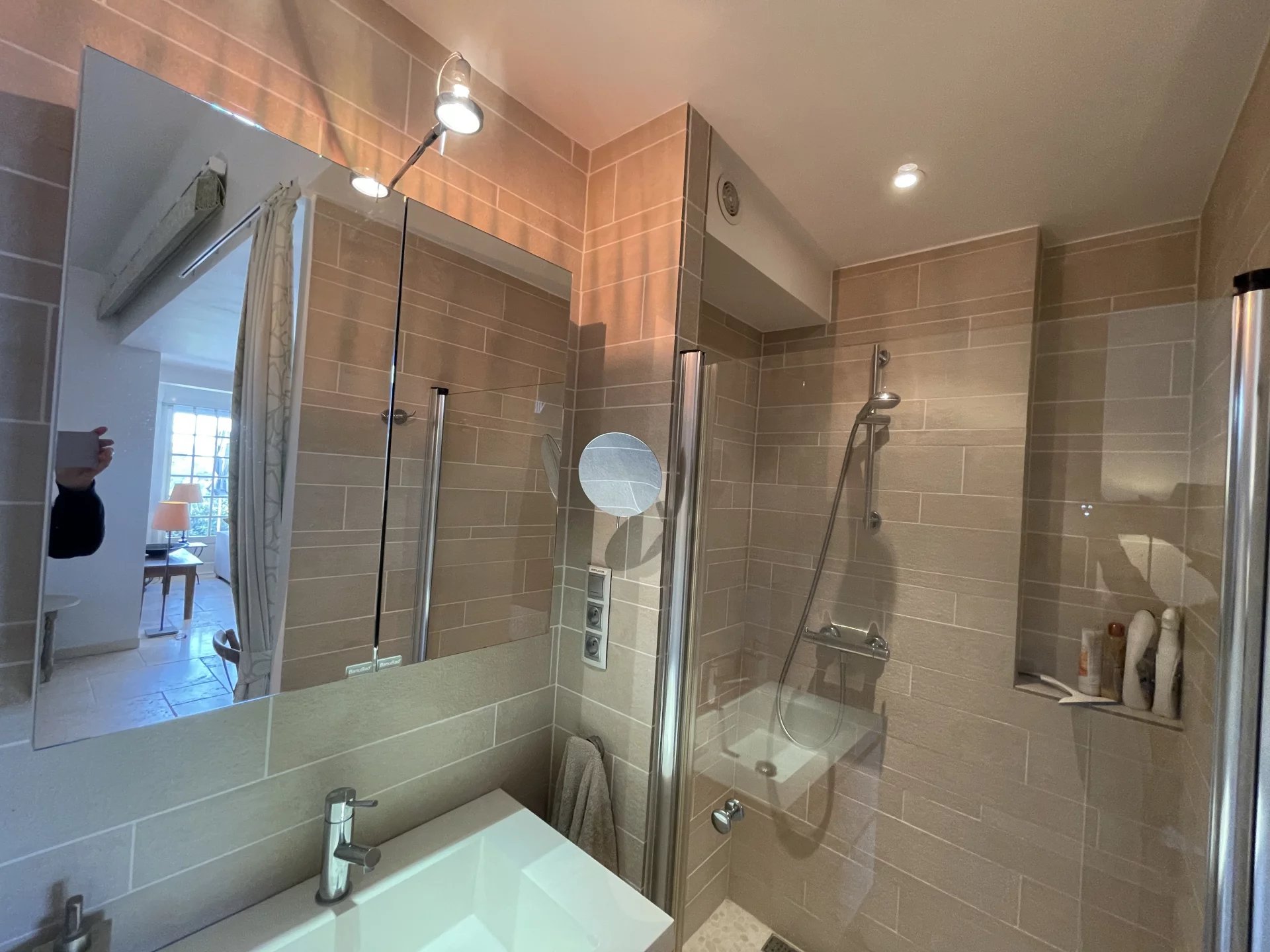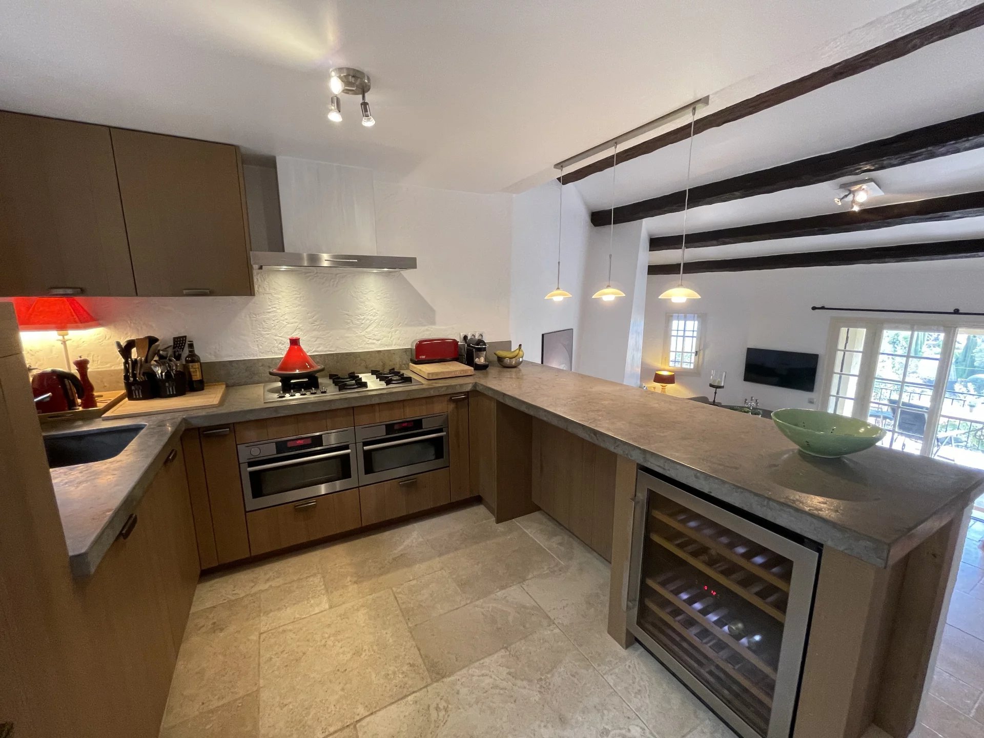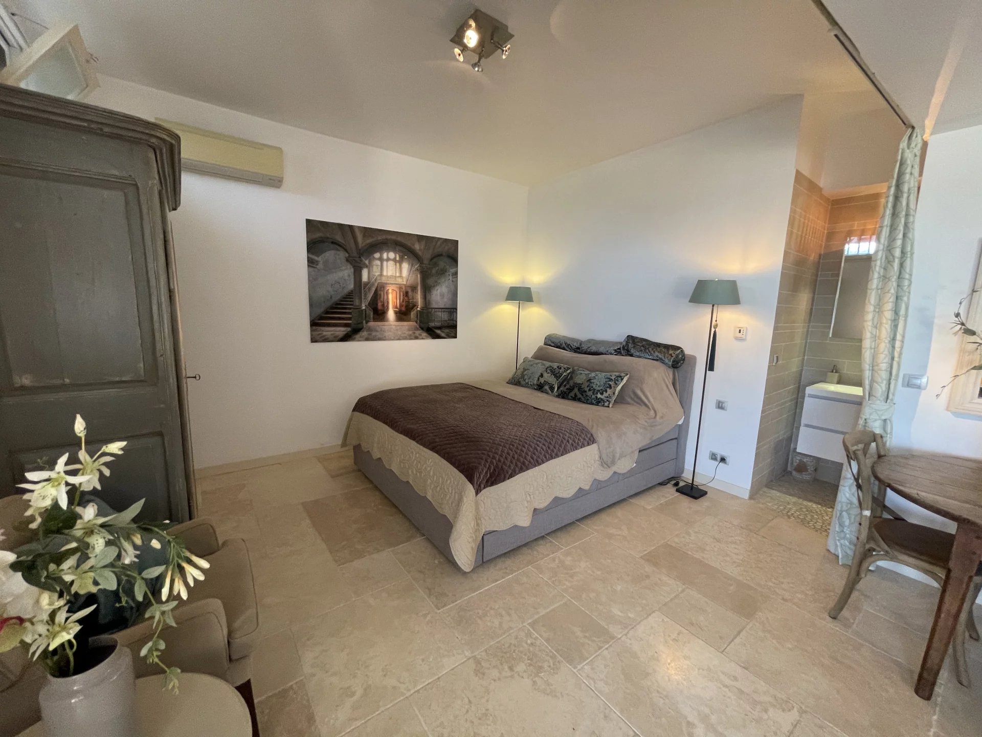 EN EXCLUSIVITE : En domaine privé et sécurisé à Théoule-sur-Mer, côté Miramar Figueirette à 5 minutes à pieds de la plage et du port, voici un luxueux havre de paix vue mer panoramique, rénové avec des matériaux sobres, haut de gamme et intemporels. Les volumes s'harmonisent pour la séduction. Les espaces se conjuguent sur 125 m² en deux appartements réunis avec terrasses. Deux cuisines équipées, deux salles de douche dont une avec hammam, un salon avec une cheminée décorative réconfortante, un séjour haut sous plafond, deux terrasses vue mer avec un barbecue Weber gaz. Au niveau inférieur : un puits de lumière andalou. Une cuisine équipée. Une chambre "vénitienne" avec un intime store drapé électrique et une ambiance cosy avec un poële à bois, une discrète salle de douche. Equipements : volets en bois et électriques, stores électriques, adoucisseur d'eau, chauffage au sol au rez-de-jardin. Un espace de rangement/buanderie avec un lave-linge et un sèche-linge Miele. Deux toilettes séparés à chaque étage. Grande terrasse tropicale. Douche extérieure. Eau froide incluse dans les charges. Accès piétons direct. Parking privatif. Piscine en copropriété. 5 unités de climatisation réversible. Vendu entièrement meublé. Quelques marches pour accéder au bonheur ! DPE en cours.
