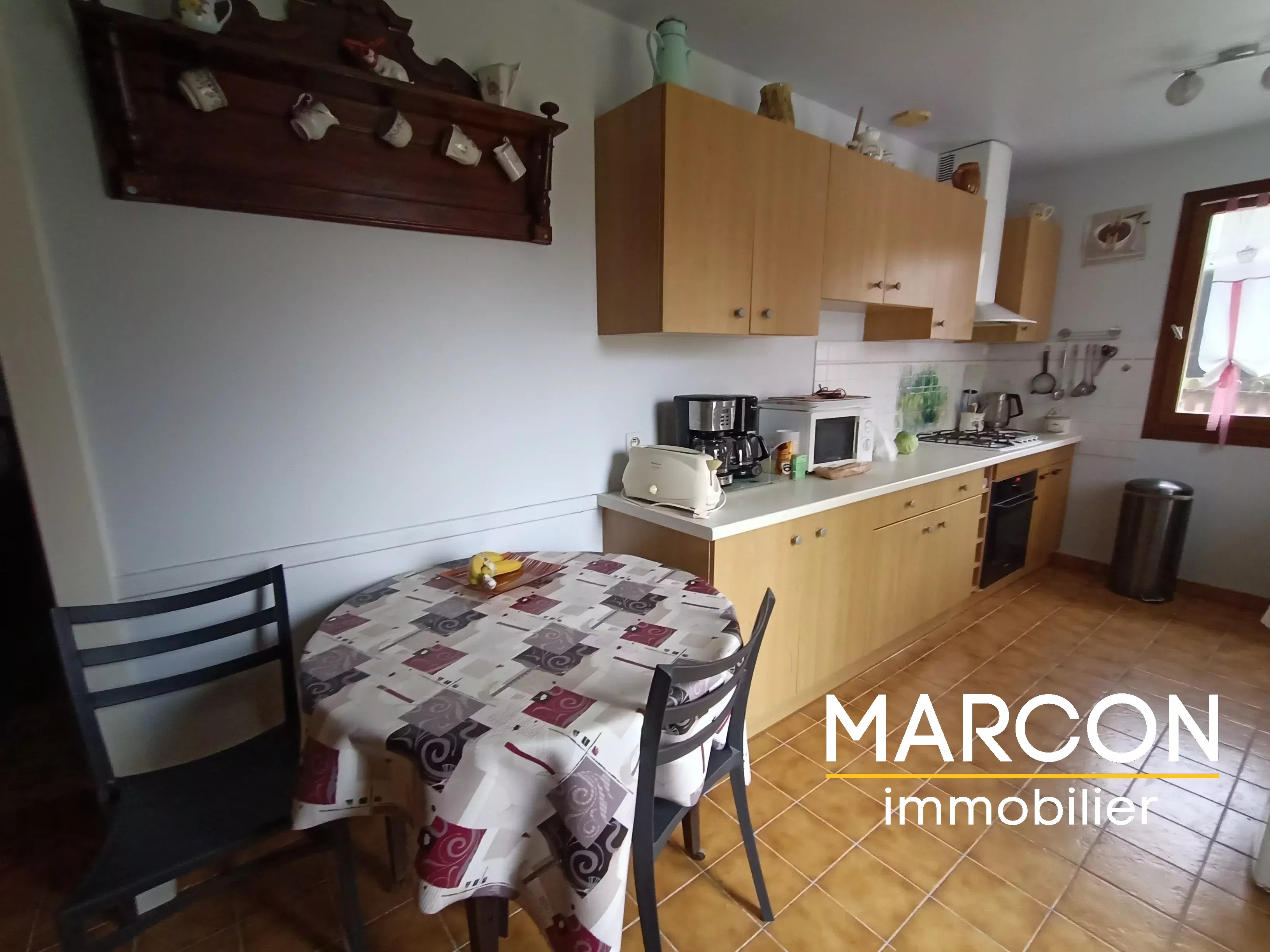 Dès l'arrivée en rez-de-chaussée en partie sur cave: vous serez séduit par une grande pièce de vie chaleureuse avec salon-salle à manger et une cheminée ouverte avec son four à pains. Les poutres au plafond ajoutent un charme authentique à cet espace.