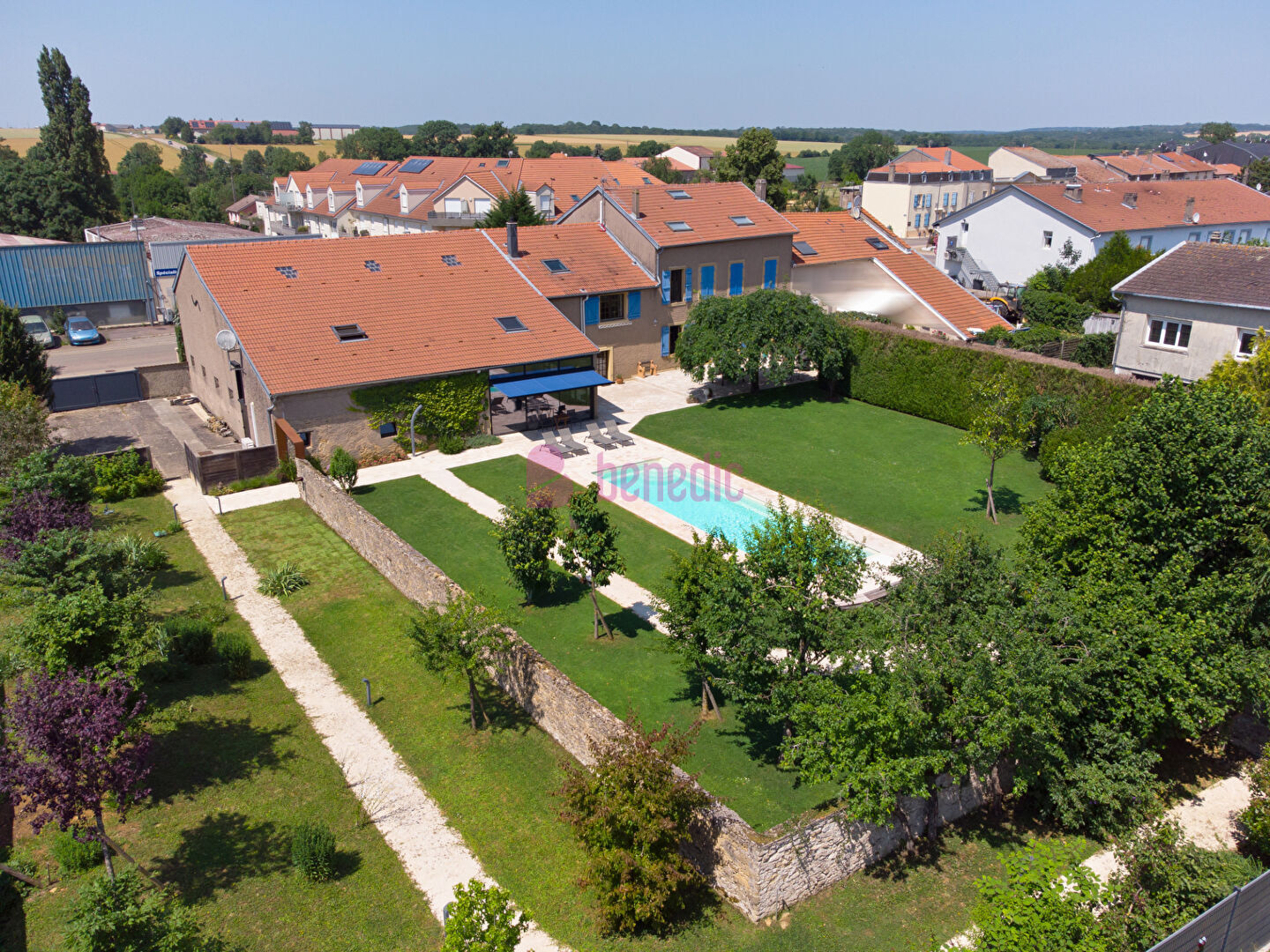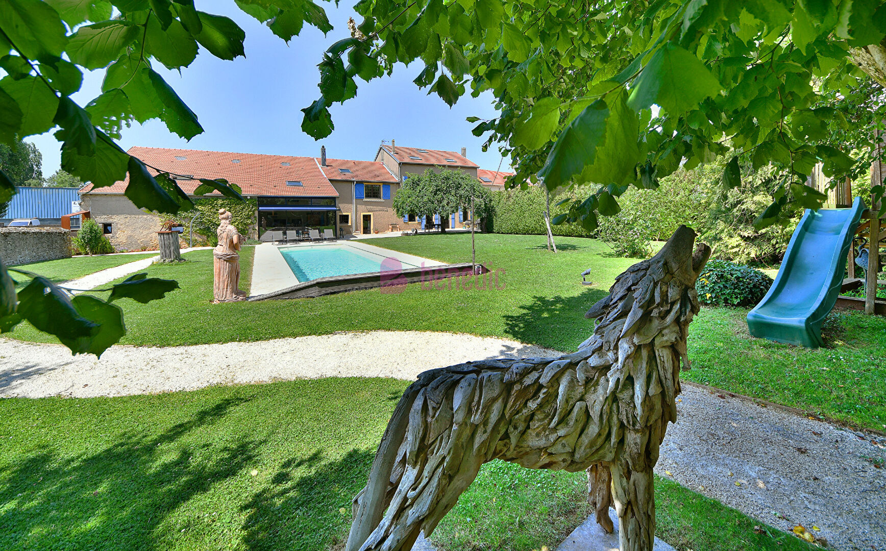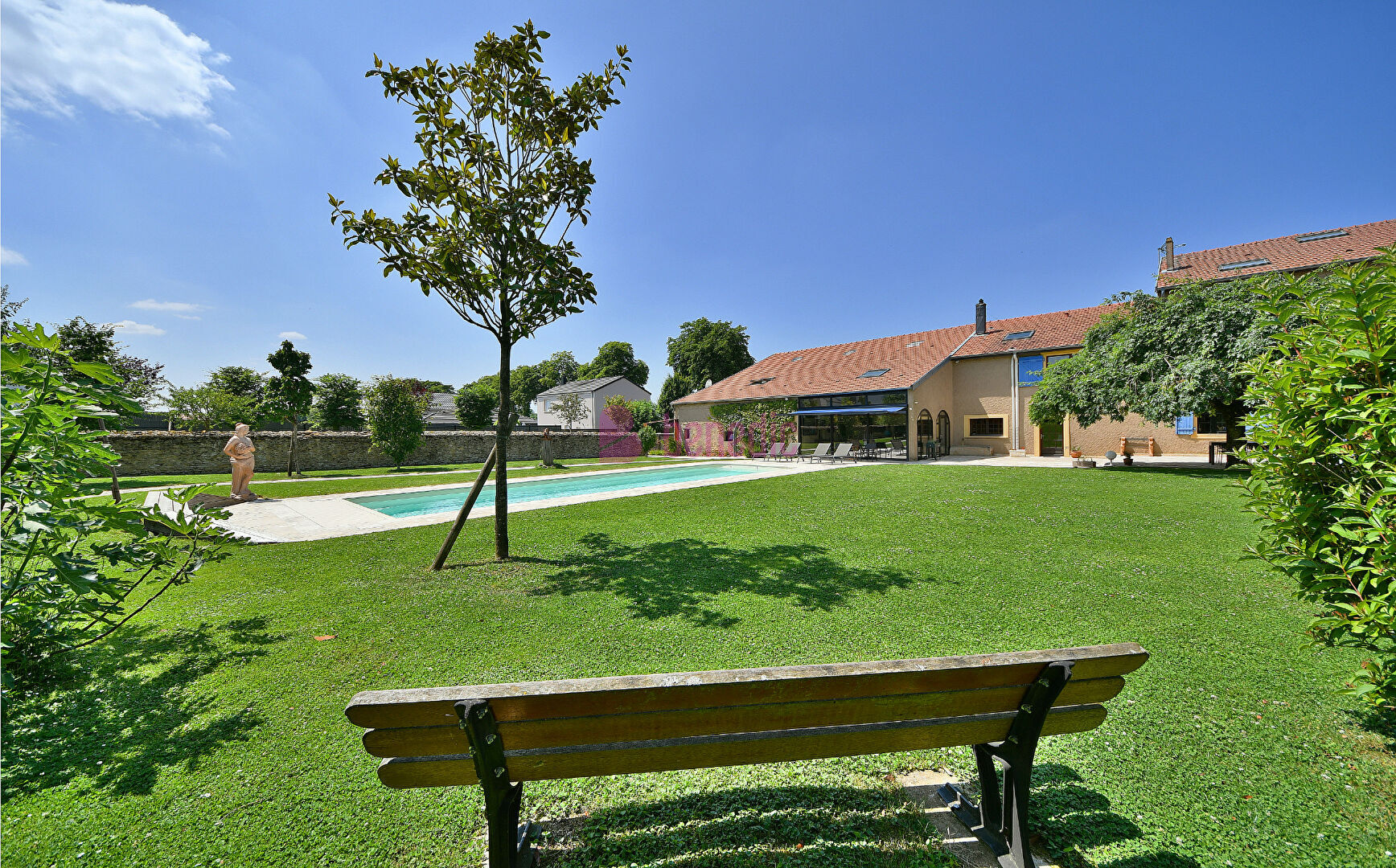 A seulement quelques minutes de Metz et proche du Luxembourg, au coeur du charmant village de Gravelotte, cette propriété d'exception prend place sur un terrain de 24 ares. Ancienne bâtisse entièrement réhabilitée, elle offre 365m² de surface habitable où authenticité et modernité se mêlent harmonieusement. Avec son vaste jardin paysagé, sa piscine et ses nombreuses possibilités d'aménagement, cette demeure s'adresse aux personnes en quête d'un cadre de vie privilégié. Dès l'entrée, un hall spacieux accueille un espace bureau et mène vers une pièce de vie en enfilade composée d'un salon et d'une salle à manger baignés de lumière. Une cuisine séparée aux finitions soignées préserve le charme de l'ancien avec ses éléments en bois et son agencement convivial. Ce niveau dispose également de deux WC, d'une salle d'eau et d'une buanderie fonctionnelle. Amoureux d'équitation, en prolongement, une extension abrite une cuisine d'été donnant accès aux anciennes écuries pouvant accueillir jusqu'à 9 chevaux ainsi qu'à une salle de sport. Cet espace offre un potentiel d'aménagement unique, idéal pour une activité professionnelle ou un projet de réhabilitation sur mesure. A l'étage, la suite parentale bénéficie de sa propre salle de bain avec baignoire et douche. Deux autres chambres se partagent une élégante salle d'eau. Sous les toits, le dernier niveau dévoile une surface mansardée de 100 m², actuellement aménagée en bibliothèque, mais pouvant être repensée selon les envies et les besoins (possibilité de 3 chambres, une salle d'eau et WC). A l'extérieur, le jardin arboré et paysagé offre un cadre verdoyant et intimiste, rythmé par de nombreux espaces de détente. La piscine s'intègre parfaitement dans ce décor naturel, tandis qu'un terrain de pétanque vient compléter ces lieux propices à la convivialité. Une véranda climatisée permet de profiter pleinement de la vue sur le jardin en toute saison, prolongeant ainsi agréablement les espaces de vie. Un appartement indépendant, composé d'un séjour avec vue sur le jardin, d'une cuisine équipée, d'une chambre, une salle d'eau avec WC et d'une mezzanine (pouvant faire chambre ou bureau), vient parfaire ce bien aux multiples atouts. Idéal pour loger des invités en toute autonomie ou envisager un projet locatif. Alliant volumes généreux, cachet et modularité, cette propriété représente une opportunité rare sur le marché. Une demeure où chaque espace a été pensé pour conjuguer confort, élégance et possibilités d'aménagement. Points + : - Cadre idyllique - A 10 minutes de Metz - Volumes et possibilités d'aménagement multiples. - DPE : C - Espaces d'équitation privé Pour plus d'informations, Contactez-moi! Romain (5.26 % honoraires TTC à la charge de l'acquéreur.)