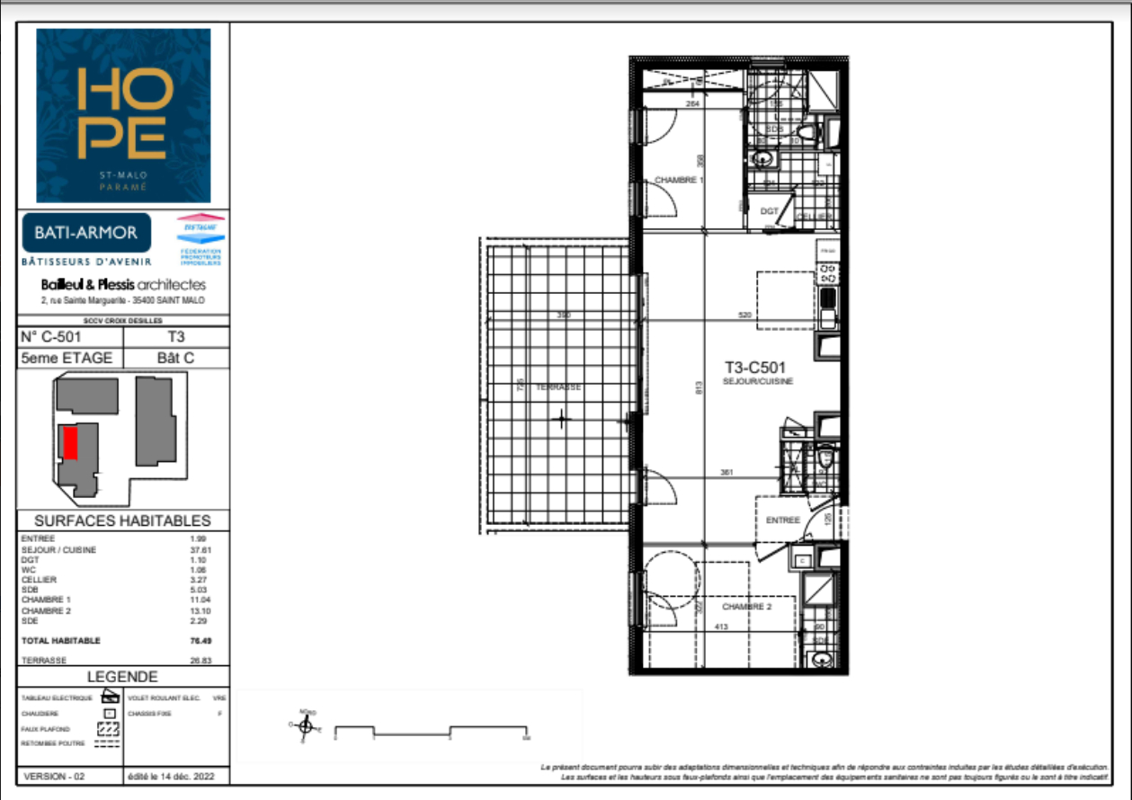 APPARTEMENT NEUF T3 AVEC TERRASSE - QUARTIER PARAME - SAINT MALO - HORS PINEL Côme vous invite à visiter un magnifique appartement T3 de 76.74m², dans un immeuble neuf, situé dans le quartier prisé de Paramé, proche des écoles supérieures et des commerces. Niché au 5ème et dernier étage du bâtiment C, cet appartement offre un cadre de vie moderne et fonctionnel. Il se compose d'une entrée avec placard, d'une pièce de vie lumineuse avec coin cuisine aménagée et semi-équipée donnant sur une terrasse de plus de 25m2, de deux chambres avec chacune sa salle d'eau privative, d'un WC séparé, d'un dégagement avec cellier. Vous disposerez également d'un garage double en sous-sol. Contact direct pour visites et informations : Hortense POCHARD h.pochard@come-immobilier.fr 06 73 55 81 01 REF GES-1723. Les informations sur les risques auxquels ce bien est exposé sont disponibles sur le site Géorisques : www.georisques.gouv.fr.
