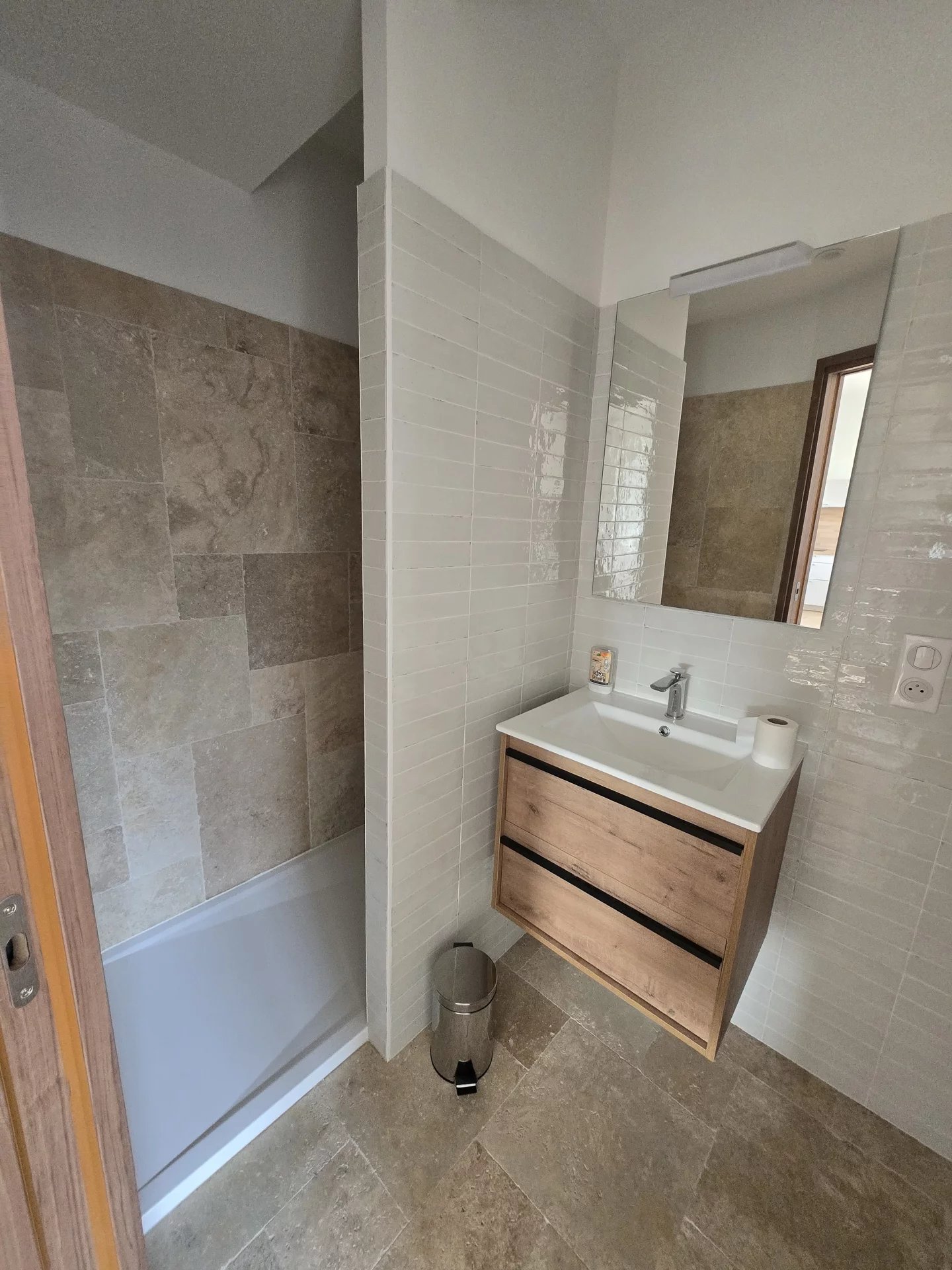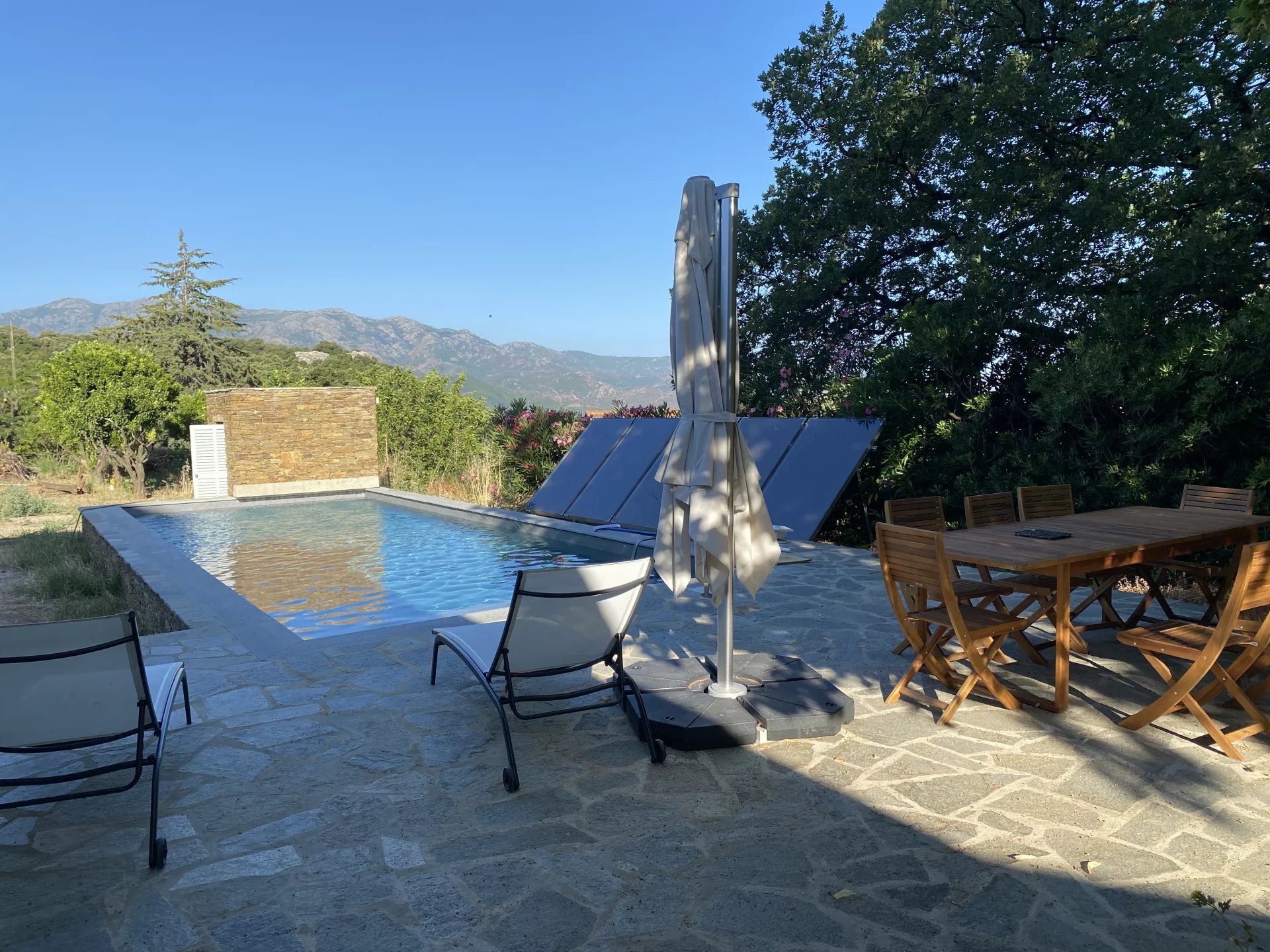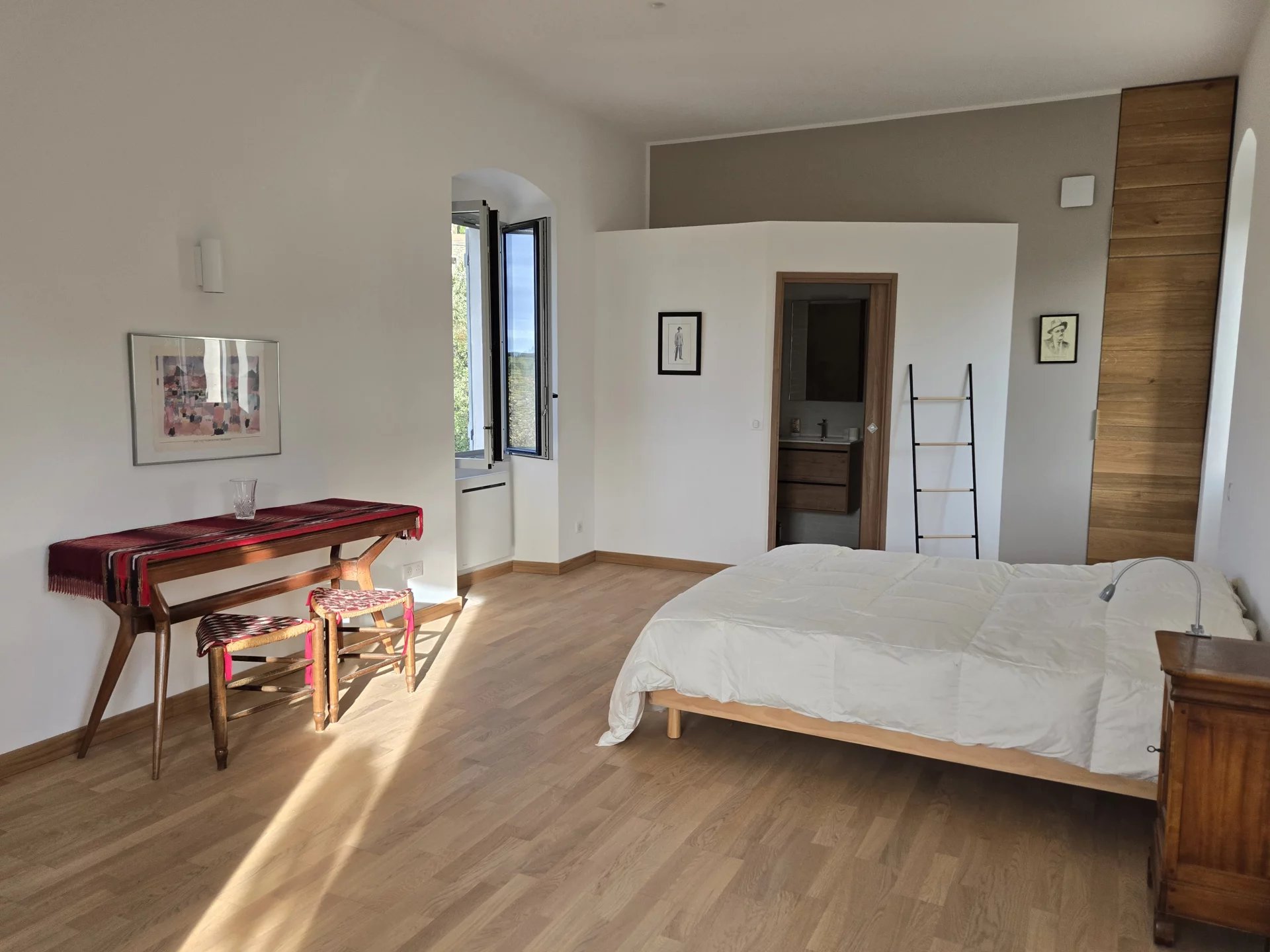 Dans maison de village, un studio avec coin cuisine équipé, terrasse et piscine en commun.