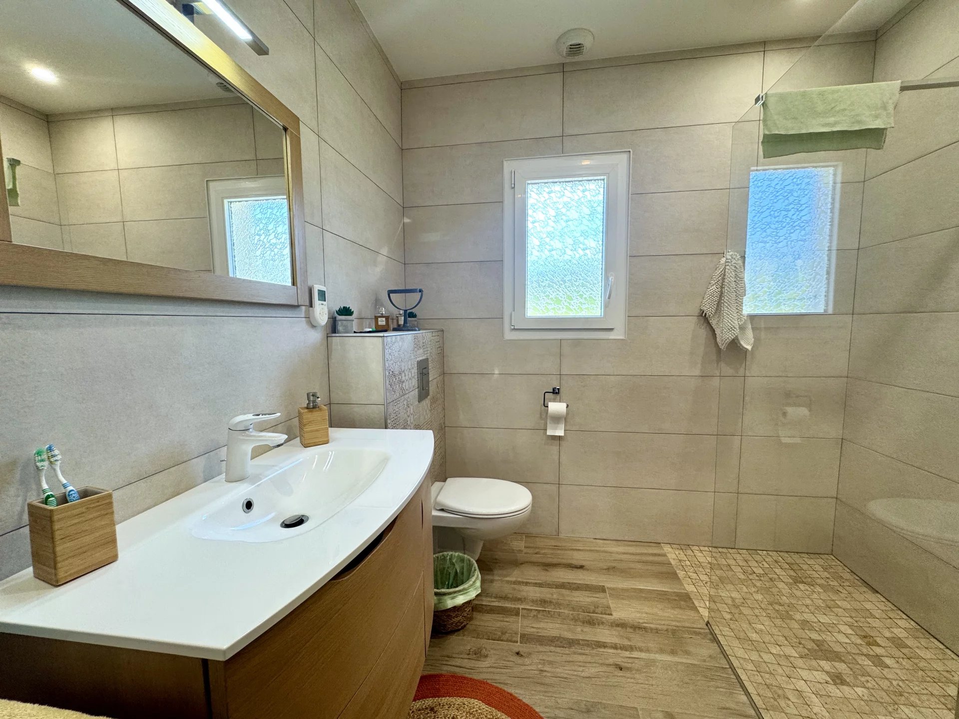 Les abords immédiats de la maison sont entièrement aménagés, assurant un entretien facile et des accès confortables au quotidien, tandis qu'une belle partie du terrain a été conservée en pleine terre, agrémentée d'arbres fruitiers et laissant encore place à différents aménagements.