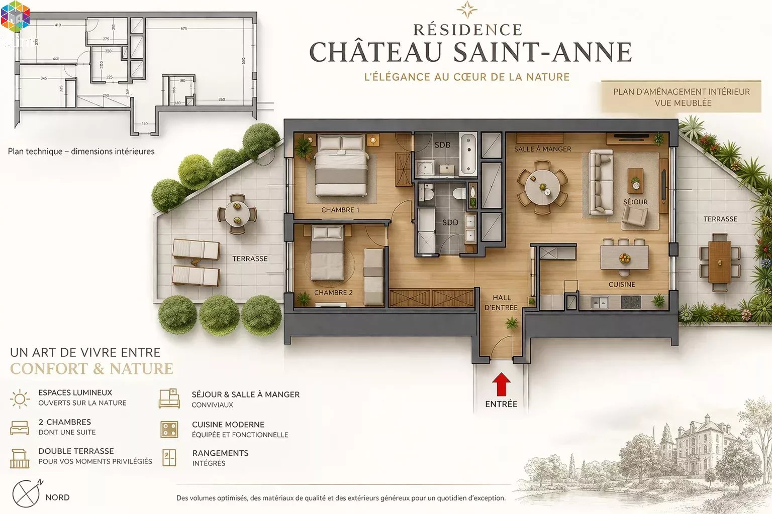 In un residence sicuro e sorvegliato con piscina, campo da tennis e giardini paesaggistici, scoprite questo splendido appartamento traversante di 76 m² al piano terra, arricchito da 38 m² di terrazze. Immerso nel cuore di un parco classificato, offre una tranquillità eccezionale pur essendo a pochi passi dai negozi, dai trasporti pubblici e dal mare. Punti di forza: Appartamento luminoso, in condizioni perfette, senza lavori da prevedere Due camere da letto, ognuna con bagno e servizi privati Cucina moderna completamente attrezzata Doppio garage, ripostiglio e cantina privata Spazi dedicati a moto e biciclette Accesso a piscina, campo da tennis, sala lettura e parcheggi per visitatori Spese condominiali contenute: 230 €/mese, comprensive di riscaldamento centralizzato, acqua calda e manutenzione delle parti comuni. Posizione ideale: a soli 350 metri dal mare e dalla Promenade des Anglais, in un ambiente verde e tranquillo. Un immobile raro e pronto da abitare, ideale come residenza principale, casa vacanze o investimento di prestigio sulla Costa Azzurra.