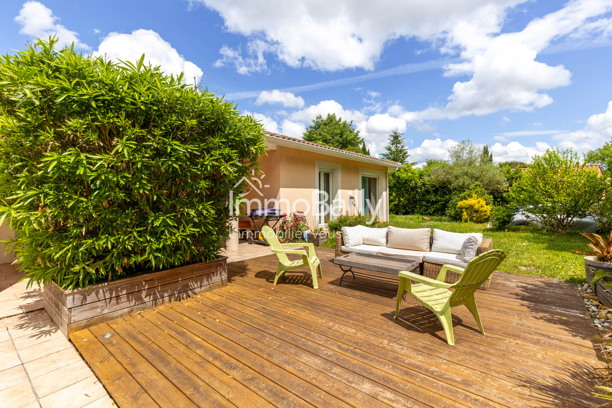 A l'extérieur,vous profiterez d'une grande terrasse couverte et d'une terrasse en bois donnant sur une piscine et jardin sur un terrain de 900 m2. Un bien rare, alliant espace, calme et proximité des commodités !